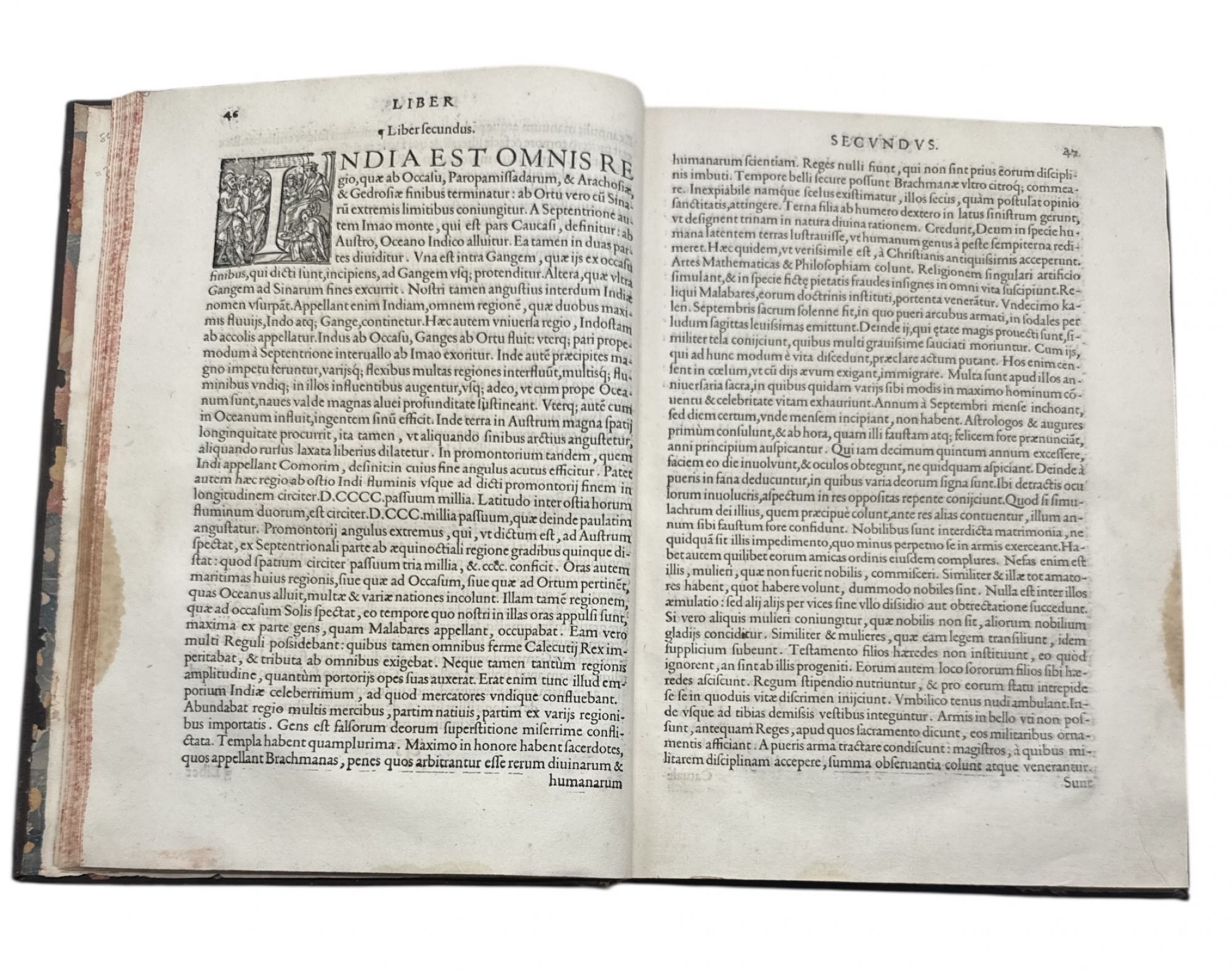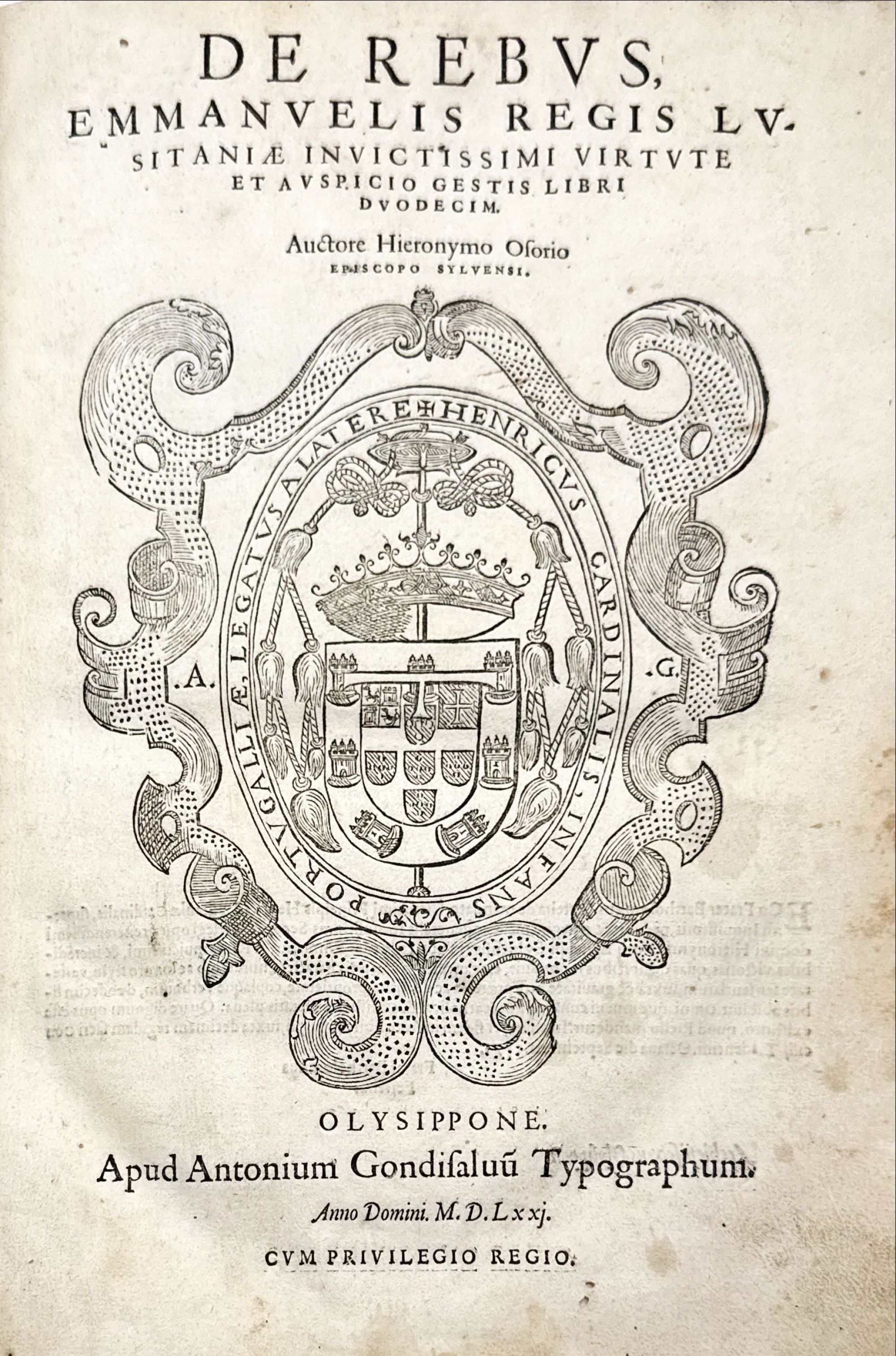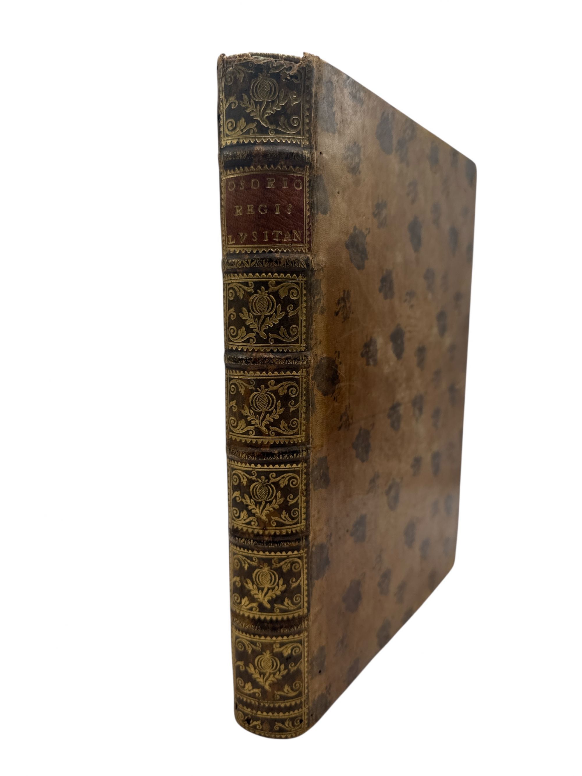 Primeira edição. Rara. Frontispicio com o brasão do Infante D. Henrique, e adornada com belas capitulares xilográficas. Esta obra sobre história de Portugal, contém um relato das primeiras viagens de descobrimento às Índias Orientais e ao Brasil, com informações sobre Cabral, Vasco da Gama e Magalhães, bem como as conquistas de Almeida e Albuquerque. Para além do seu valor histórico, a obra é um belo exemplar da impressão portuguesa do século XVI. Osório foi bispo de Évora e, em 1564, tornou-se bispo de Silves. Exemplar com manchas de humidade na margem exterior de algumas folhas, mas no geral bem conservado. Encadernação em pele marmoreada do século XVIII.