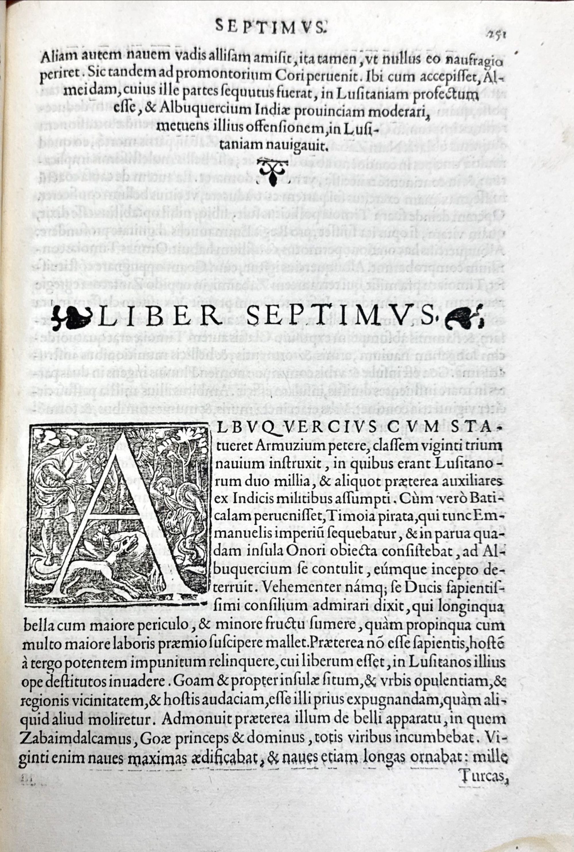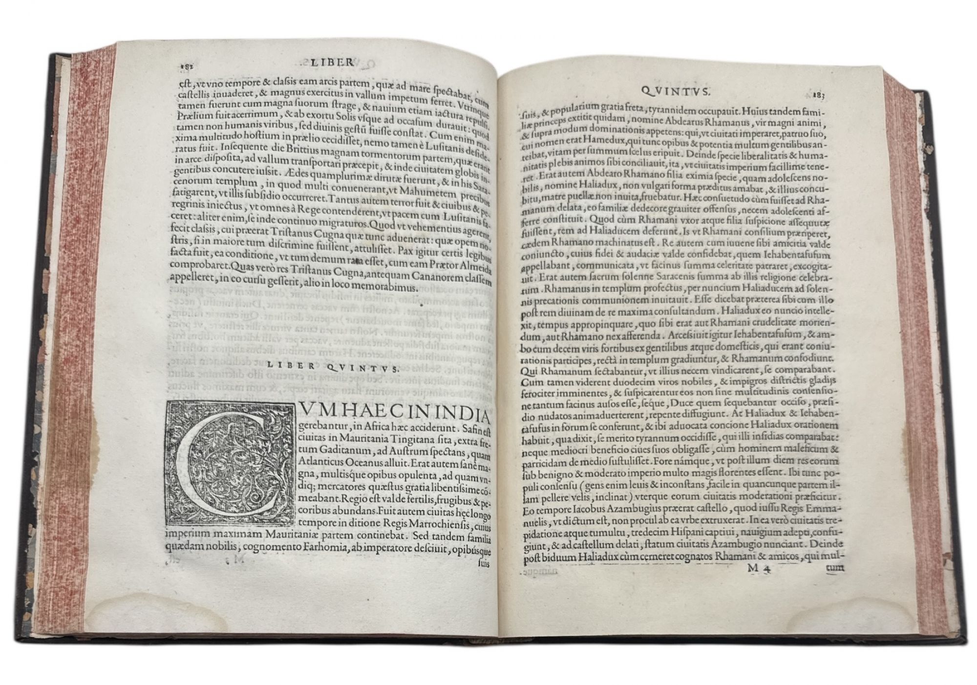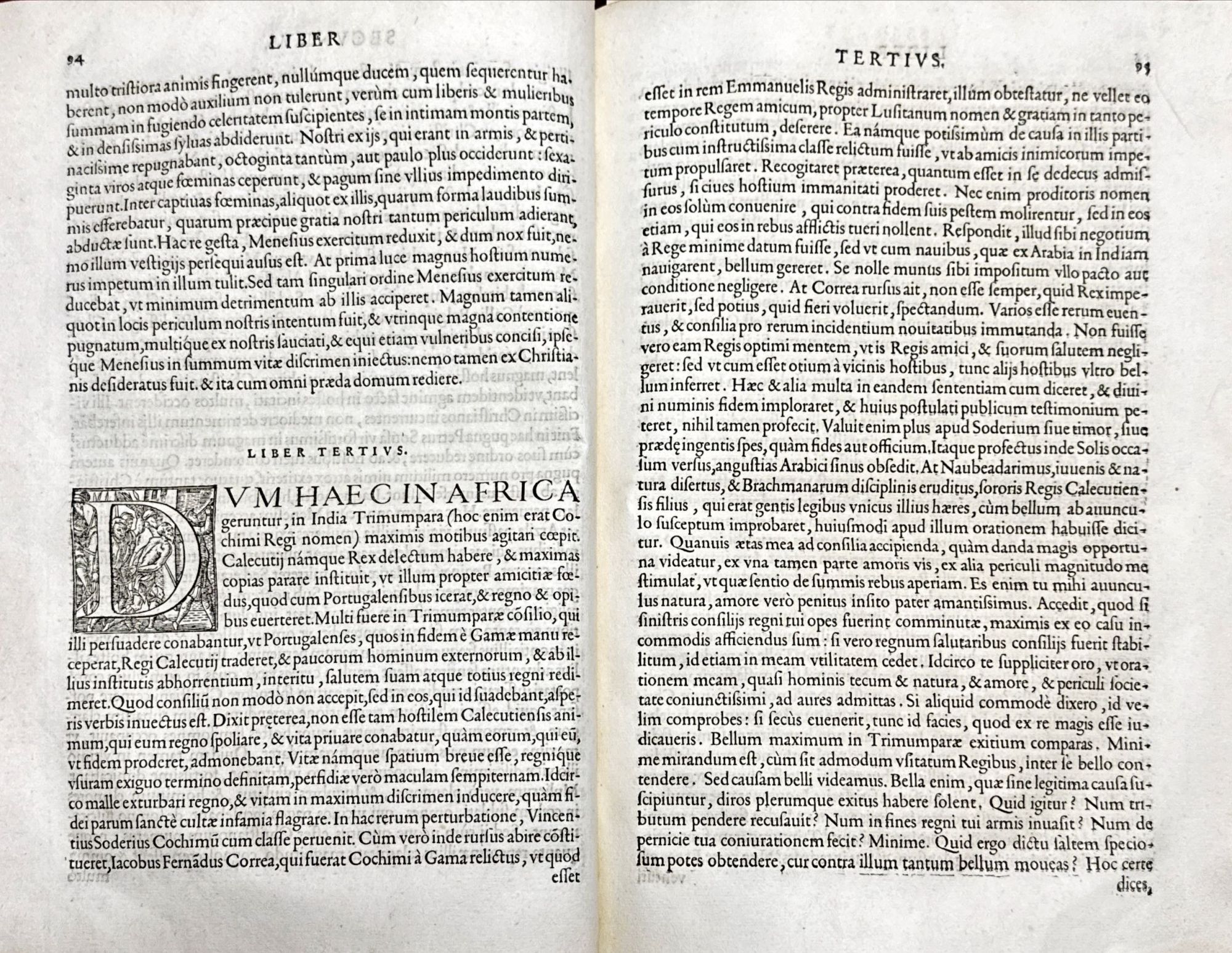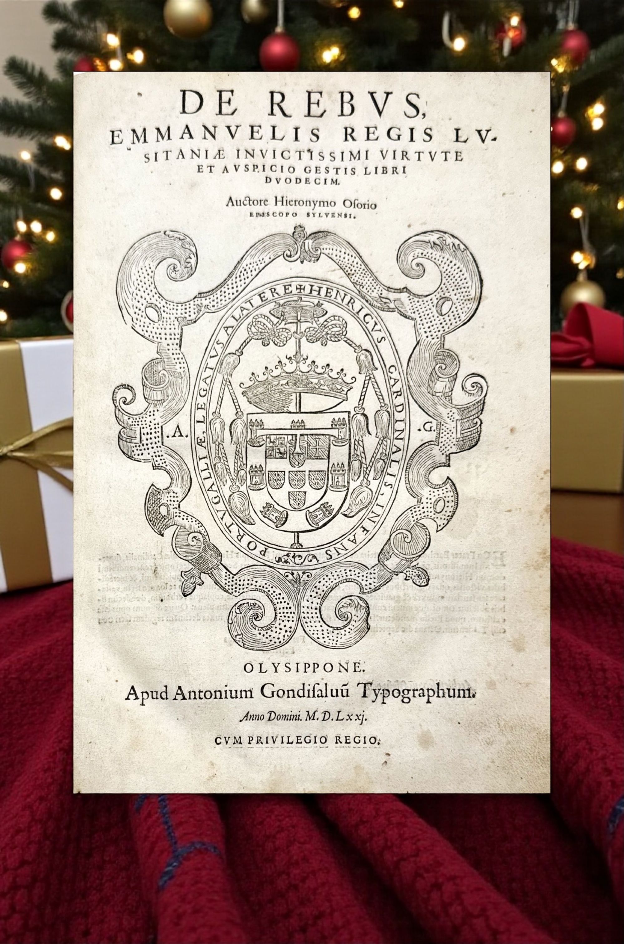 Primeira edição. Rara. Frontispicio com o brasão do Infante D. Henrique, e adornada com belas capitulares xilográficas. Esta obra sobre história de Portugal, contém um relato das primeiras viagens de descobrimento às Índias Orientais e ao Brasil, com informações sobre Cabral, Vasco da Gama e Magalhães, bem como as conquistas de Almeida e Albuquerque. Para além do seu valor histórico, a obra é um belo exemplar da impressão portuguesa do século XVI. Osório foi bispo de Évora e, em 1564, tornou-se bispo de Silves. Exemplar com manchas de humidade na margem exterior de algumas folhas, mas no geral bem conservado. Encadernação em pele marmoreada do século XVIII.