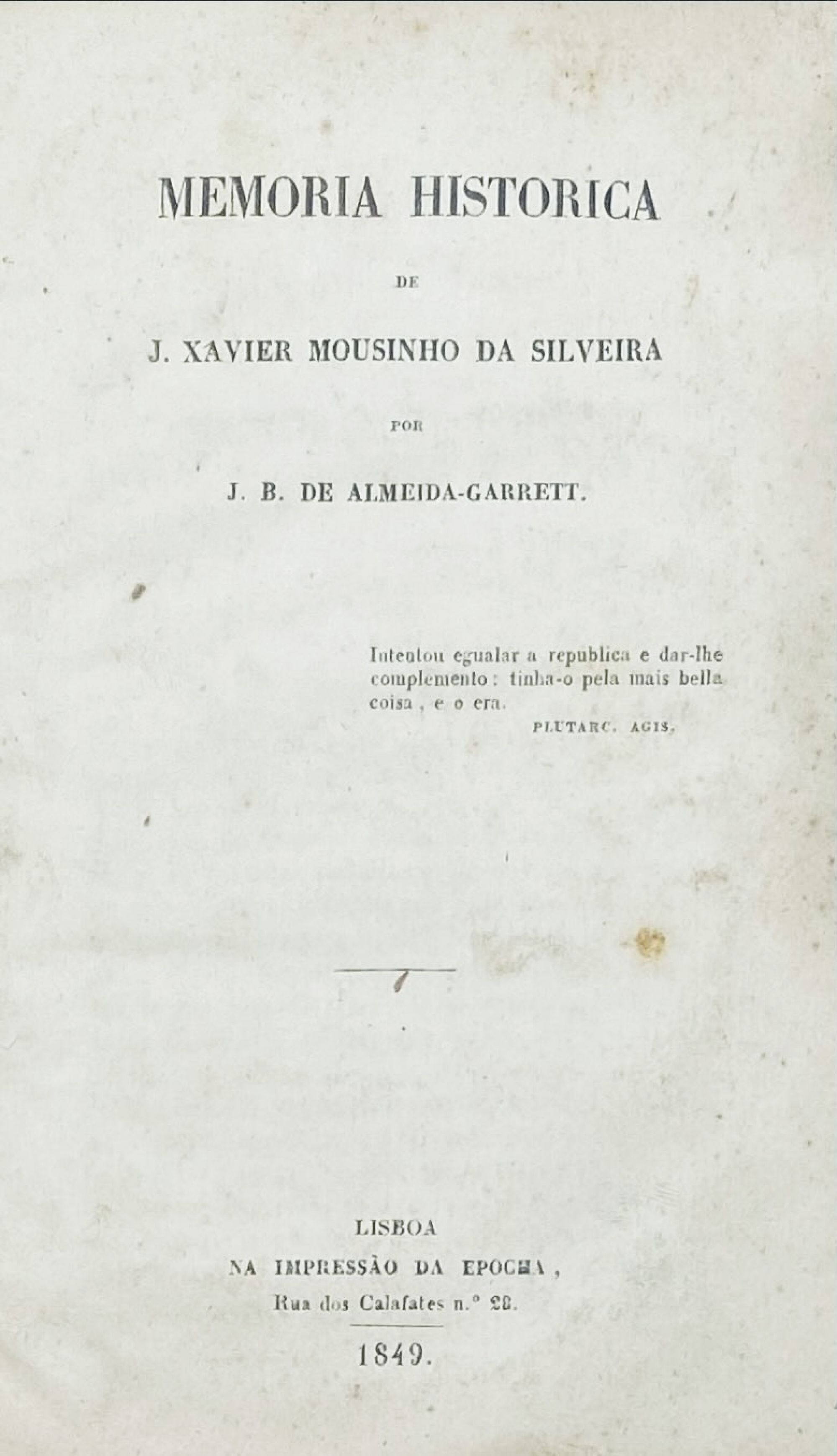 ALMEIDA GARRETT, J. B. de. - MEMORIA HISTORICA DE J. XAVIER MOUSINHO DA SILVEIRA. Lisboa. Na Impressão da Epocha. 1849. In-8º de 24 págs. Enc.