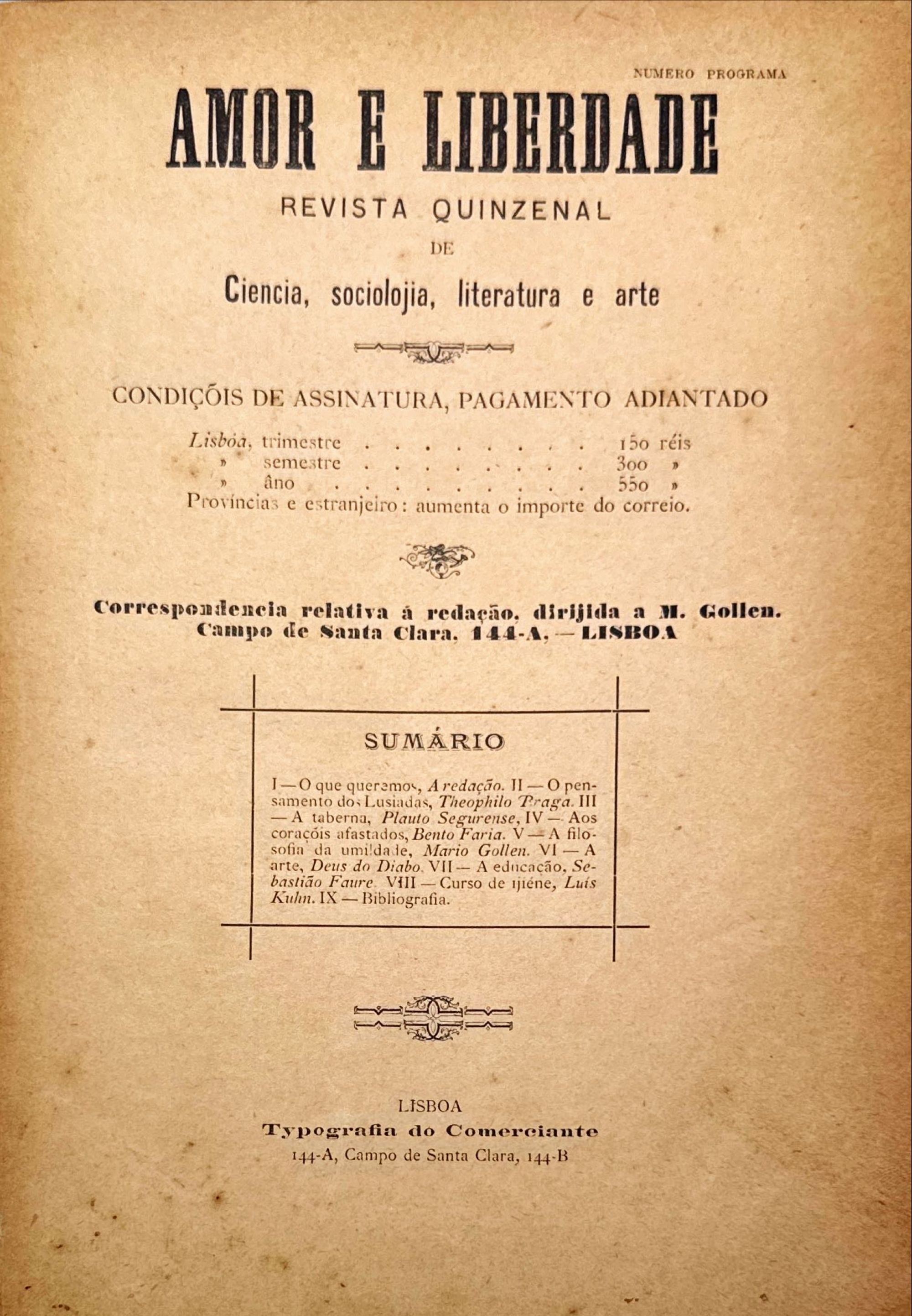 REVISTA - AMOR E LIBERDADE. Revista quinzenal de ciência, sociologia, literatura e arte. Dirigida por M. Gollen 1ª série: Nº1 - 1 de fevereiro de 1904 (ao Nº 8 de 15 de agosto de 1904). 2ª série: Nº1 de 1 de maio de 1905.