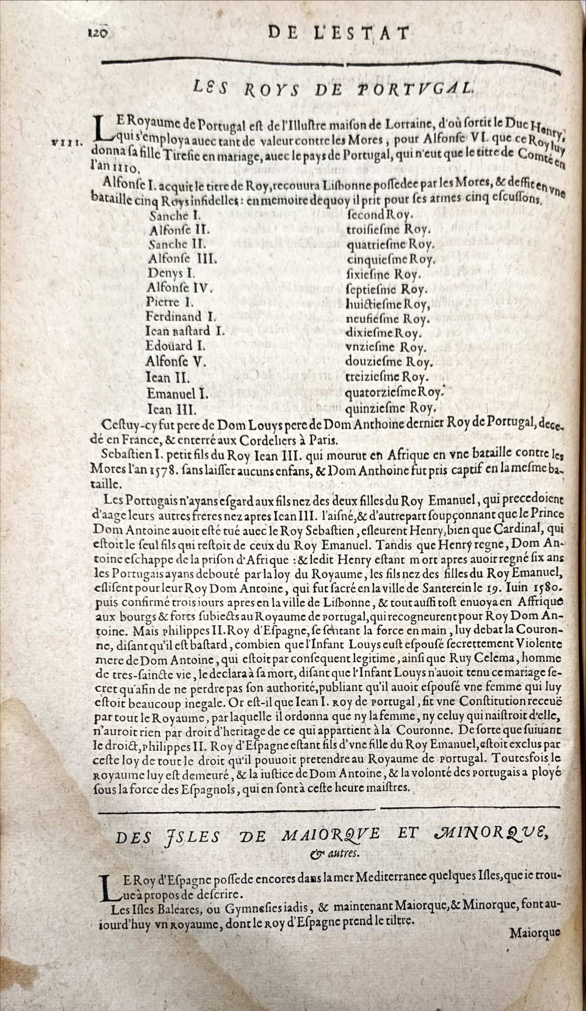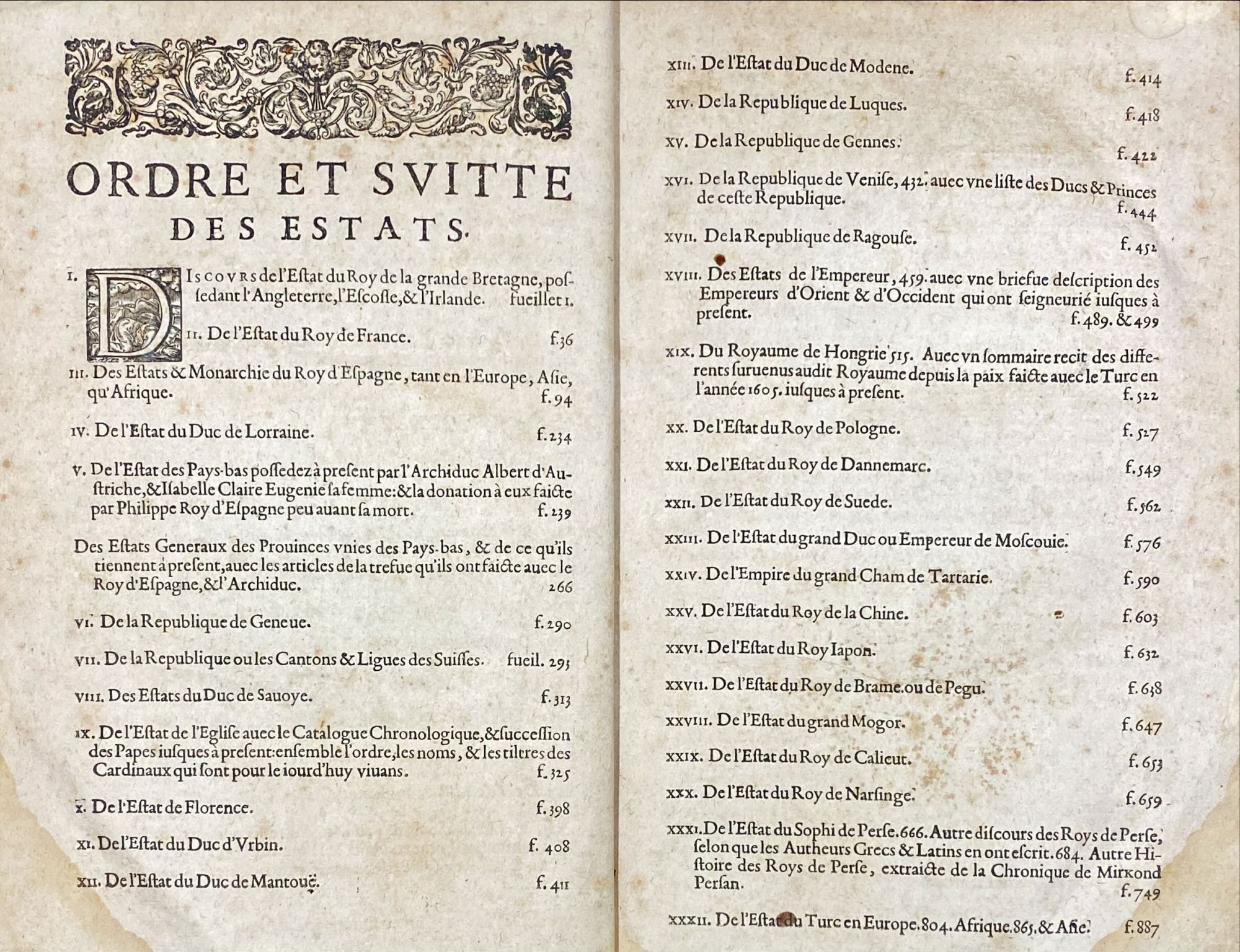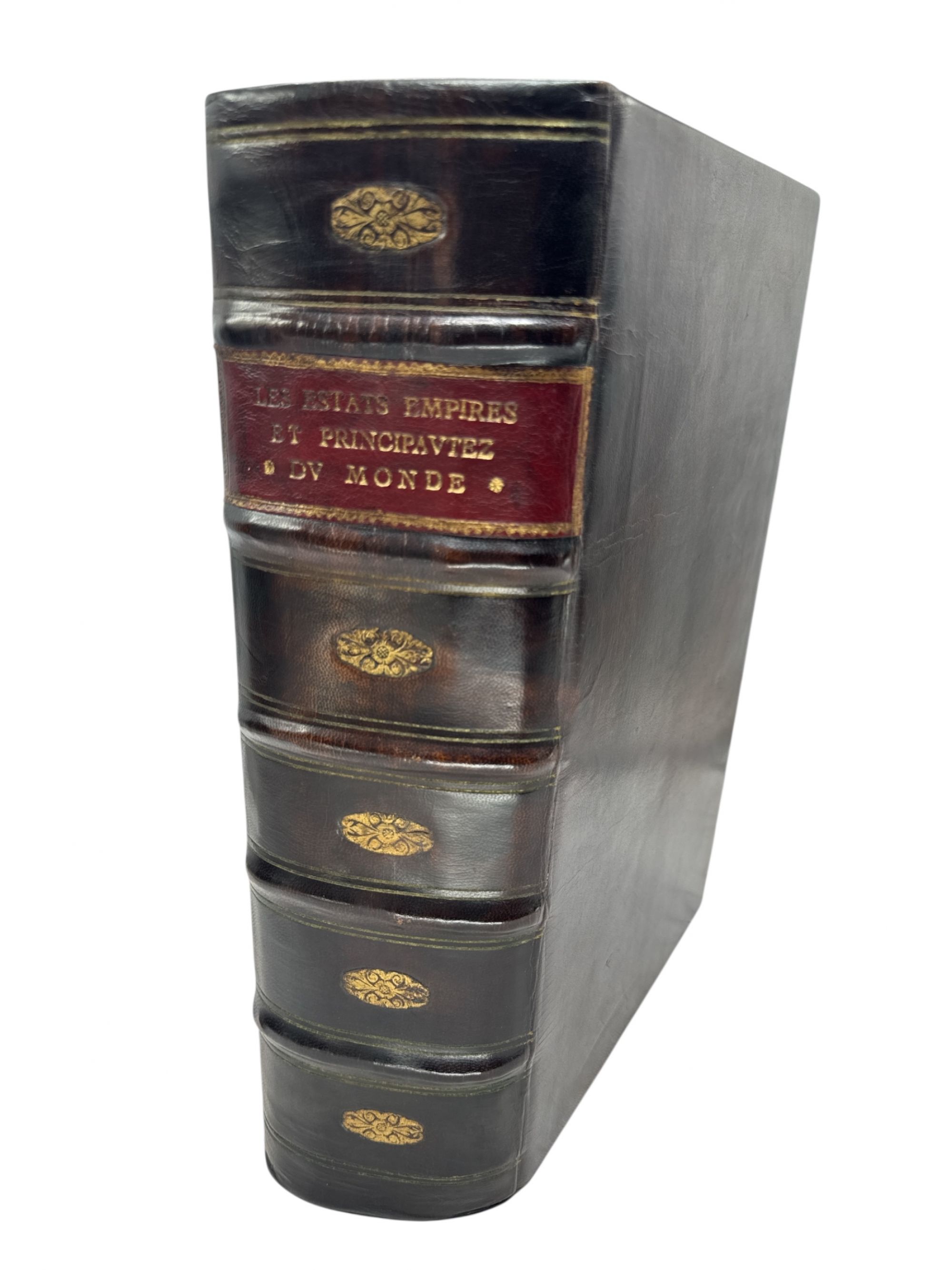 Monumental e lendária obra de geografia, com uma vasta compilação da história dos diferentes estados da Europa, Ásia (Rússia, China , Japão, Birmânia [Pegu], Índia, etc.), Médio Oriente (Pérsia, Império Otomano, etc.), África (Reino do Preste João, Zimbabué-Zâmbia [reino de Monomotapa], Congo, Marrocos), Novo Mundo com a descrição da nova Espanha mas também do Brasil, Flórida, bem como a origem das religiões e ordens militares (Cavaleiros de São Maurício, São João de Jerusalém, do Lírio, Teutônico, Ordem da Montanha das Alegrias, da Pomba etc.). A primeira edição foi publicada em 1614. Antes do início da obra contem 5 folhas com o título "Avant-propos", das quais 4 são fac-similadas. As últimas 204 páginas com o título "Sommaire Chronologie des Papes". Com mancha de água no canto inferior das folhas. Solida encadernação mais recente inteira de pele