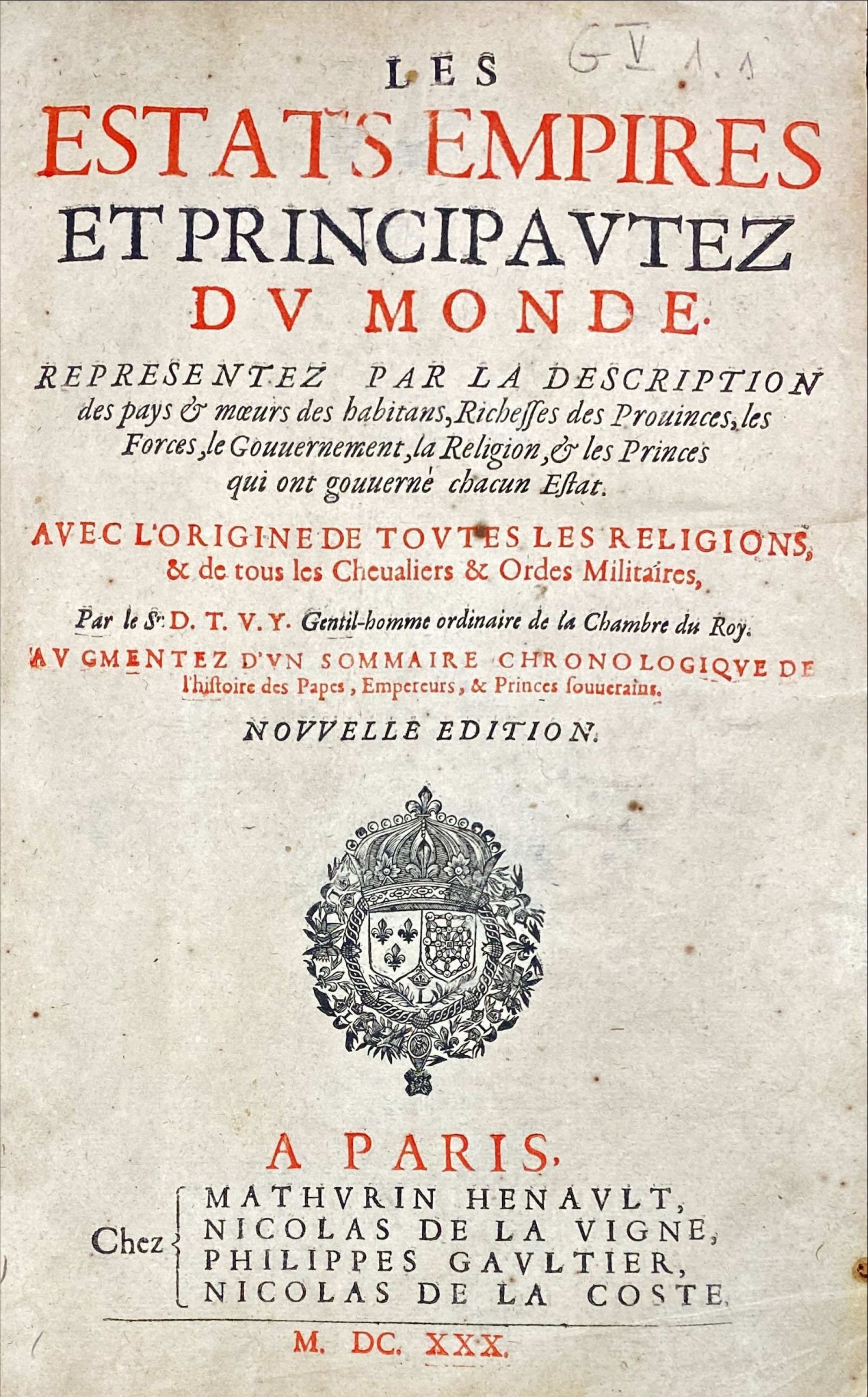 AVITY, Pierre d'. (Davity). - LES ESTATS EMPIRES ET PRINCIPAVTEZ DV MONDE. Representez par la description des paÿs, m urs des habitans, richesses des provinces, les forces, le gouvernement, la religion et les princes qui ont gouverné chacun estat. Auec l'origine de toutes les religions et de tous les cheualiers et ordres militaires.