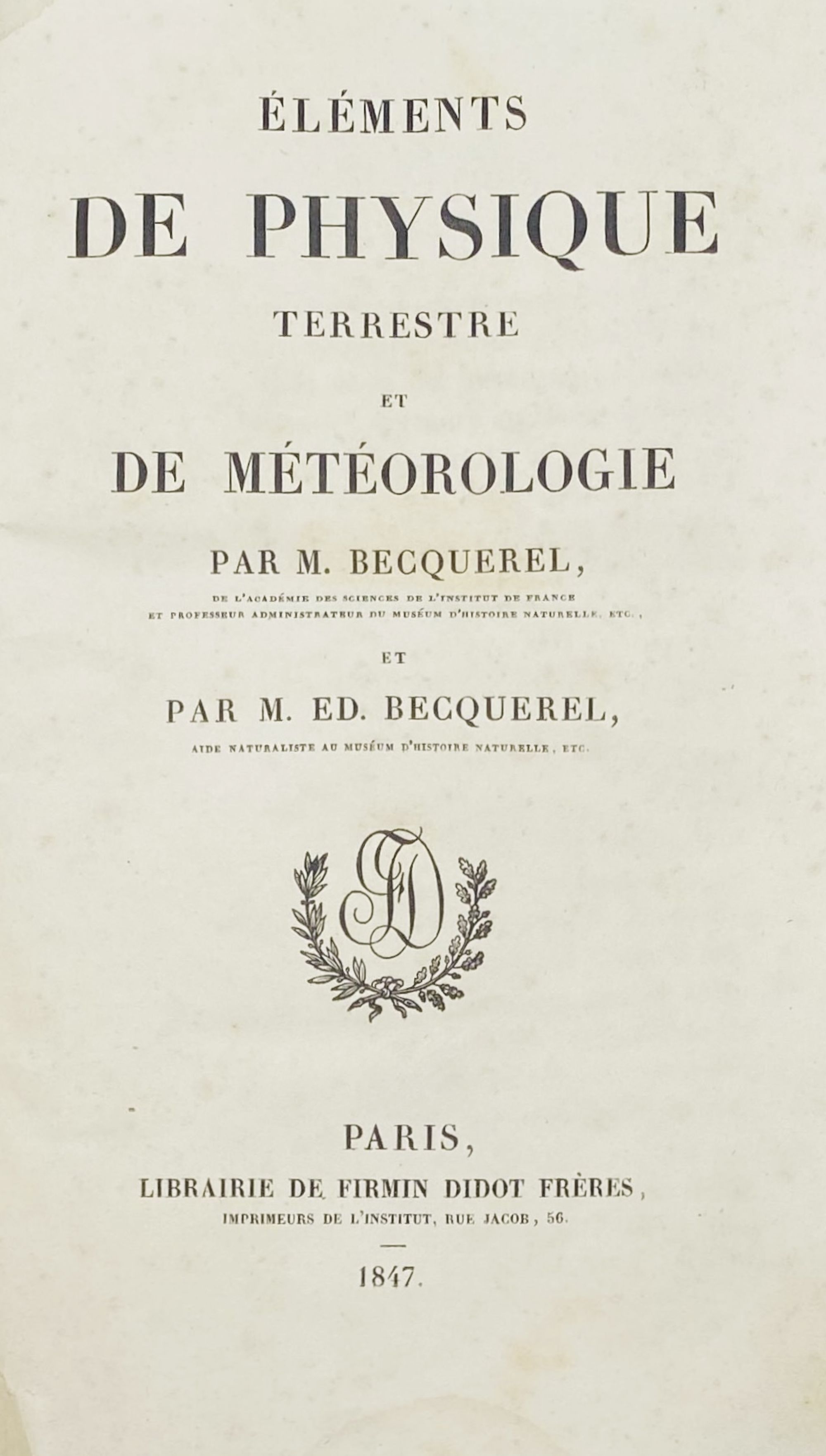 BECQUEREL ET ED. BECQUEREL, M. - ELEMENTS DE PHYSIQUE TERRESTRE ET DE MÈTÈOROLOGIE.
