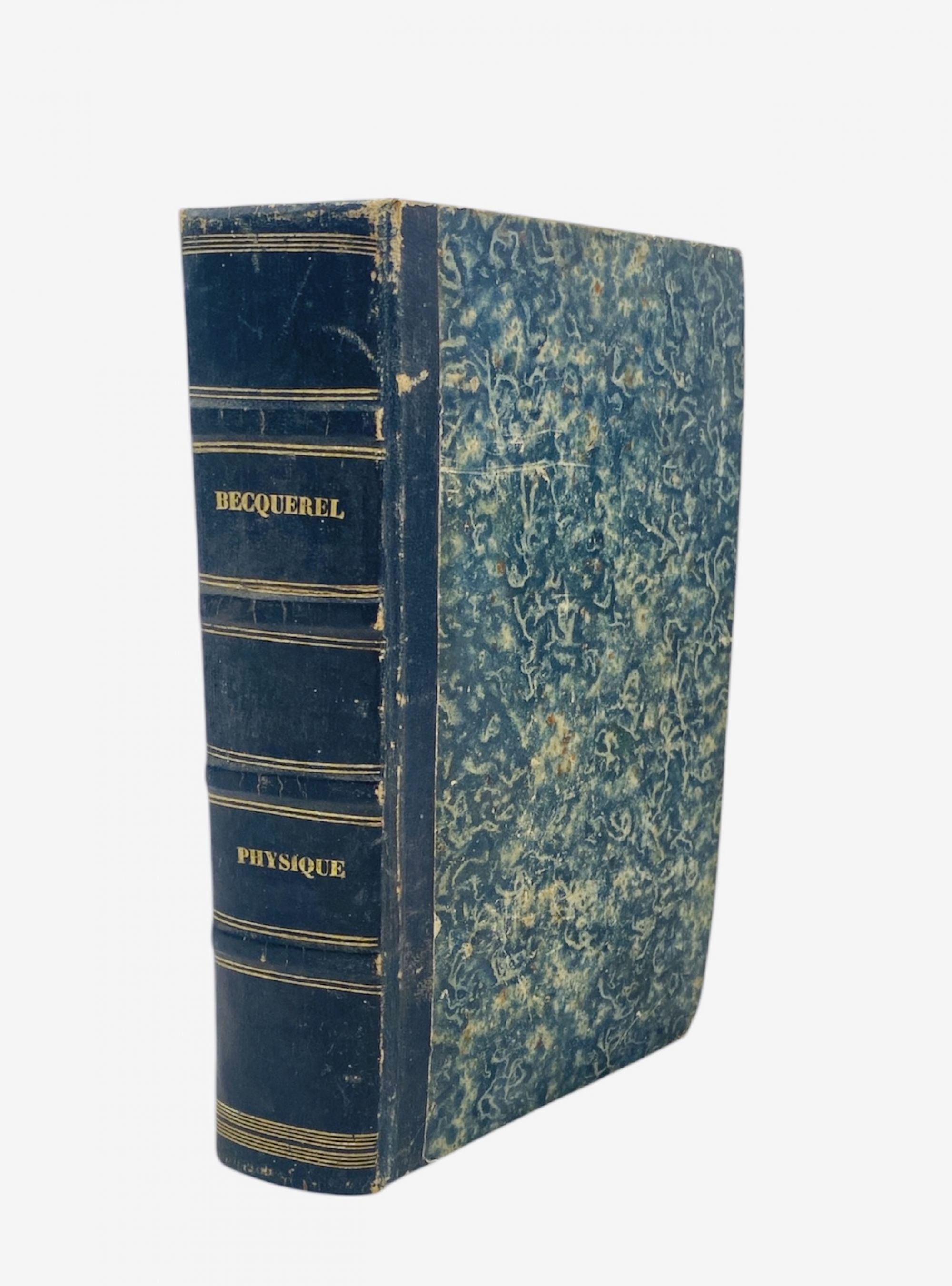 Primeira edição deste manual de física, escrito por Edmond Becquerel e pelo seu filho Antoine, ambos físicos formados na École Polytechnique. Ilustrado com 14 gravuras gravadas por Duclos, Adam e Legrand no final e em folha desdobrável. Anterrosto e rosto com falta de pedaço de papel na margem. Encadernação meia de pele
