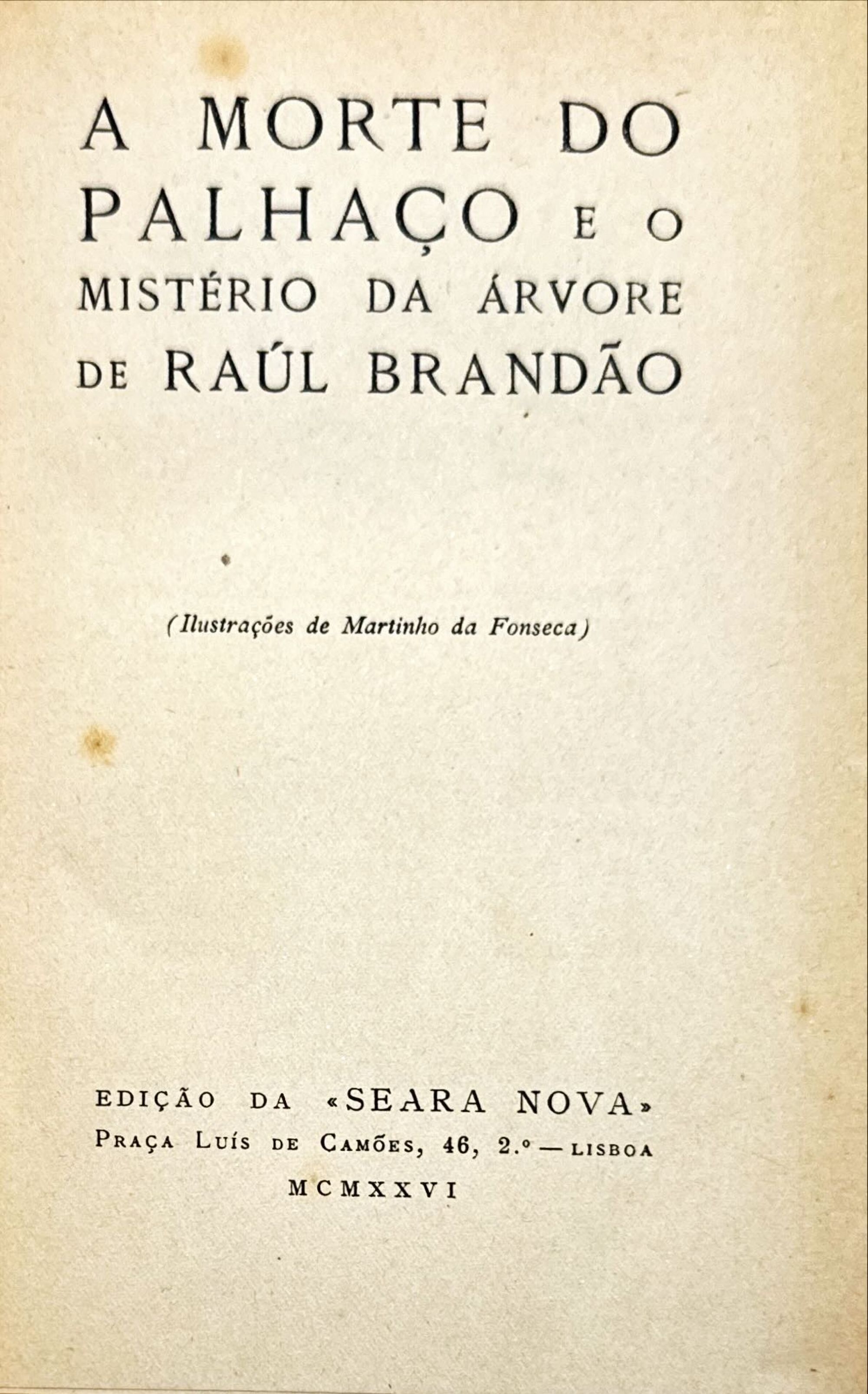 BRANDÃO, Raul. - A MORTE DO PALHAÇO E O MISTÉRIO DA ÁRVORE. (Ilustrações de Martinho da Fonseca). Lisboa. Edição da "Seara Nova". 1926. In-8º de 287, [4] págs. Enc.
