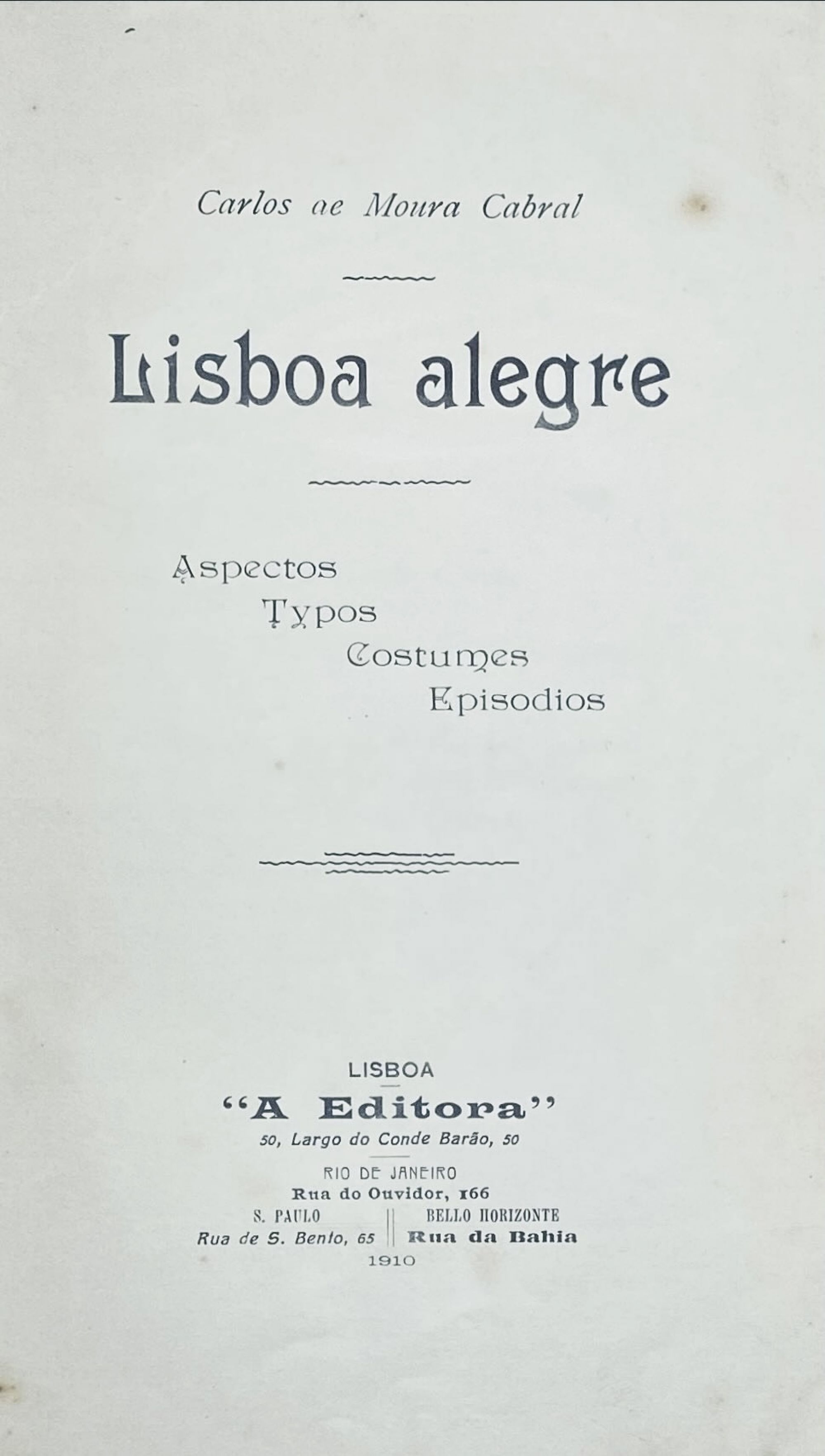 CABRAL, Carlos de Moura. - LISBOA ALEGRE. Aspectos. Typos. Cosutmes. Episodios. Lisboa. A Editora Limitada. 1910. In-8º de 193 págs. Enc.
