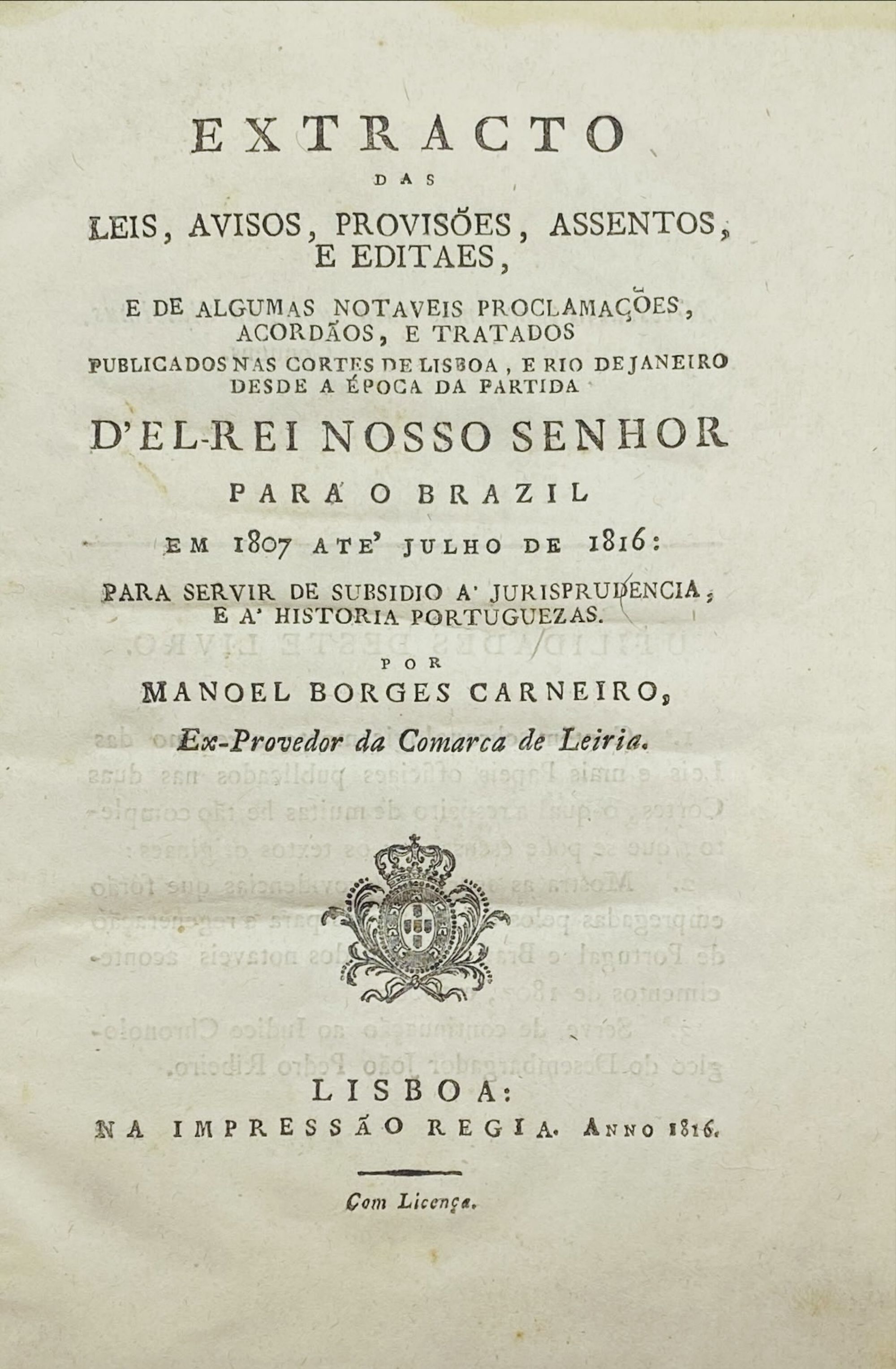 CARNEIRO, Manuel Borges. - EXTRACTO DAS LEIS, AVISOS, PROVISÕES, ASSENTOS, E EDITAES, e de algumas notáveis proclamações, acordãos e tratados publicados nas cortes de Lisboa e Rio de Janeiro desde a época da partida d'El-Rei Nosso Senhor para o brasil em 1807 até Julho de 1816, para servir de subsídio a jurisprudência e a história portuguesa.