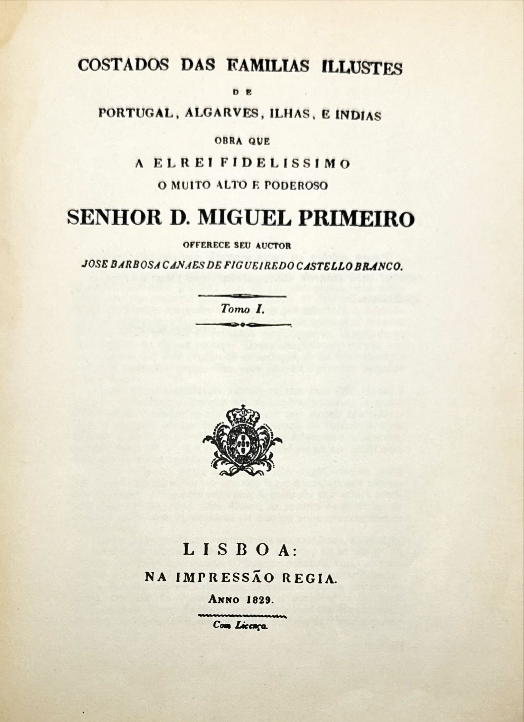 CASTELLO BRANCO, José Barbosa Canaes de Figueiredo. - COSTADOS DAS FAMILIAS ILUSTRES DE PORTUGAL, ALGARVES, ILHAS, E INDIAS. Obra que a El-Rei Fidelíssimo o muito poderoso Senhor D. Miguel Primeiro offerece seu auctor. Tomo I (e II).