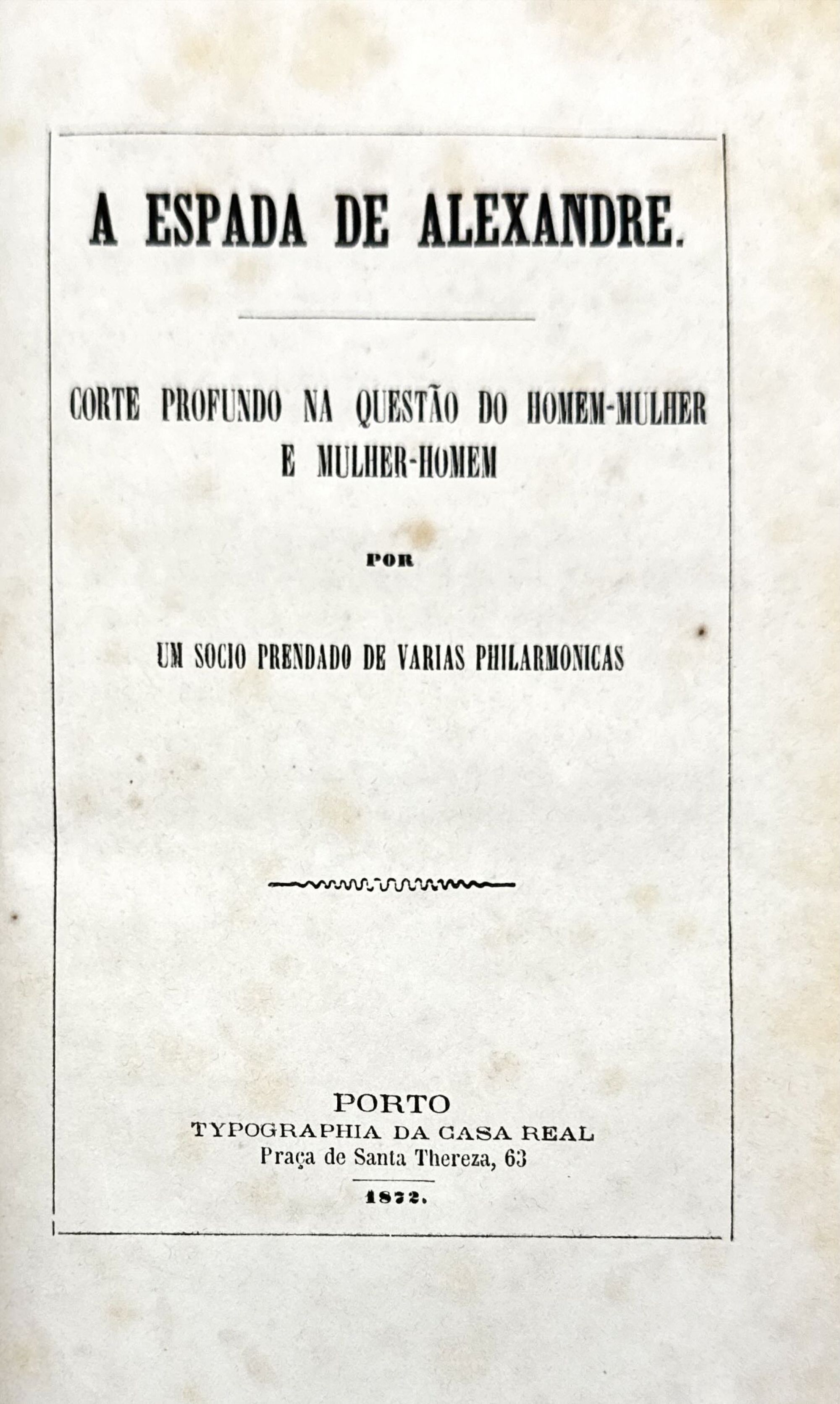 A ESPADA DE ALEXANDRE. Corte profundo na questão do homem-mulher e mulher-homem. Um socio prendado de varias philarmonicas. Porto. Typographia da Casa Real. 1872. In-8º de 50 págs. As 2 obras. In-8º. Encs em 1.