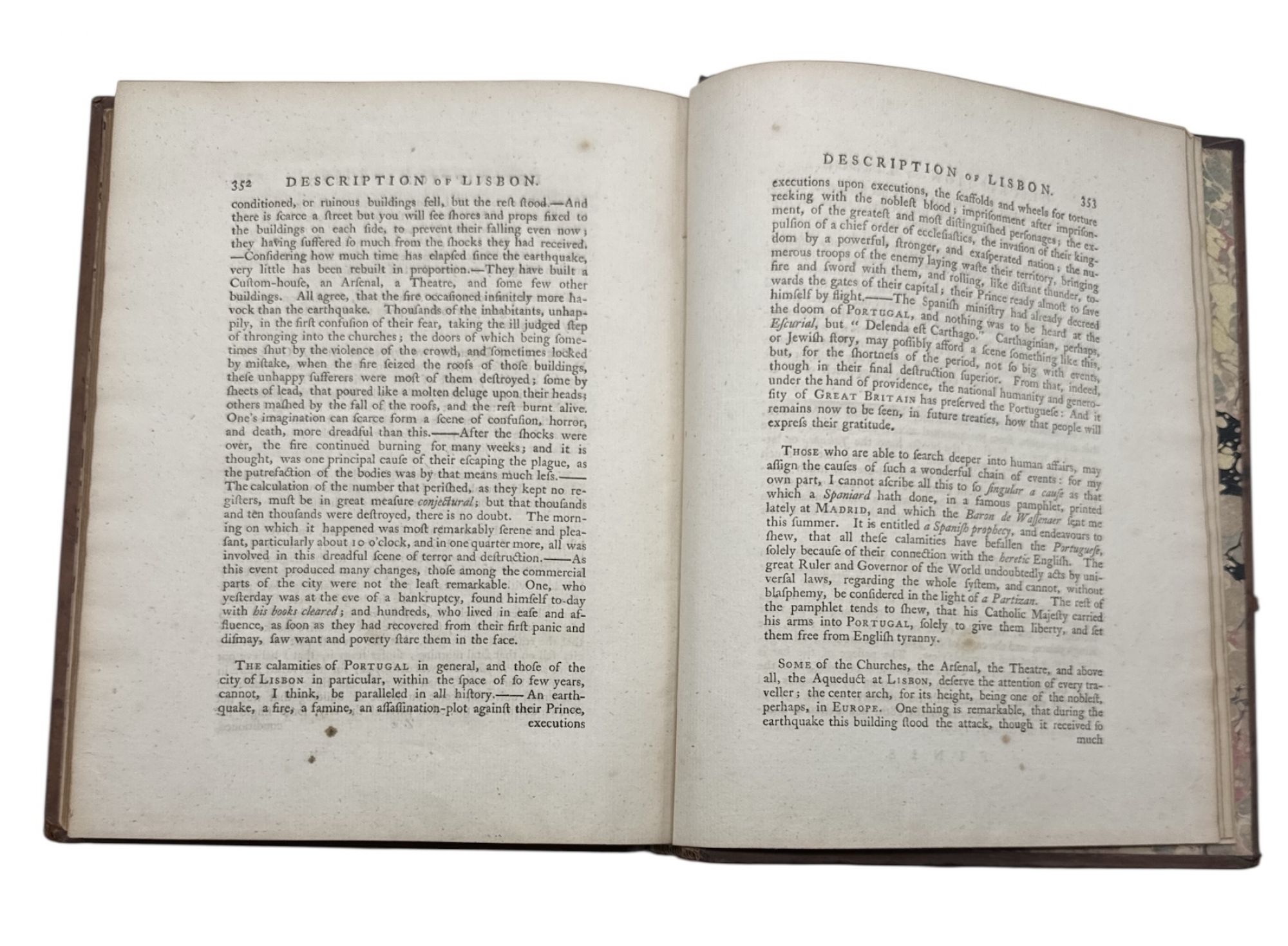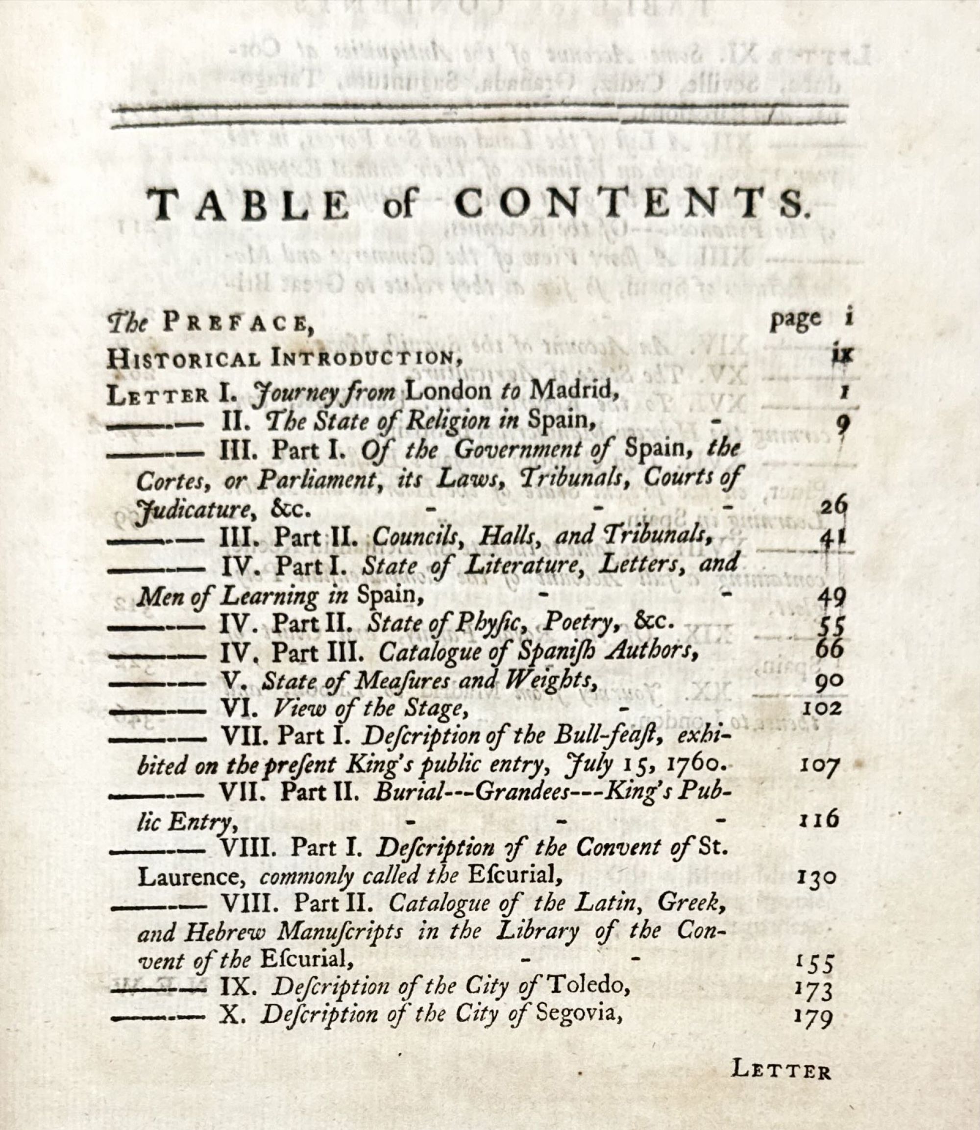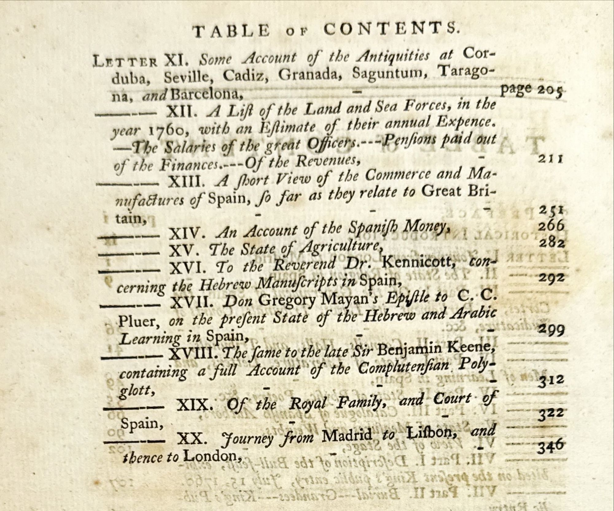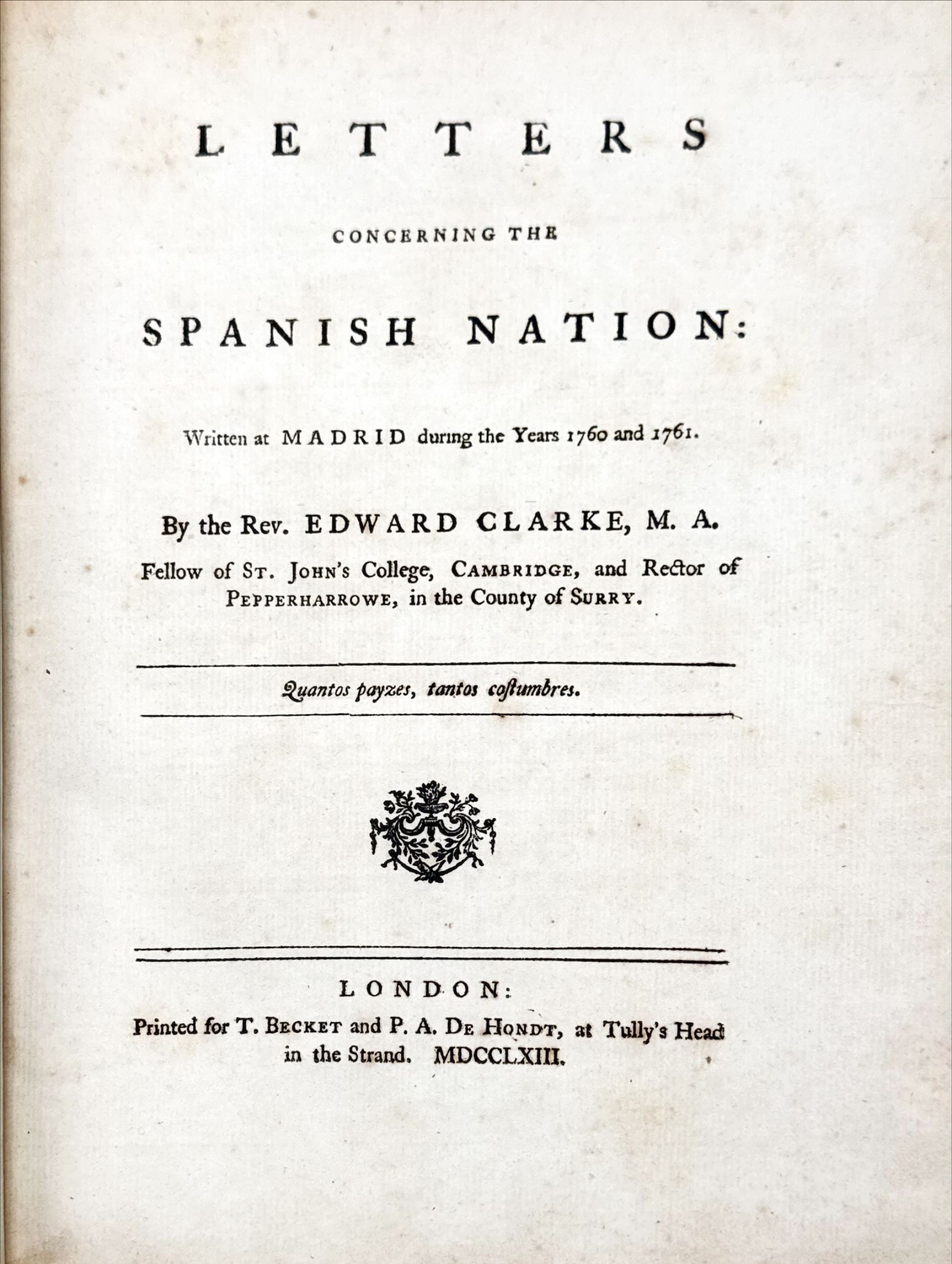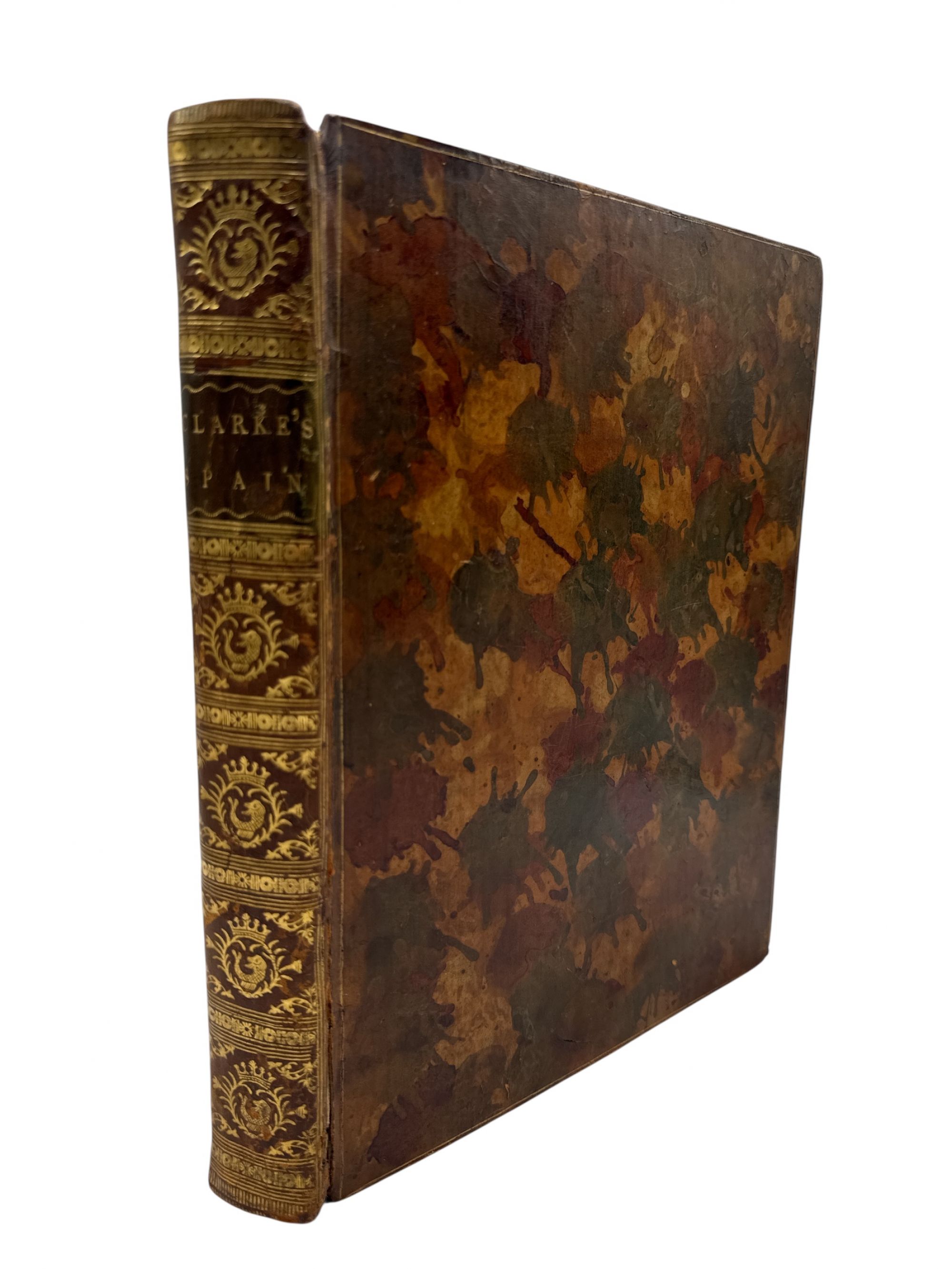 Primeira edição deste relato contemporâneo sobre a vida na corte real espanhola na época. O reverendo Edward Clarke realizou esta viagem durante o período tumultuoso da Guerra dos Sete Anos, que antecedeu a invasão espanhola de Portugal em 1762. Esta obra apresenta uma breve introdução histórica antes de abordar a própria viagem de Clarke de Londres a Madrid, a religião em Espanha, a sua literatura, ciência, educação e desporto. Inclui ainda um catálogo dos manuscritos em latim, grego e hebraico da Biblioteca do Convento do Escurial, bem como descrições topográficas de Toledo e Segóvia. Em Espanha e França, esta obra foi retirada de circulação devido às críticas de Clarke a Luís XV e às suas considerações sobre Carlos III. Também fala mal de Espanha logo na introdução, relatando a apreensão da sua bagagem pela Inquisição. Encadernação da época em pele marmoreada com ferros a ouro na lombada e pastas.
