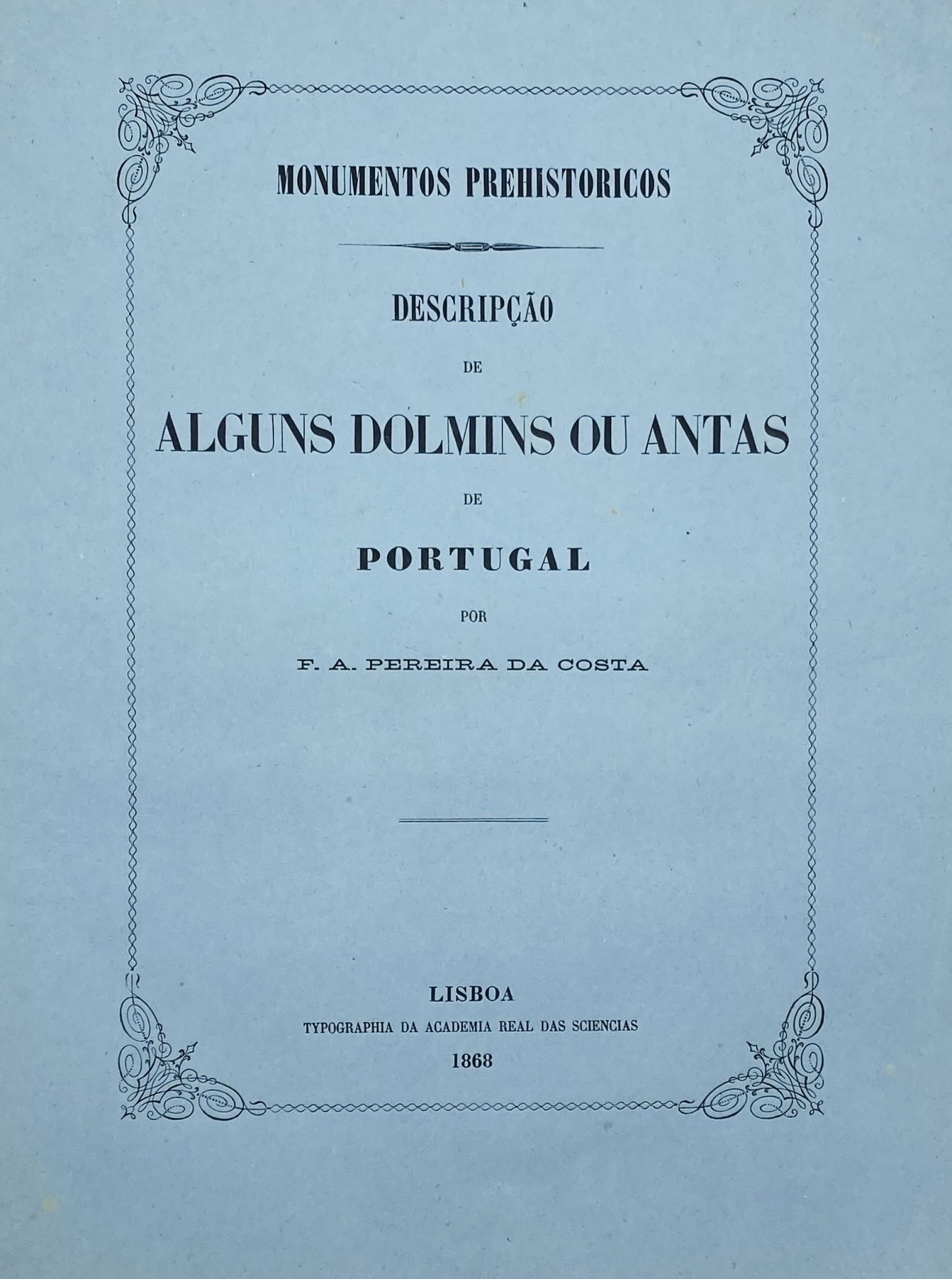 COSTA, F.A. Pereira da. - NOÇOES SOBRE O ESTADO PREHISTORICO DA TERRA E DO HOMEM seguidas da Descripçao de alguns dolmins ou antas de Portugal. Lisboa. Typographia da Academia real das Sciencias. 1868. In-4º de 97 págs. Br.