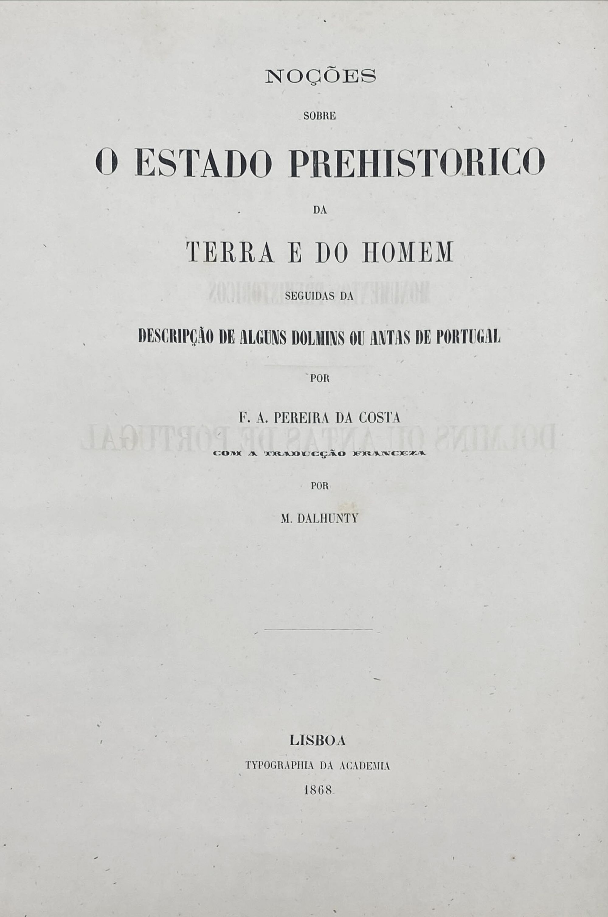 COSTA, F.A. Pereira da. - NOÇOES SOBRE O ESTADO PREHISTORICO DA TERRA E DO HOMEM seguidas da Descripçao de alguns dolmins ou antas de Portugal.