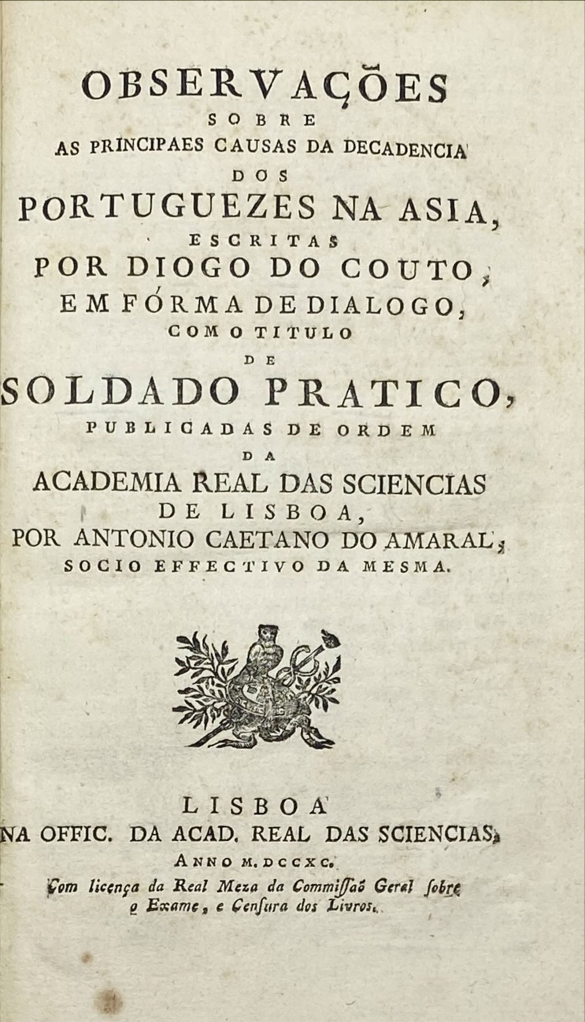 COUTO, Diogo do. - OBSERVAÇÕES SOBRE AS PRINCIPAES CAUSAS DA DECADENCIA DOS PORTUGUEZES NA ASIA, ESCRITAS POR DIOGO DO COUTO, em fórma de dialogo, com o titulo de soldado pratico, publicadas de ordem da academia real das sciencias. Por Antonio Caetano do Amaral. Lisboa. Na Offic. da Acad. Real das Sciencias. 1790. In-8º de XIV, [2], 161, 110 págs. Enc.
