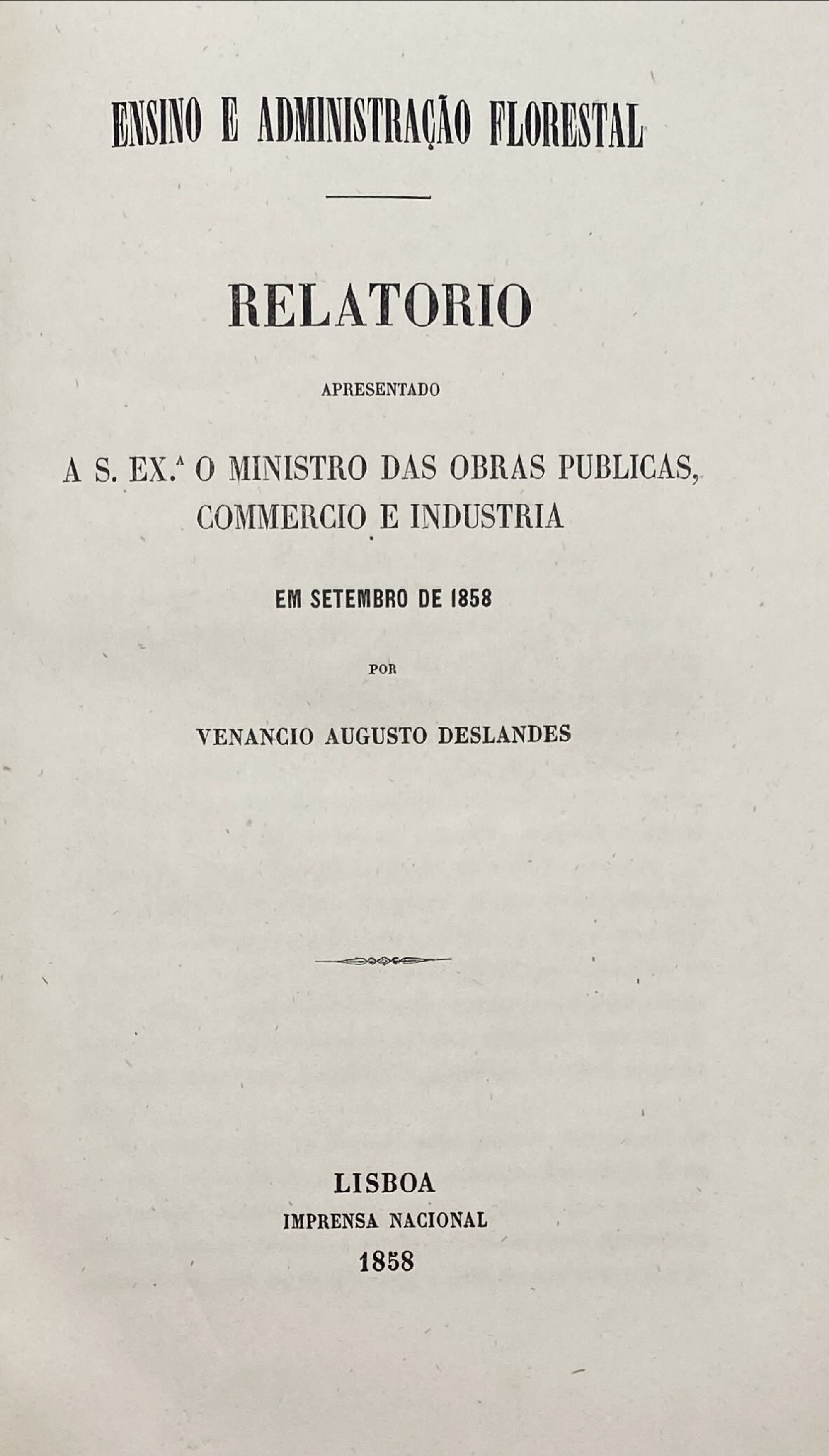 DESLANDES, Venâncio Augusto. - ENSINO E ADMINISTRAÇÃO FLORESTAL. Relatório apresentado ao Ministro das obras publicas, commercio e industria em setembro de 1858.