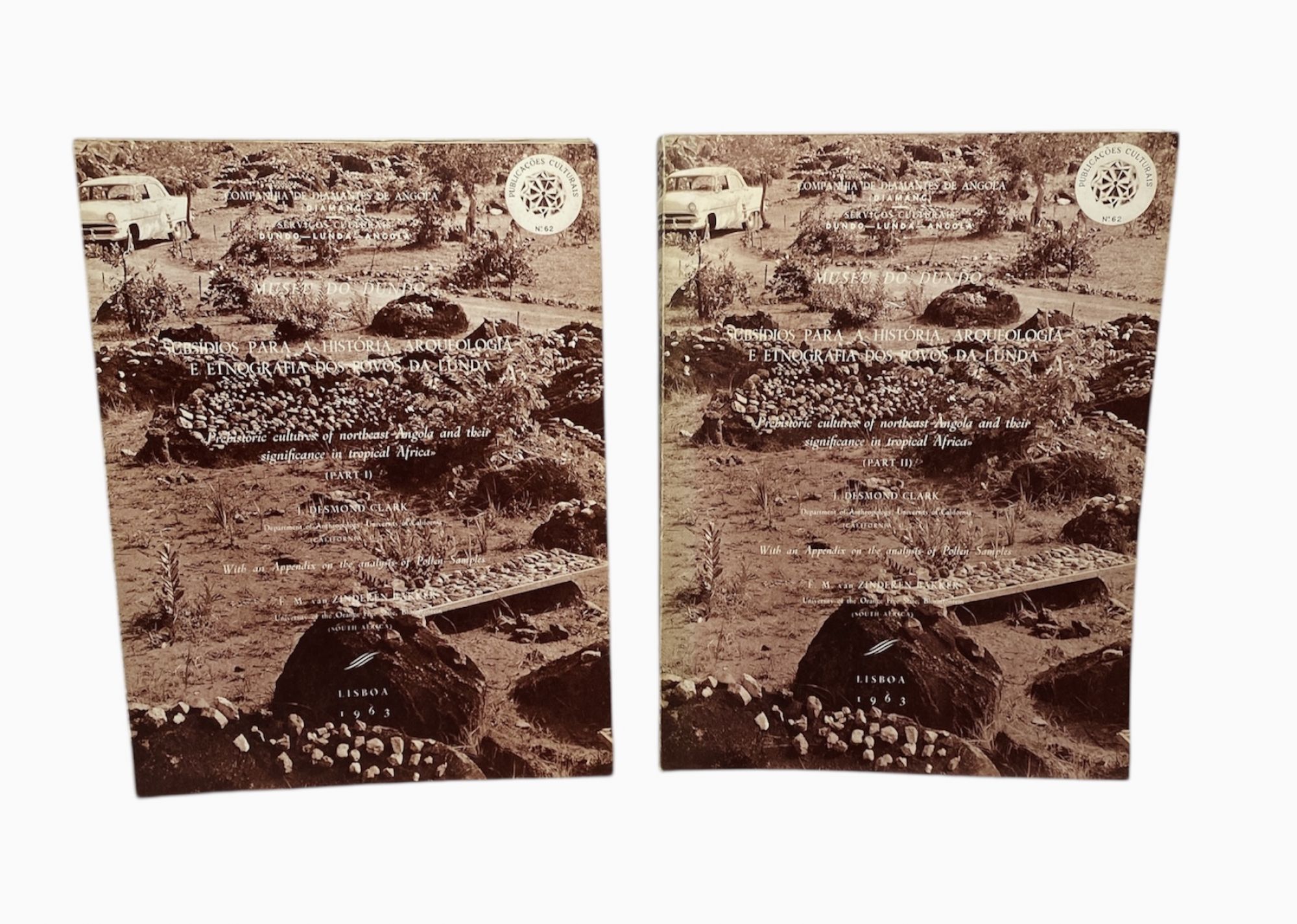 Diamang. - CLARK, J. Desmond. - "PRE-HISTORICAL CULTURES OF NORTHEAST ANGOLA AND THEIR SIGNIFICANCE IN TROPICAL AFRICA". Wuthe an Appendix on the analyses of Pollen Samples, by E. M. van Zinderen Bakker. Parte I (e Parte II). (Subsídios para a história, arqueologia e etnografia dos povos da Lunda). Lisboa. Companhia de Diamantes de Angola. 1963. 2 Vols. In-Fólio. Brs.