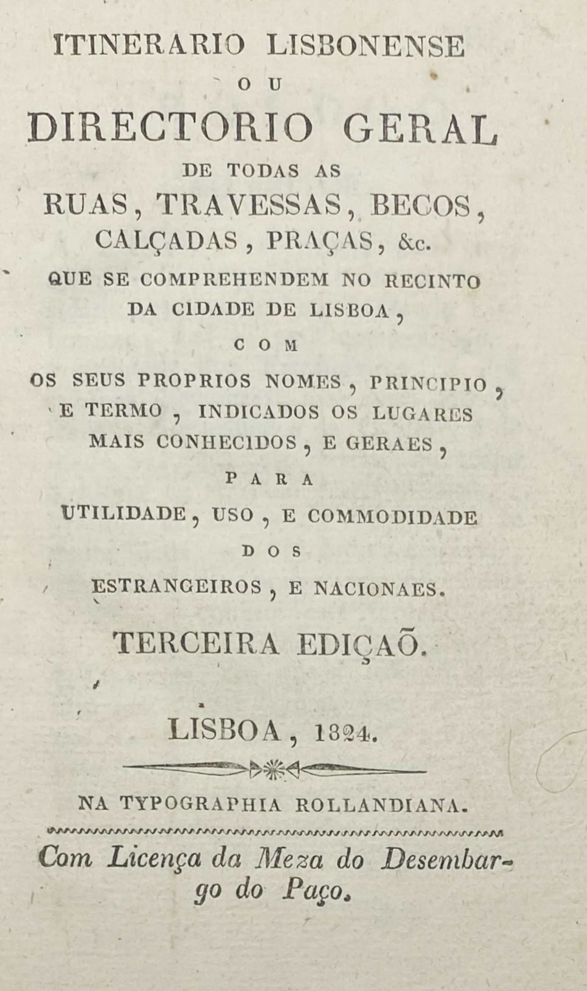 ITINERARIO LISBONENSE OU DIRECTORIO GERAL DE TODAS AS RUAS, TRAVESSAS, BECOS, CALÇADAS, PRAÇAS, ETC. Que se comprehendem no recinto da Cidade de Lisboa, com os seus proprios nomes, principio, e termo, indicados nos lugares mais conhecidos, e geraes, para utilidade, uso, e commodidade dos estrangeiros, e nacionaes. Lisboa. Na Typographia Rollandiana. 1824. In-8º de VIII, [2], 142, [4] págs. Enc.