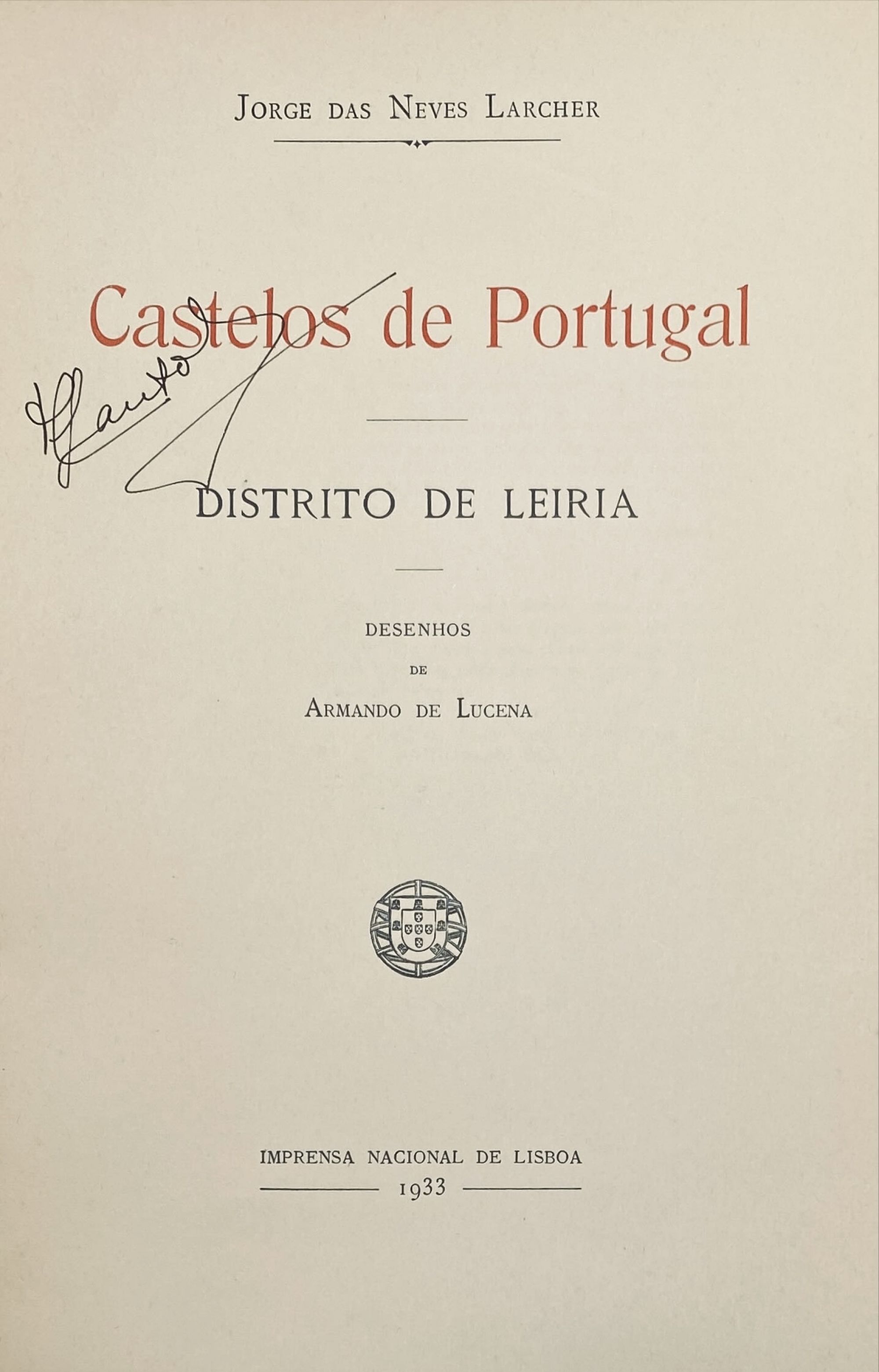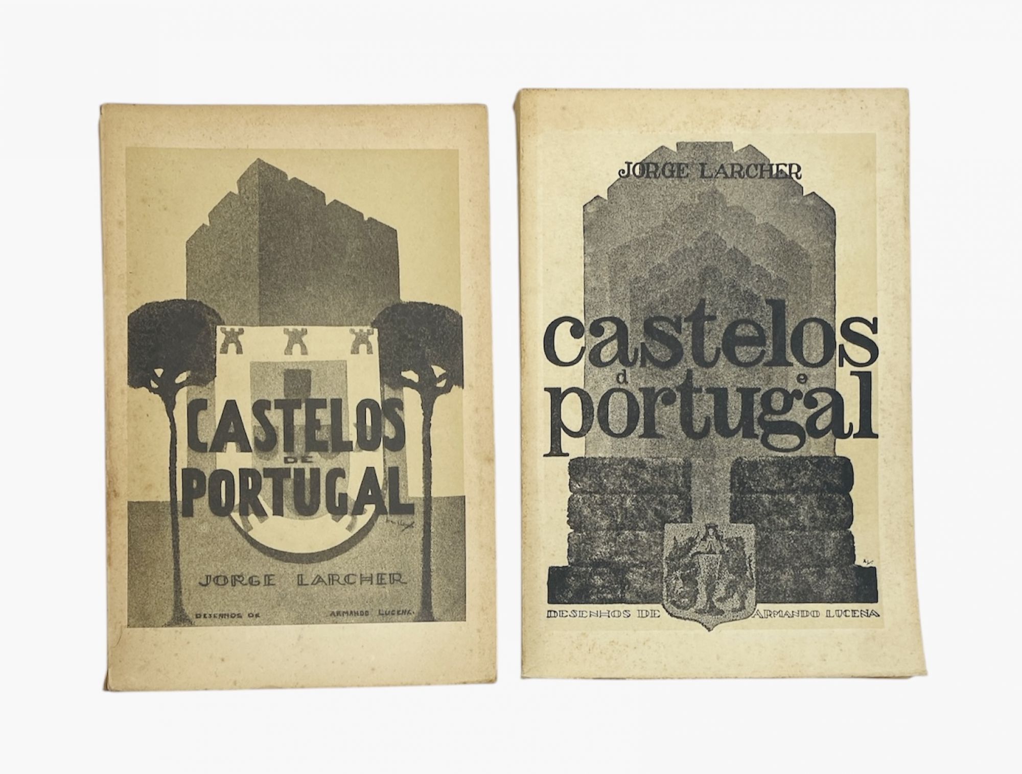 LARCHER, Jorge das Neves. - CASTELOS DE PORTUGAL. DISTRITO DE LEIRIA. Desenhos de Armando de Lucena (e DISTRITO DE COIMBRA). Lisboa. Imprensa Nacional. 1933 (e 1935). 2 Vols. In-8º Brs.
