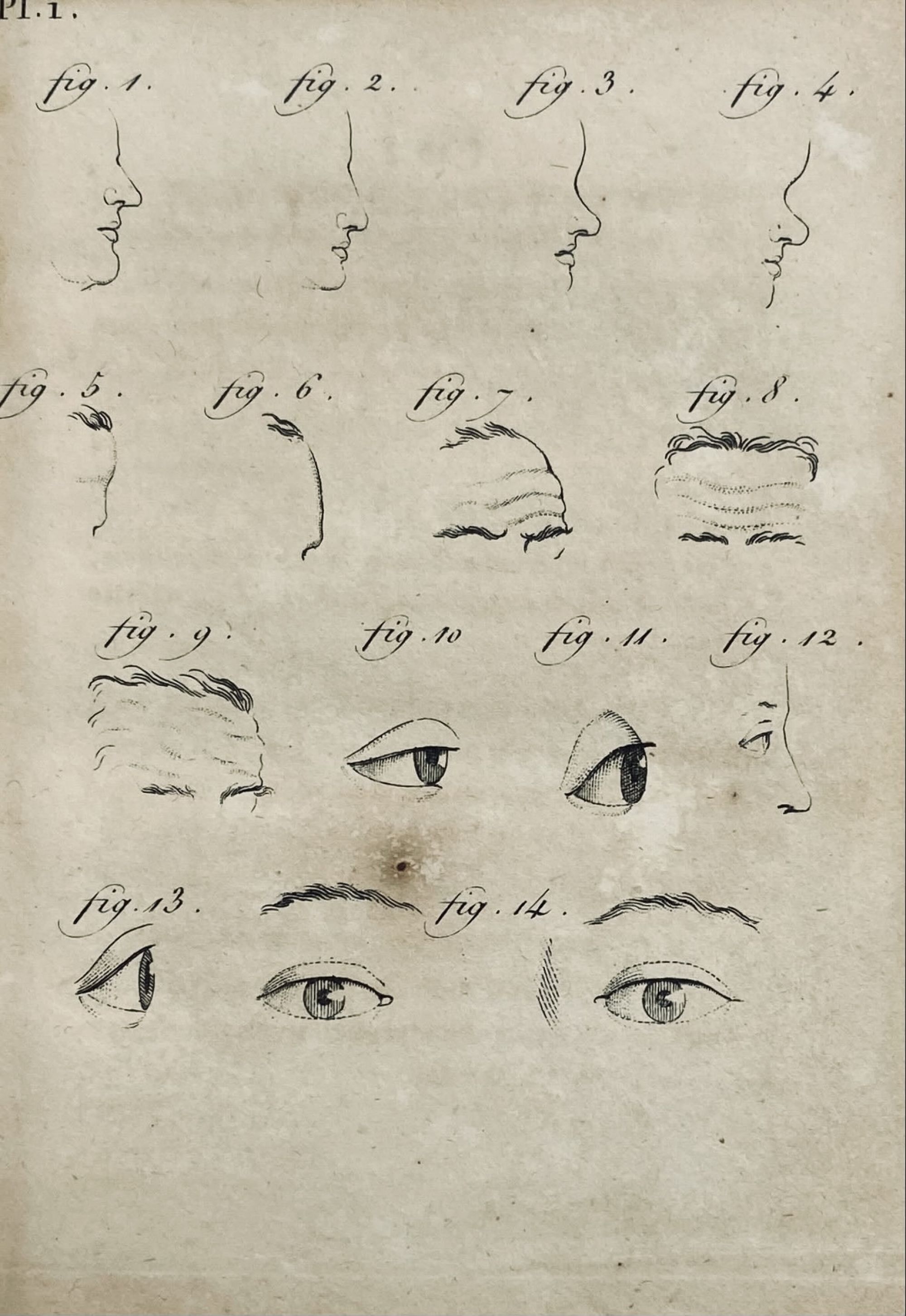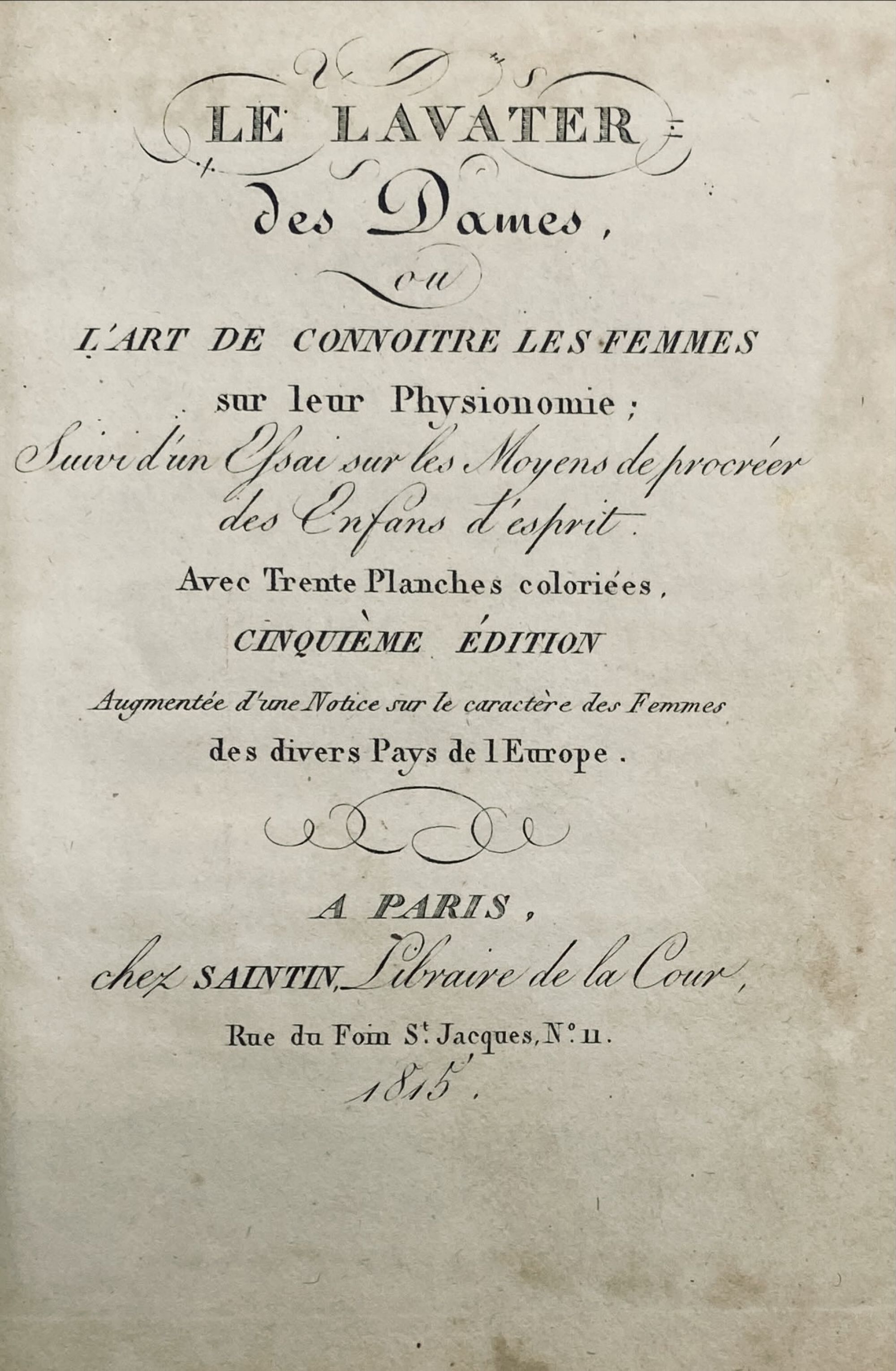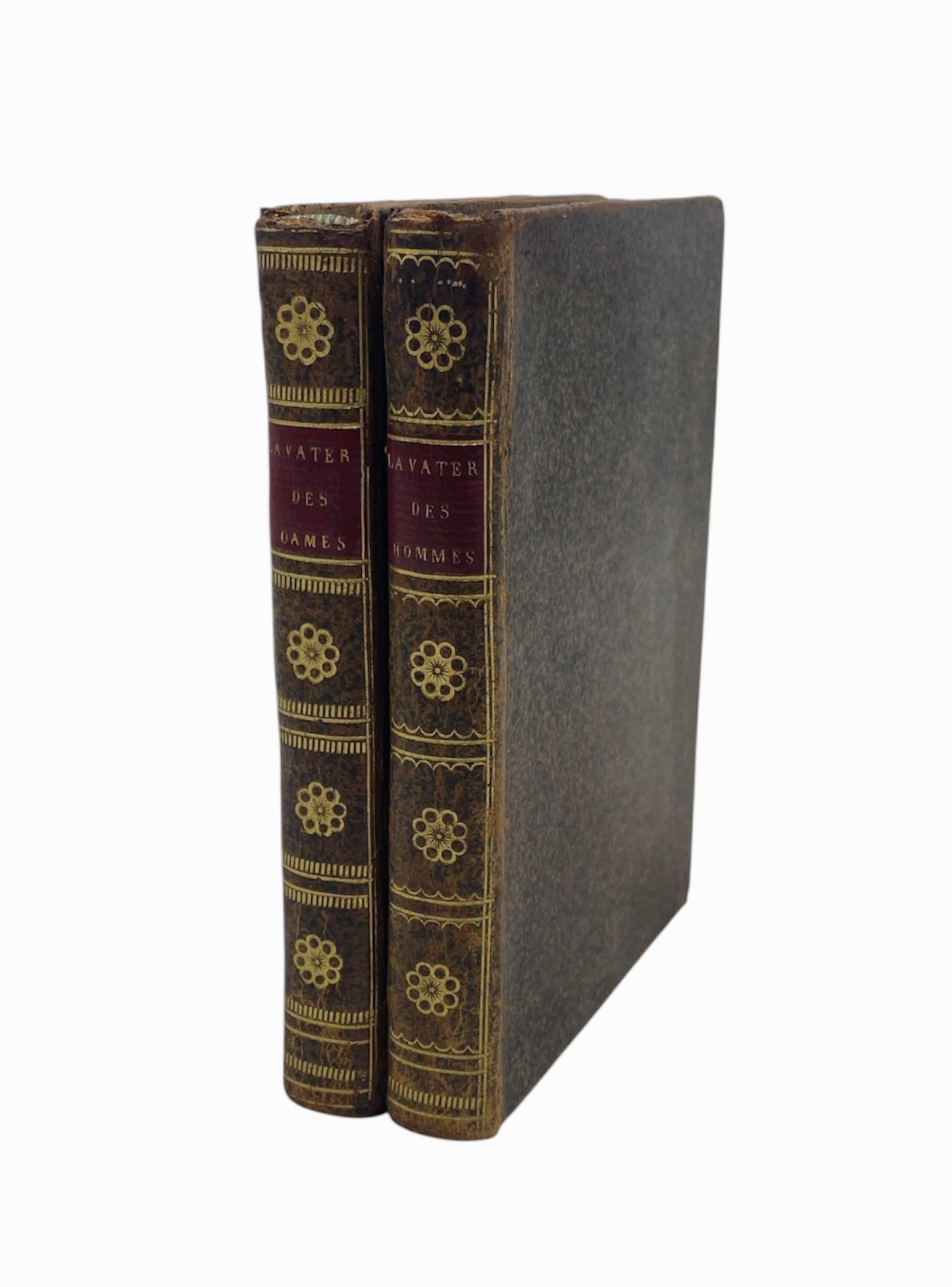 Belas edições. Ilustrados com 60 gravuras coloridas de homens e mulheres com as suas características faciais. Obra muito popular no início do século XIX que permitia a análise do carácter das pessoas com base em sua fisionomia. Encadernações da época inteiras de pele.
