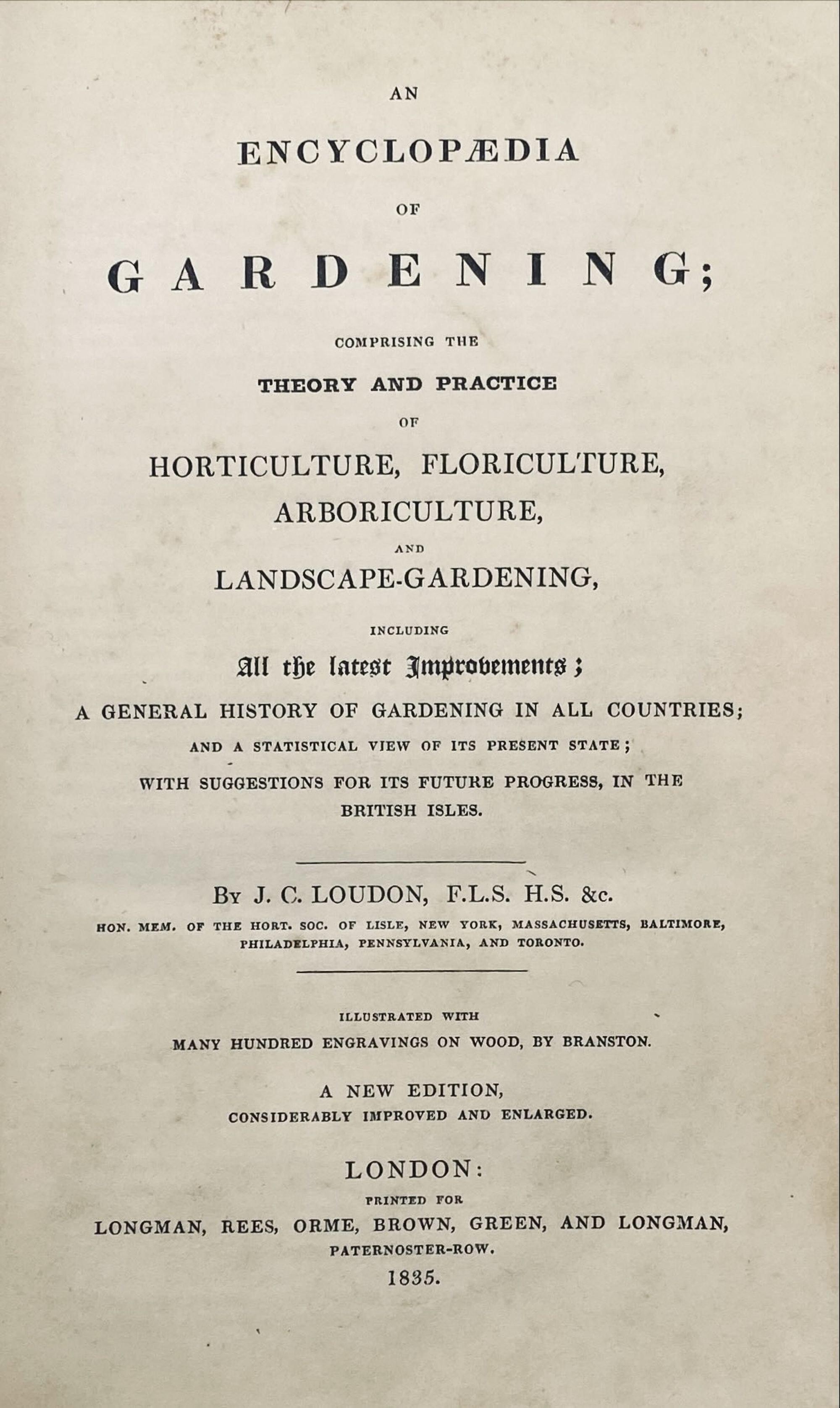 LOUDON, John Claudius. - AN ENCYCLOPAEDIA OF GARDENING; comprising the Theory and Practice of Horticulture, Floriculture, Arboriculture and Landscape-Gardening. London. Longman, Rees, Orme, Brown, Green, and Longman. 1835. in-8º de XL, 1270, 16 págs. Enc.