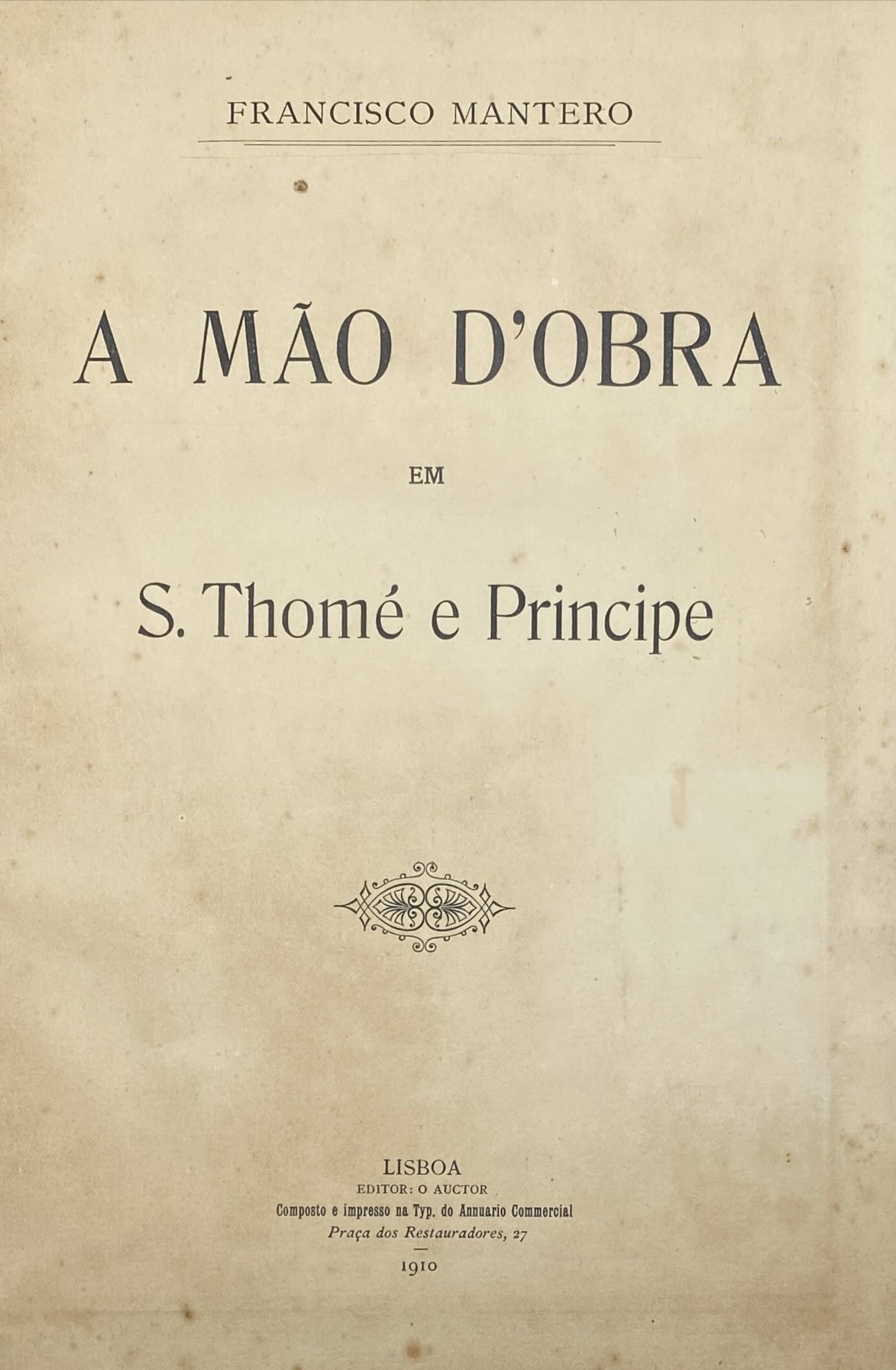 MANTERO, Francisco. - A MÃO D'OBRA EM S. THOMÉ E PRINCIPE. Lisboa. Typ. do Annuario Commercial. 1910. In-4º de 200, [5] págs. Enc.