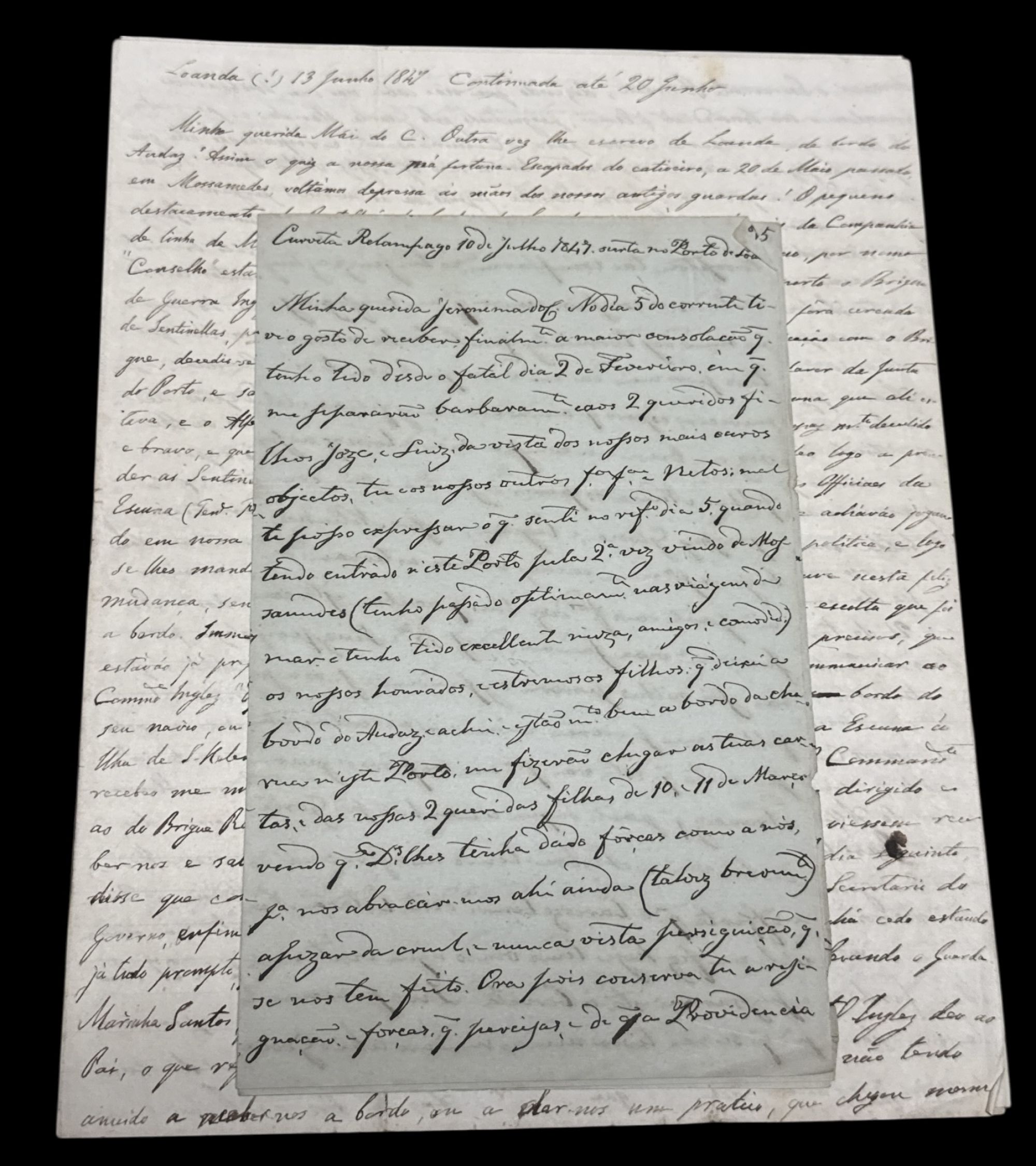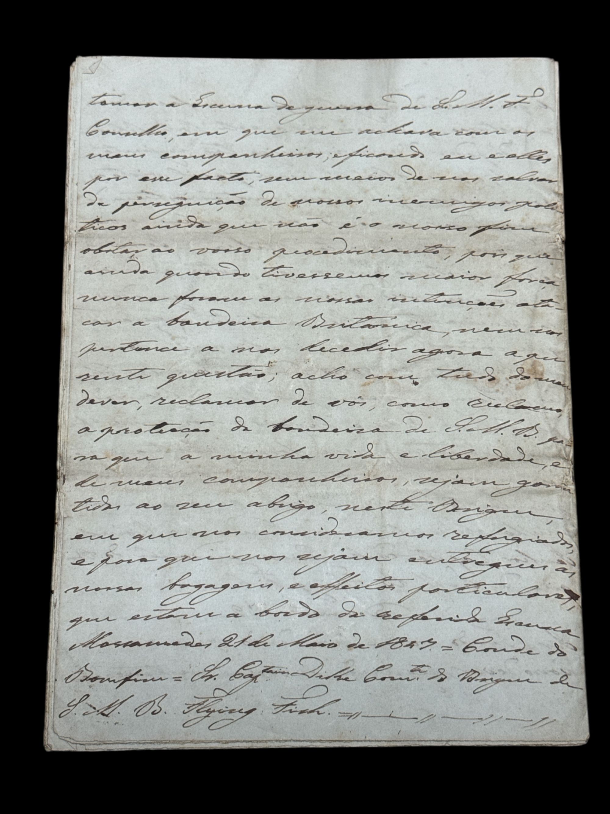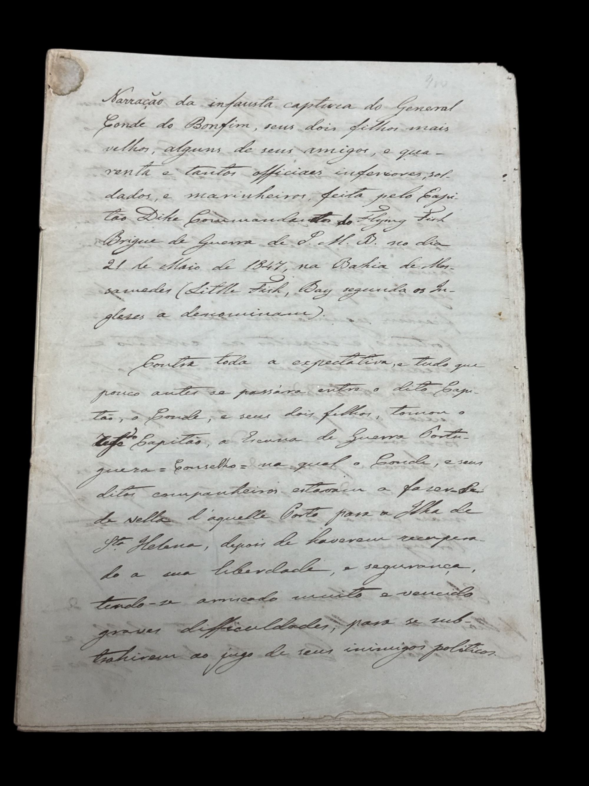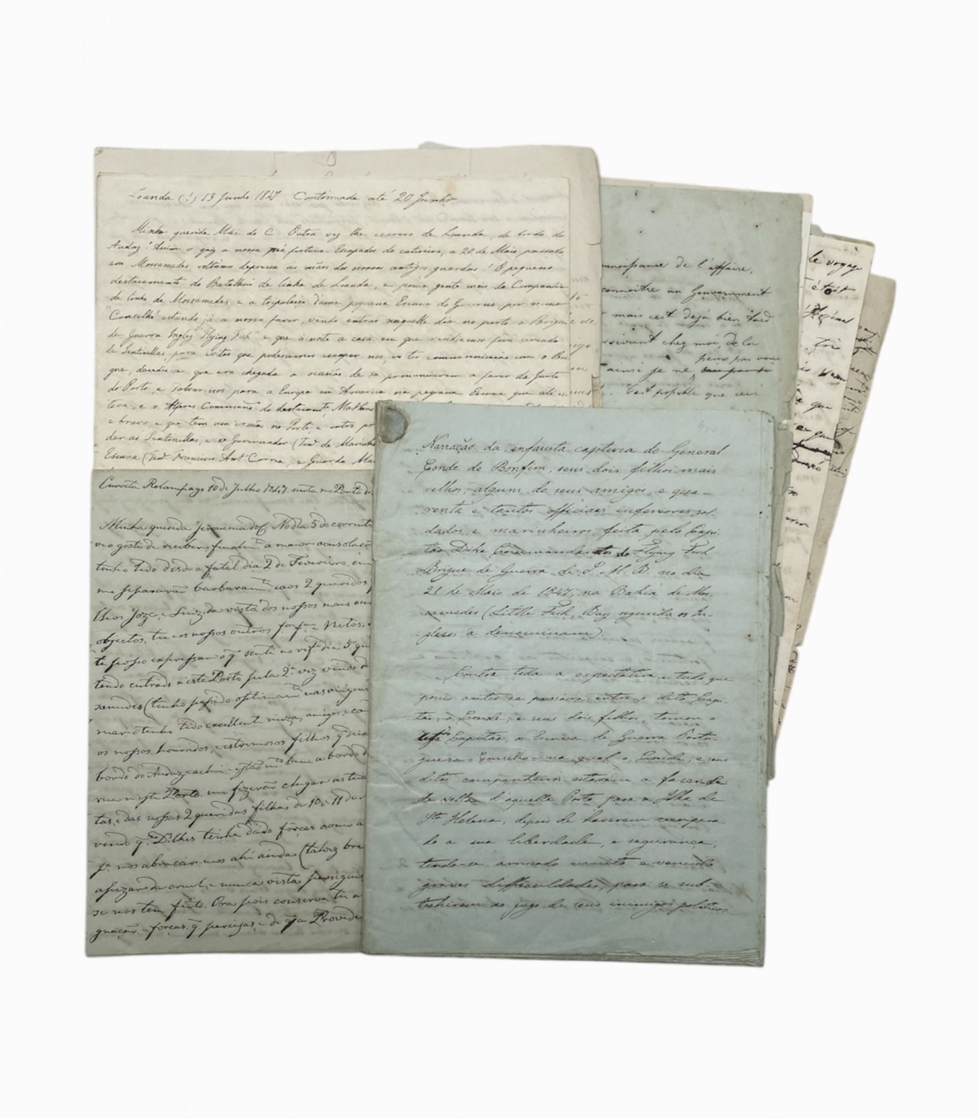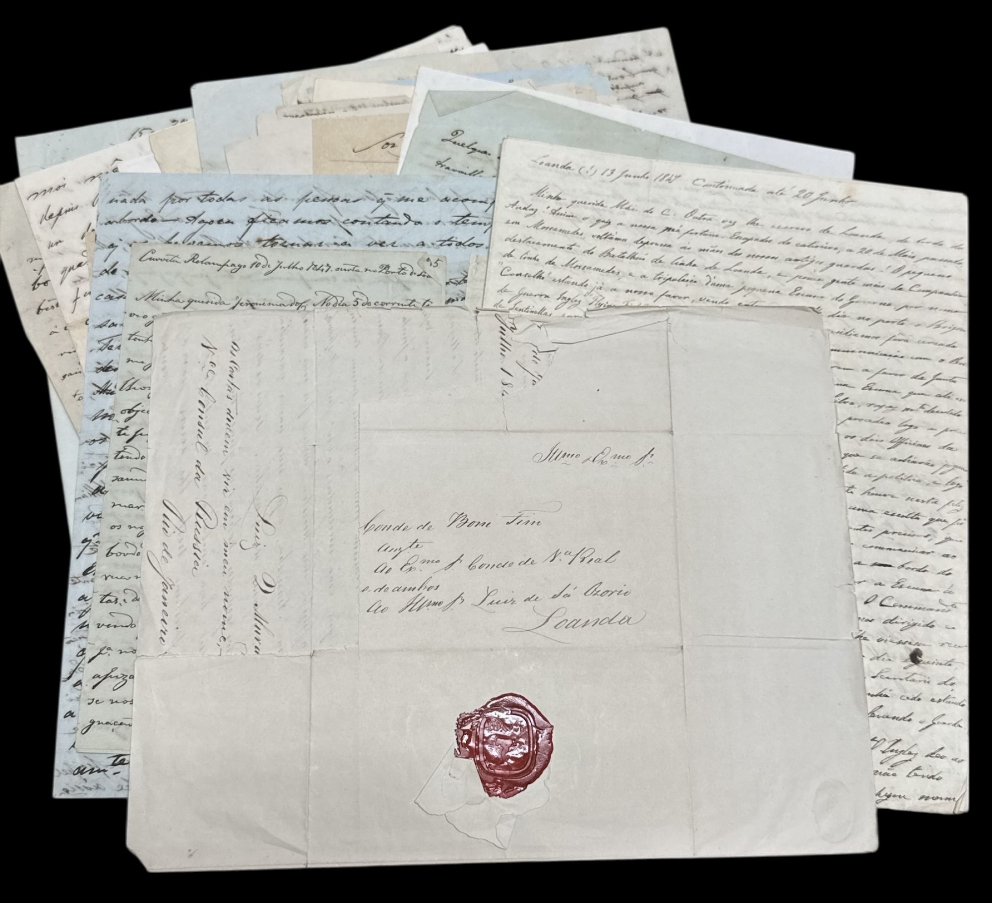 Conjunto de correspondência de 37 cartas e rascunhos trocada para várias personalidades durante o exilio. Cartas escritas a bordo das Corvetas, Luanda e Mossâmedes entre 1846 e 1848. O conjunto possui também um importante e valioso documento de 18 folhas pelo Comandante do Brigue de Guerra Inglês “Flying Fish” relatando a captura da famosa tentativa de fuga do Conde do Bonfim na Baia de Mossâmedes.