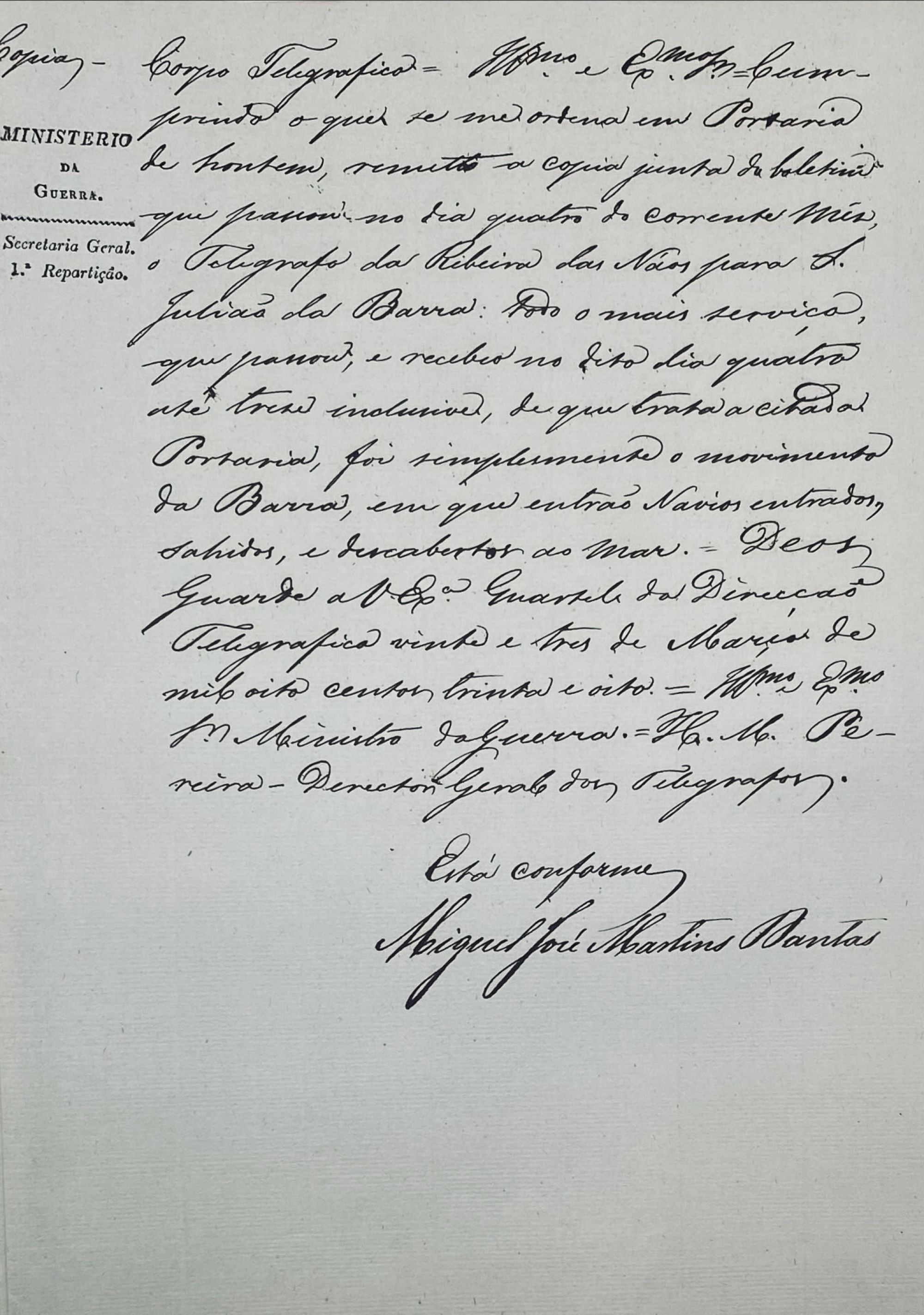 Conjunto de 10 cópias telegráficas de documentos autenticados com o logotipo do Ministério da Guerra, assinados por Miguel José Martins Dantas. Outro documento sem chancela e não assinado. Copias de documentos do Costa Cabral, Visconde de Sá da Bandeira, Barão do Bonfim, Visconde de Reguengos, A. J. Silveiro, Paulo António da Costa, M. Pereira.