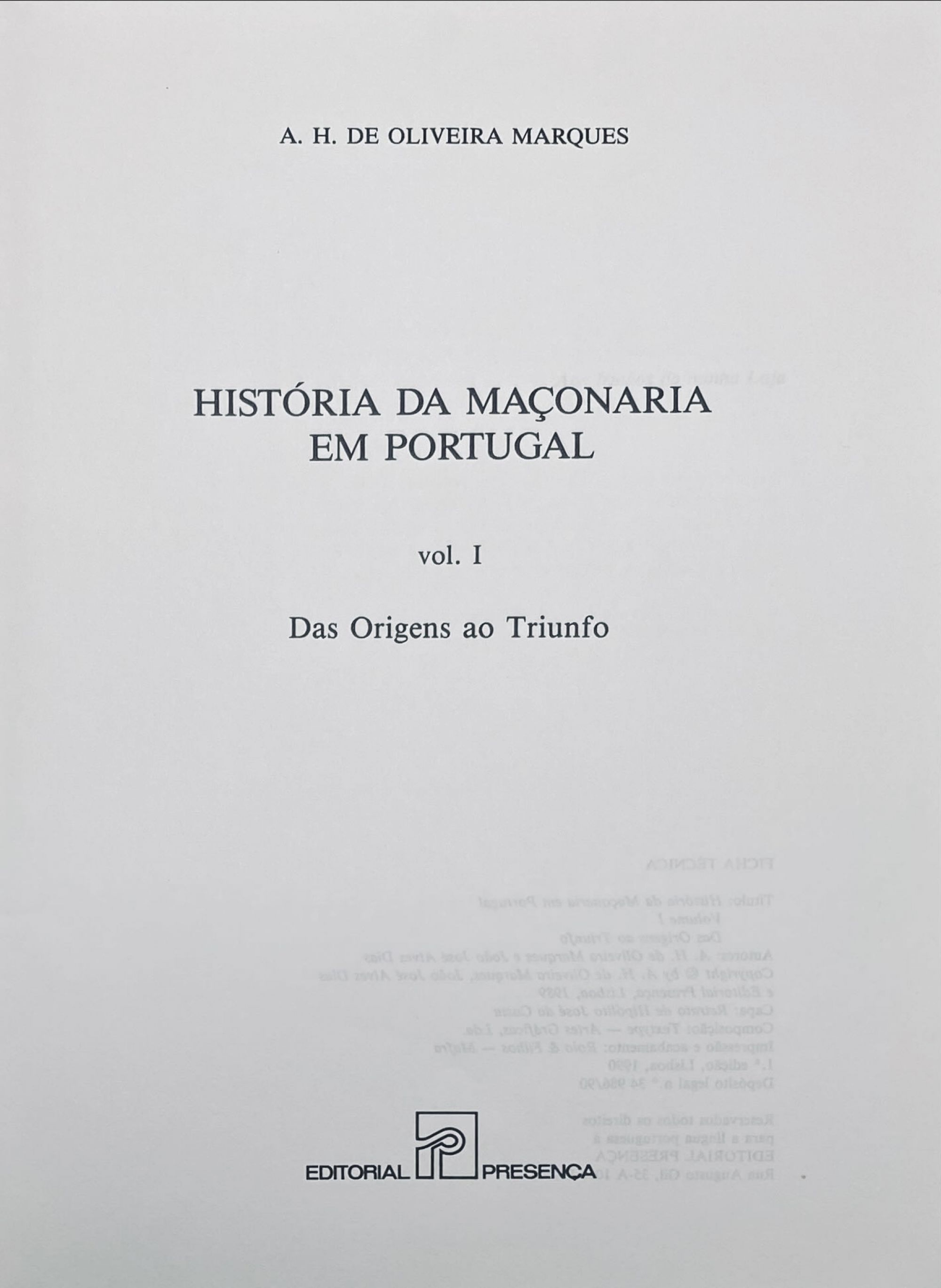 MARQUES, A. H. de Oliveira. - HISTÓRIA DA MAÇONARIA EM PORTUGAL. Vol. I - Das Origens ao Triunfo. Vols- 2 e 3 - Política e Maçonaria. 1820-1869 (1ª e 2ª Parte).