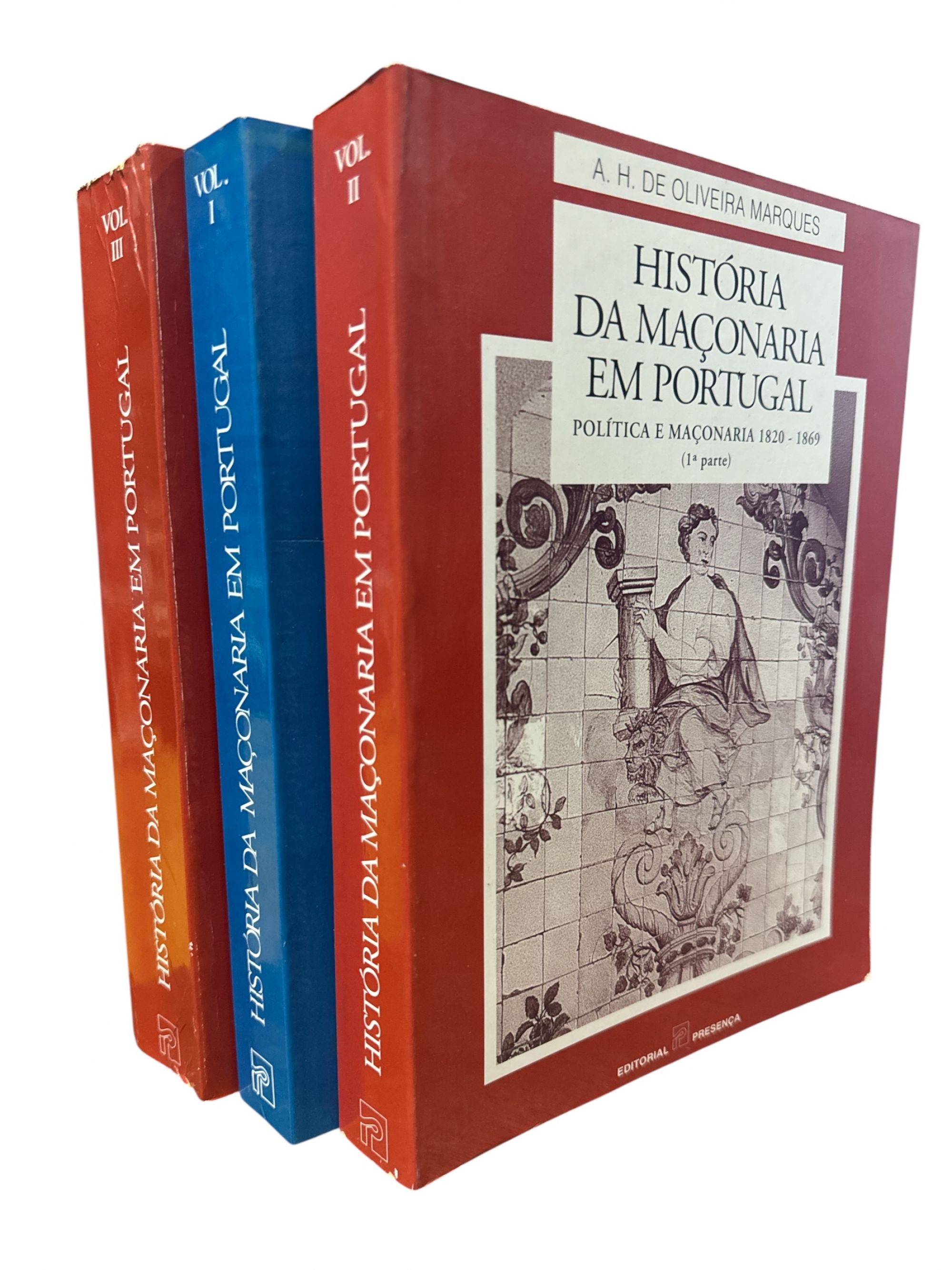 MARQUES, A. H. de Oliveira. - HISTÓRIA DA MAÇONARIA EM PORTUGAL. Vol. I - Das Origens ao Triunfo. Vols- 2 e 3 - Política e Maçonaria. 1820-1869 (1ª e 2ª Parte). Lisboa. Editorial Presença. 1990 (a 1997). 3 Vols. In-8º Brs.