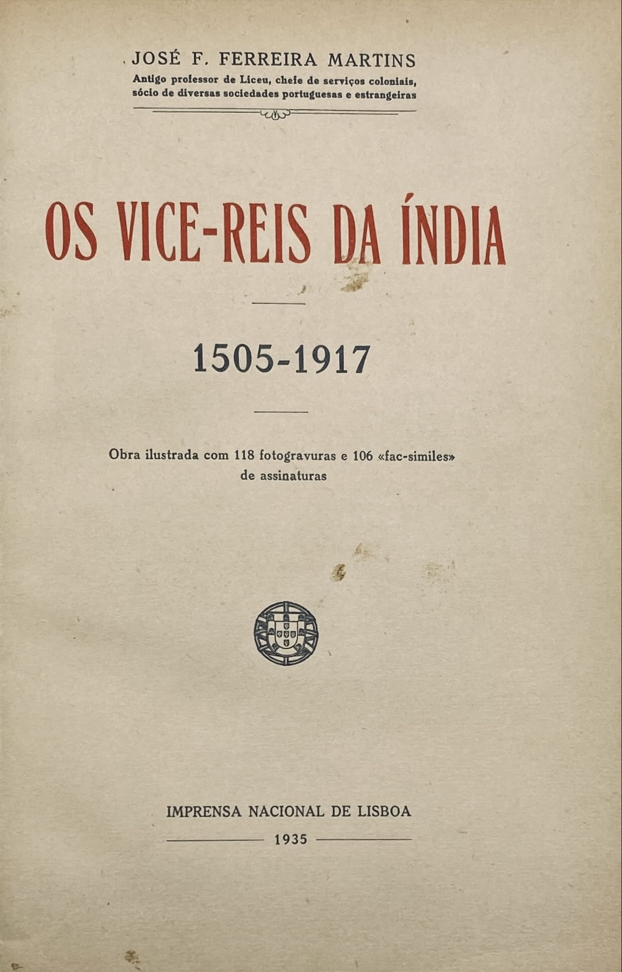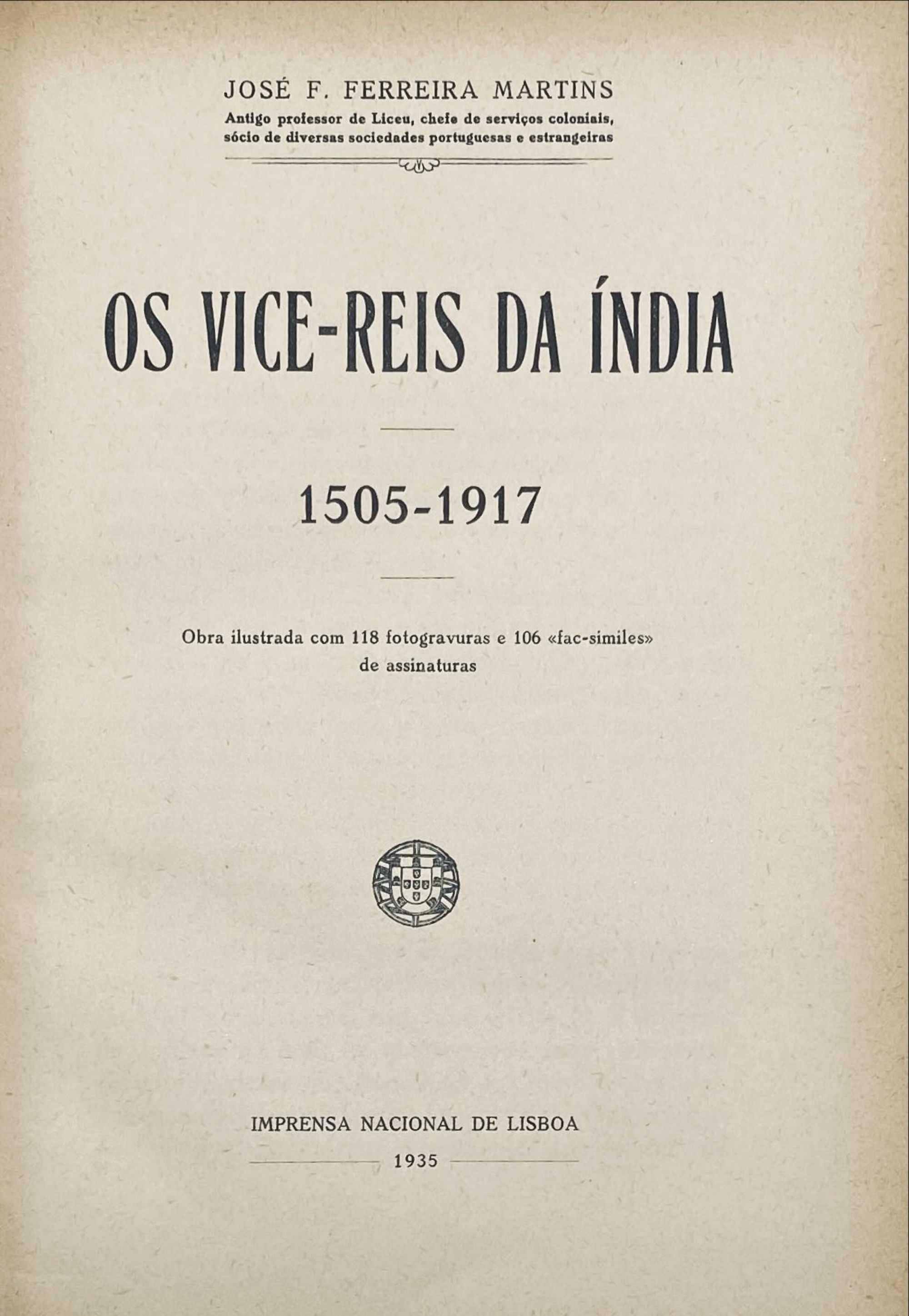 MARTINS, José F. Ferreira. - OS VICE-REIS DA INDIA. 1505-1917. Obra ilustrada com 118 fotogravuras e 106 fac.similes de assinaturas.