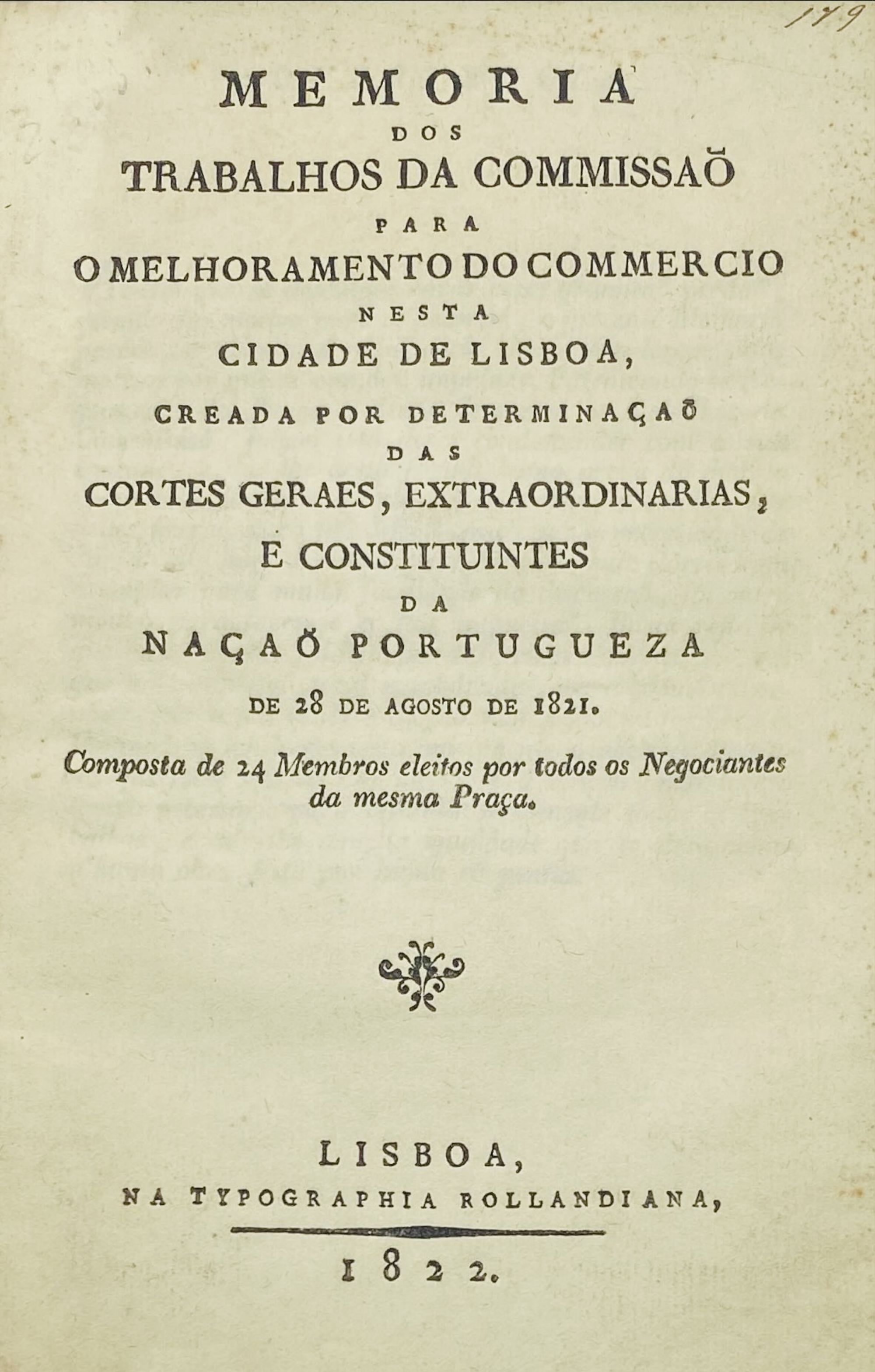 MEMORIA DOS TRABALHOS DA COMISSÃO PARA O MELHORAMENTO DO COMMERCIO NESTA CIDADE DE LISBOA creada por determinação das cortes geraes, extraordinárias, e constituintes da nação portugueza de 28 de agosto de 1821.