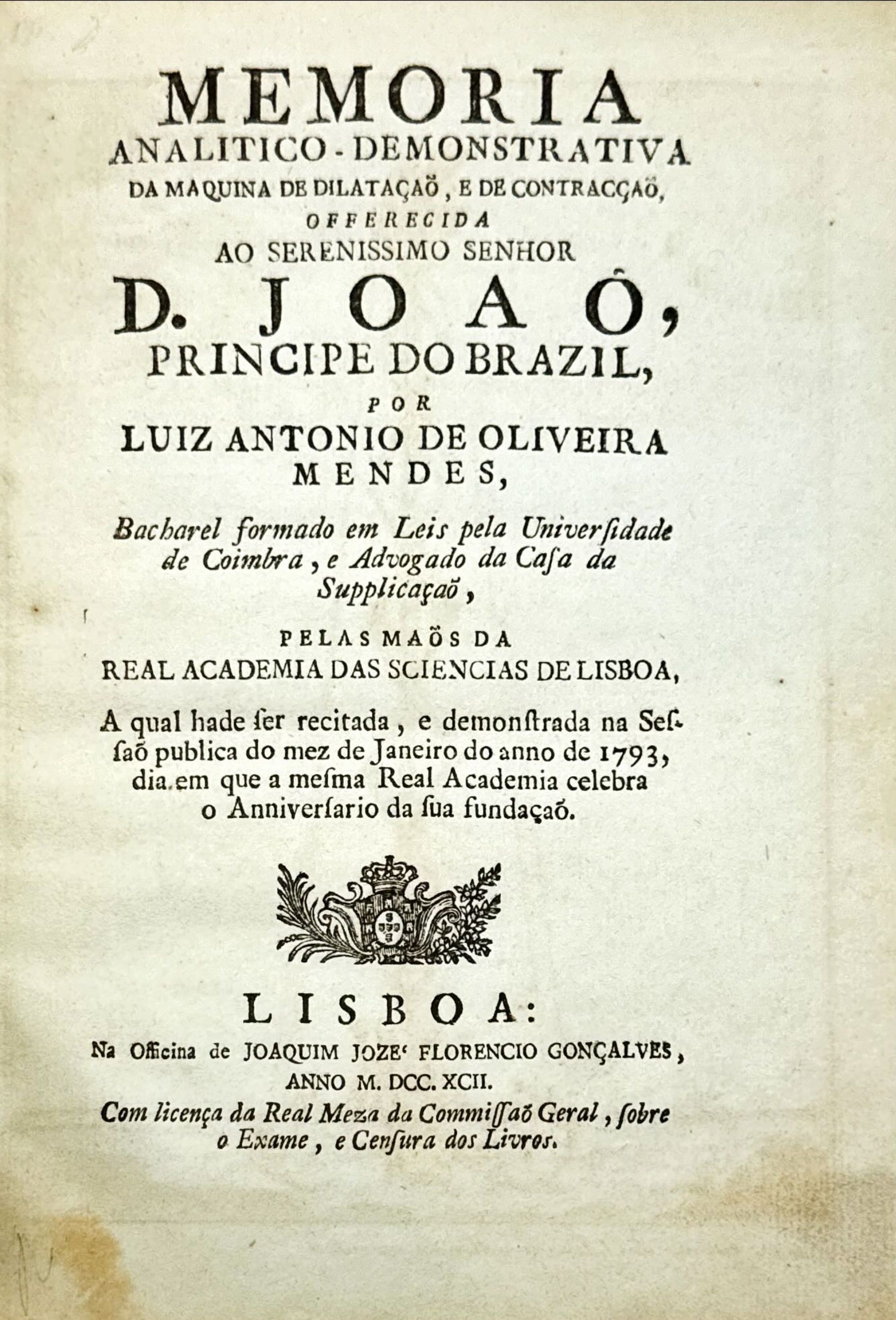 MENDES, Luis Antonio de Oliveira. - MEMORIA ANALITICO-DEMONSTRATIVA DA MAQUINA DE DILATAÇAO, E DE CONTRAÇÃO offerecida ao Serenissimo Senhor D. João, Principe do Brasil... JUNTO COM: Tentativas ou Ensaios, em que se tem entrado o autor da maquina de Dilatação, e de Contracção e da memoria-demonstrativa della.