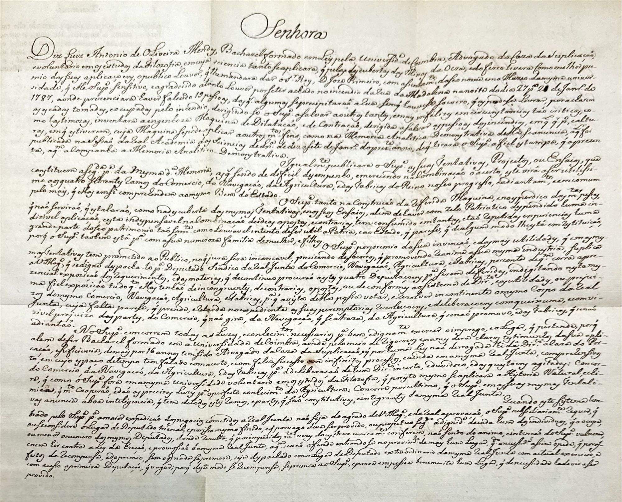 Obras científicas muito rara, contendo a gravura da máquina de elevação, inventada por este sócio da Academia Real das Ciências. Valorizado com 2 cartas do autor enviadas ao Rei. A necessidade do autor de inventar esta máquina foi devido ao fatal incendio na Rua da Magdalena na noite de 27 de janeiro de 1787 em que esteve presente e relata na obra o acontecimento. O autor, Bacharel formado em Leis pela Universidade de Coimbra, tendo também frequentado como voluntário as aulas de Filosofia e Medicina. Escreveu também sobre escravatura no Brasil e a Bahia. Advogado da Casa da Suplicação, sócio da Academia Real das Ciências de Lisboa, etc. Nasceu na Baía em 1750, onde também faleceu em 1814. Bem conservado. Encadernação em sintético.