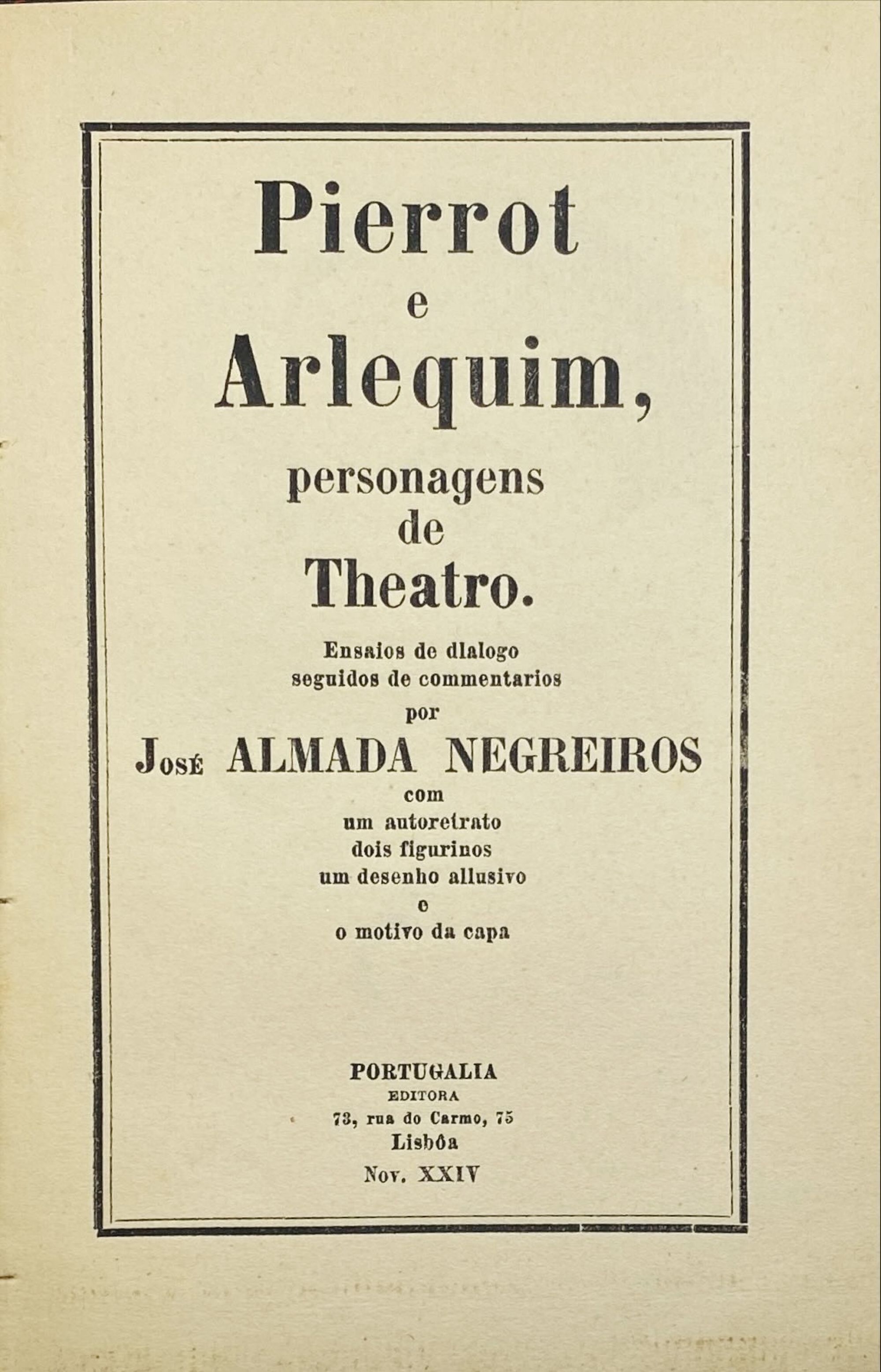 NEGREIROS, José Almada. - PIERROT E ARLEQUIM, peronagens de Theatro. Ensaios de dialogo seguidos de commentarios por... com um autoretrato dois figurinos um desenho allusivo e motivo da capas. Lisboa. Portugália Editora. Nov. de XXIV. (1924). In-8º 69, [2] págs. Enc.