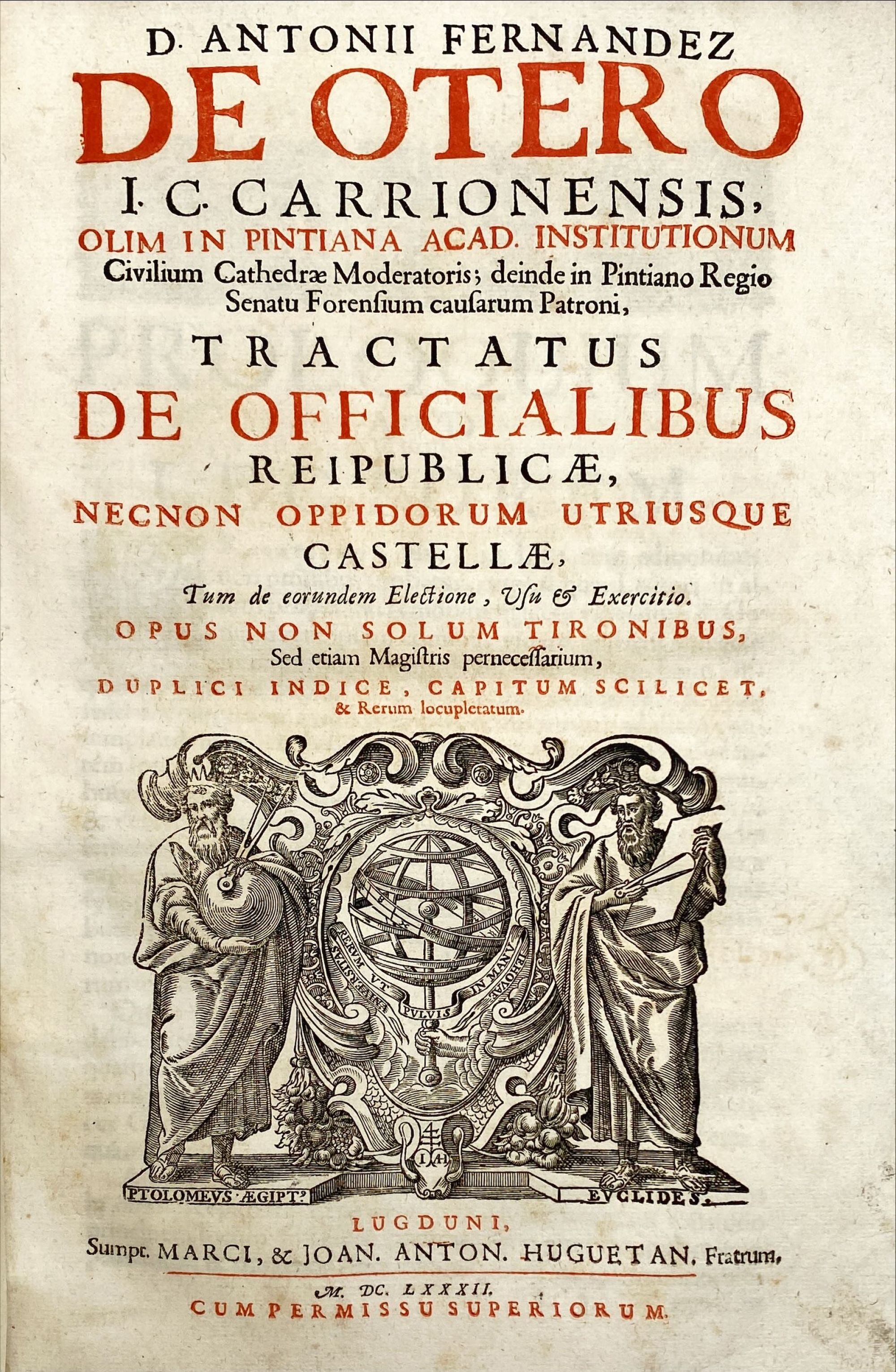 OTERO, Antonio Fernandez. - TRACTATUS DE OFFICIALIBUS REIPUBLICAE, NECNON OPPIDORUM UTRIUSQUE CASTELLAE. Lugduni. Sumpt. Marci, & Joan. Anton. Huguetan, fratrum. 1682. In-4º de [6], 278, [29] págs. Enc.