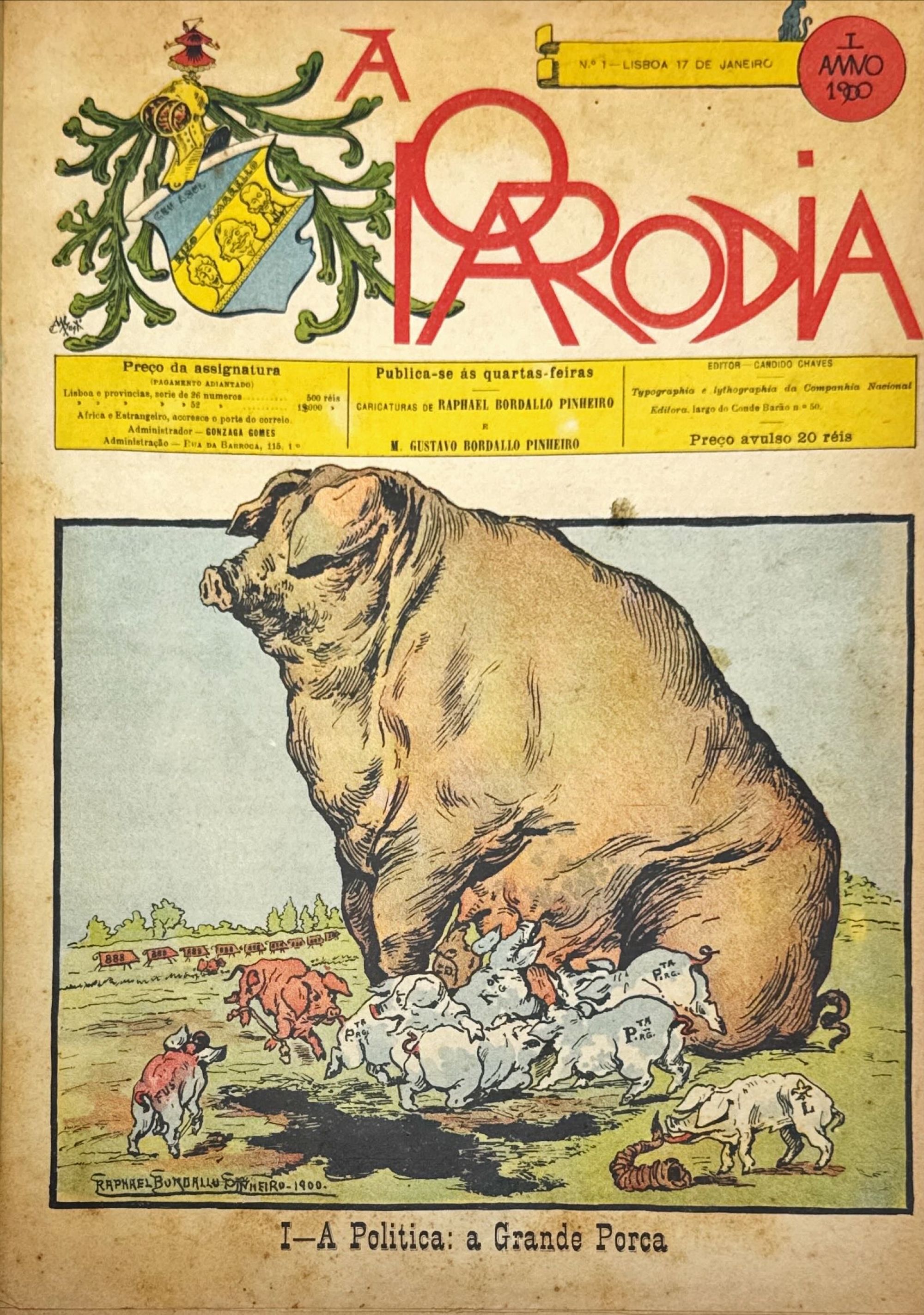 PARODIA (A). Publica-se ás quartas-feiras. Caricaturas de Raphael Bordallo Pinheiro e Gustavo Bordallo Pinheiro. Editor: Candido Chaves. Nº 1 - Lisboa. 17 de Janeiro. 1900 (ao Nº 51 - 31 de Dezembro de 1903).