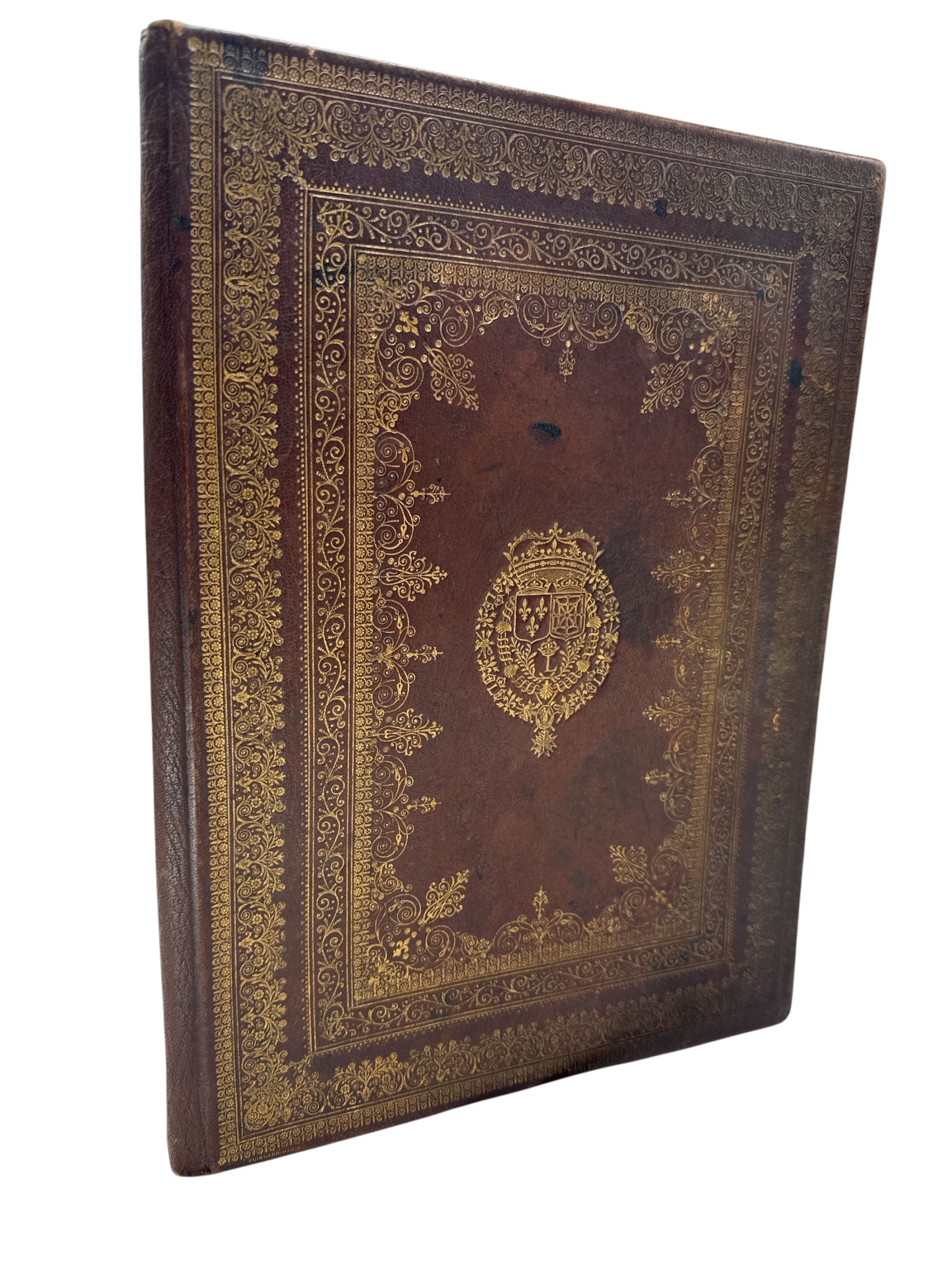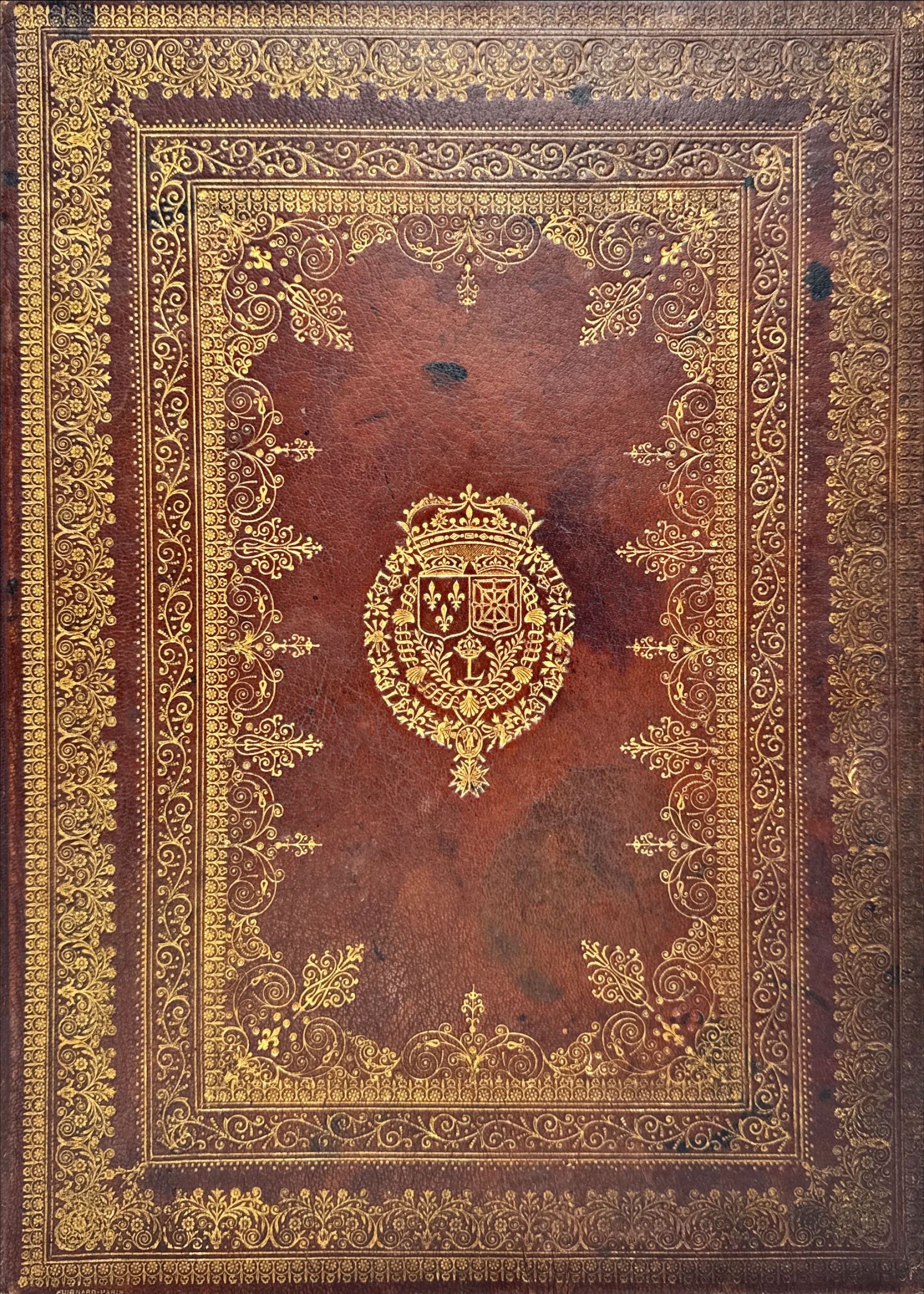 Pasta em pele com diversas rodas diferentes de motivos florais a ouro e ao centro o Brasão de Armas de Luis XIII (reinou de 1610 a 1643), a pasta de trás com ferros a ouro e a seco. Guardas em seda.