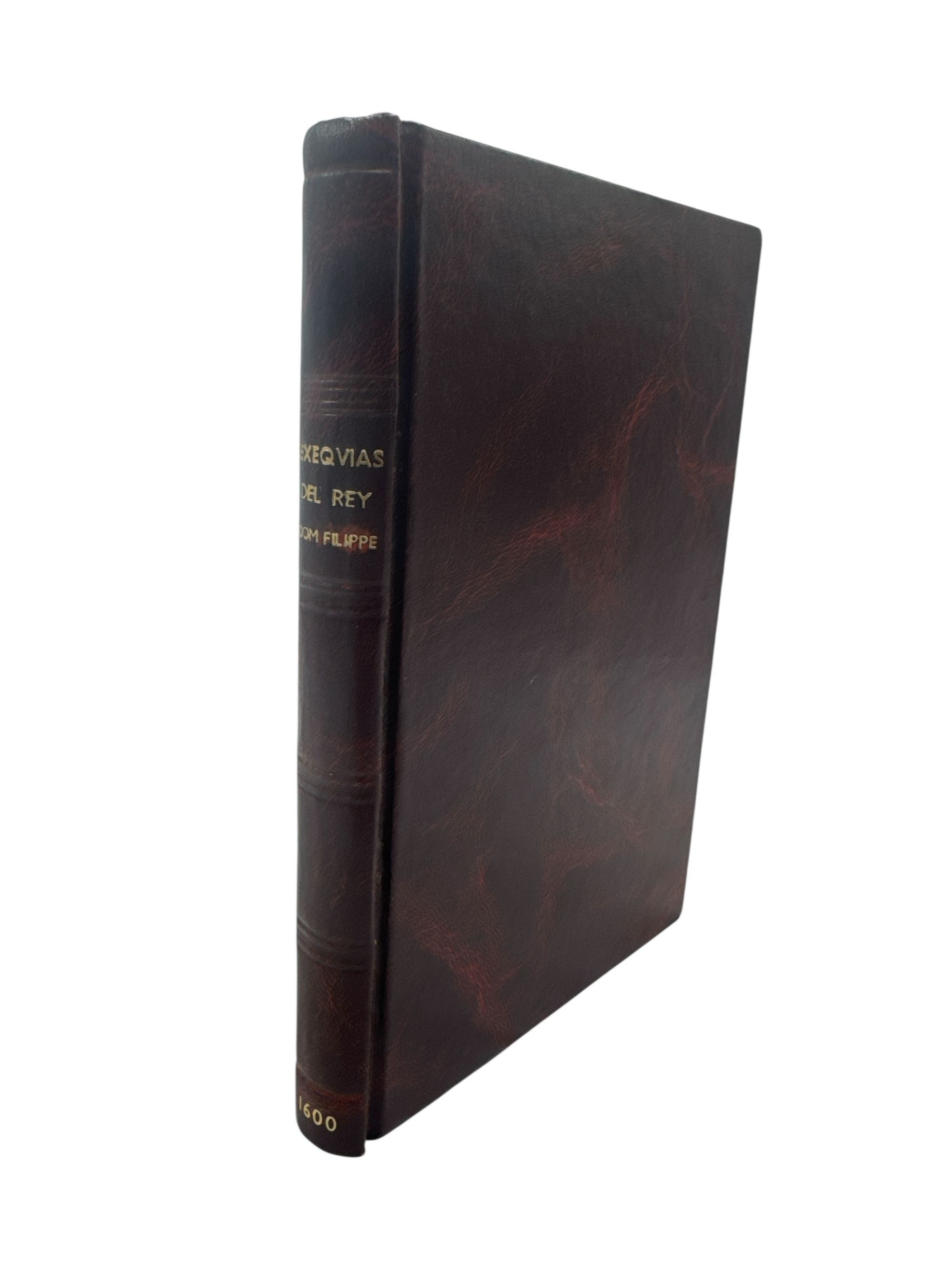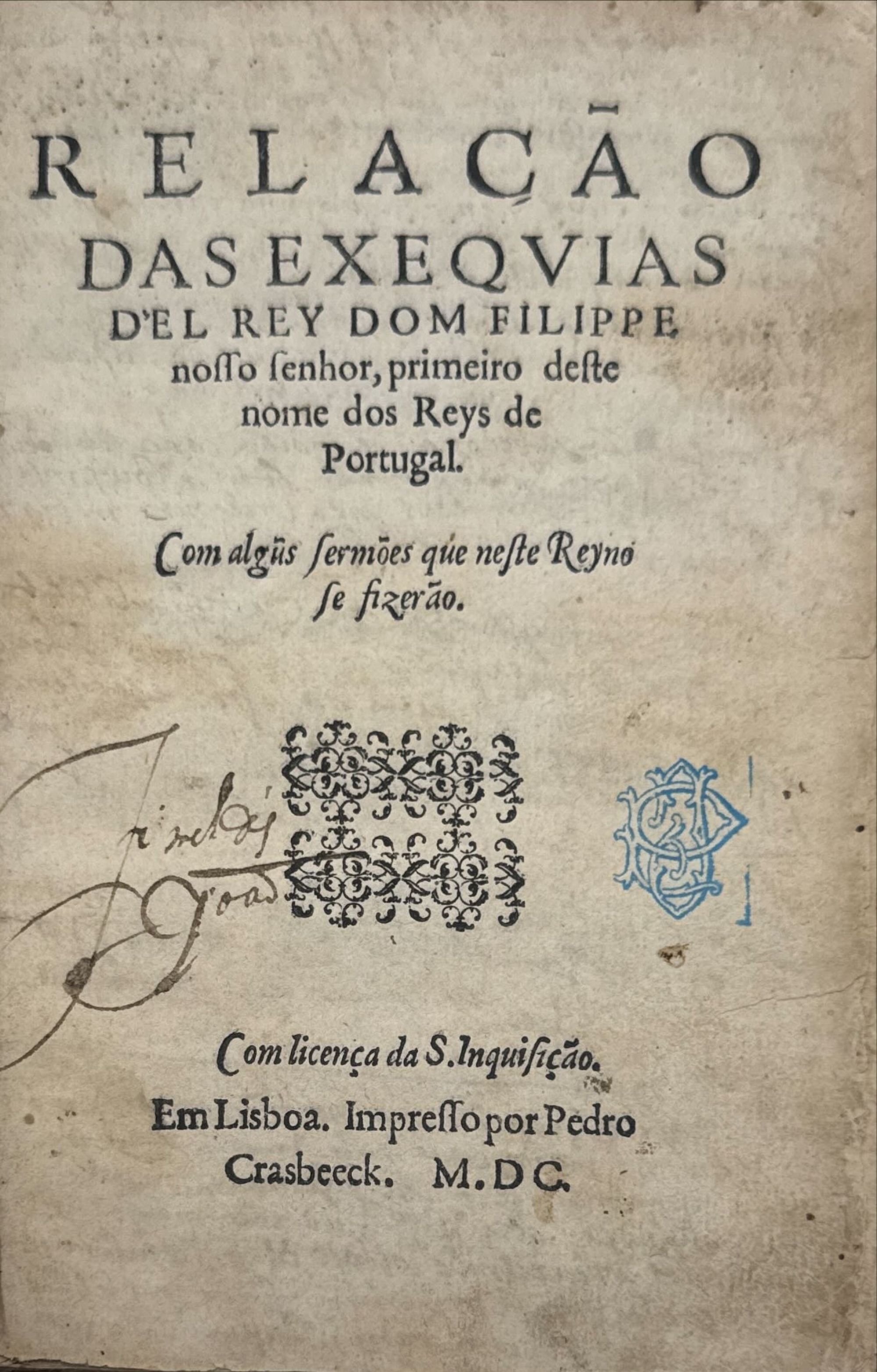 RELAÇÃO DAS EXEQVIAS D'EL REY DOM FILIPPE nosso senhor, primeiro deste nome dos Reys de Portugal. Com algus sermões que neste Reyno se fizerão. Lisboa. Impresso por Pedro Crasbeeck. 1600. In 8º de [I], 84, [10] fls.