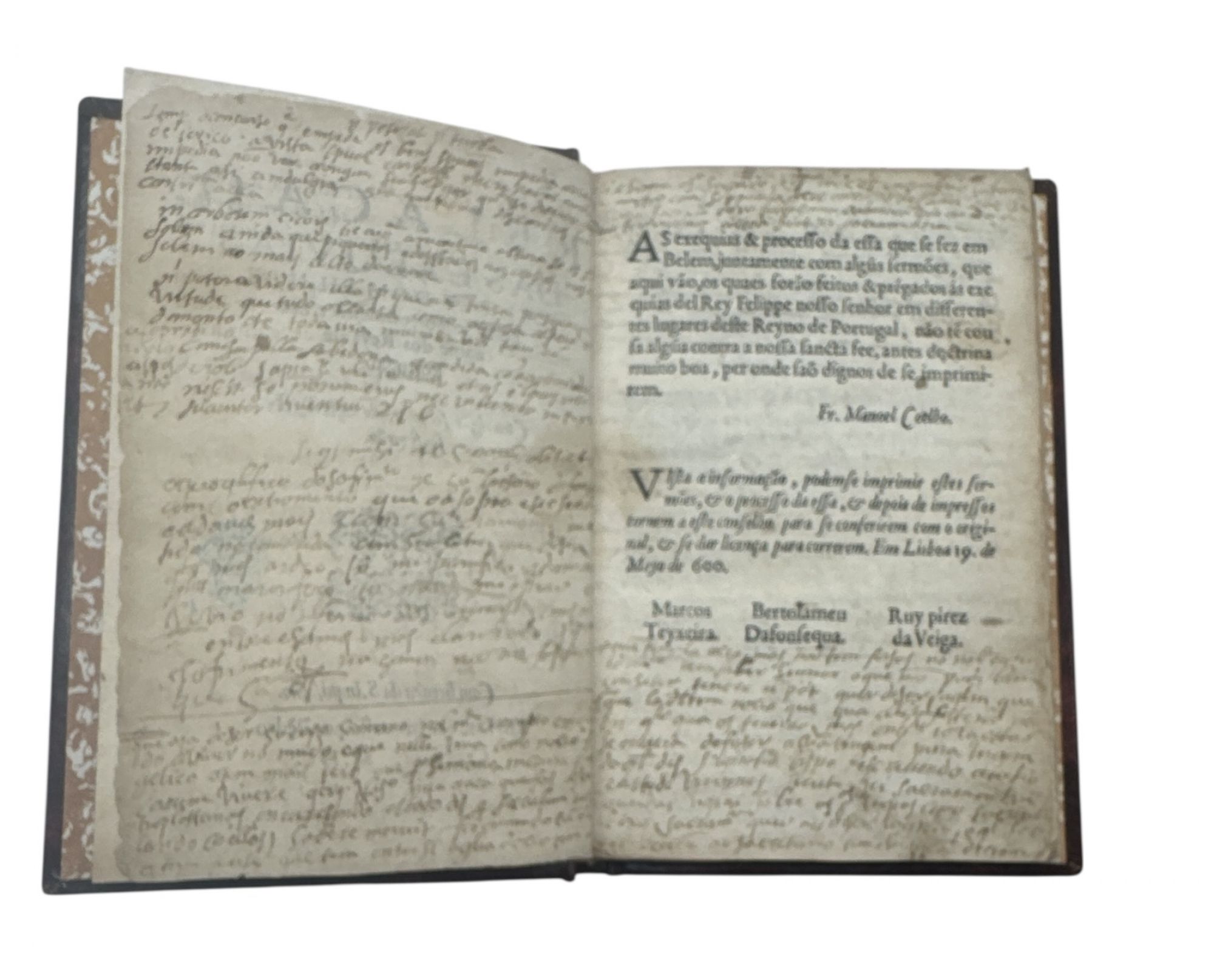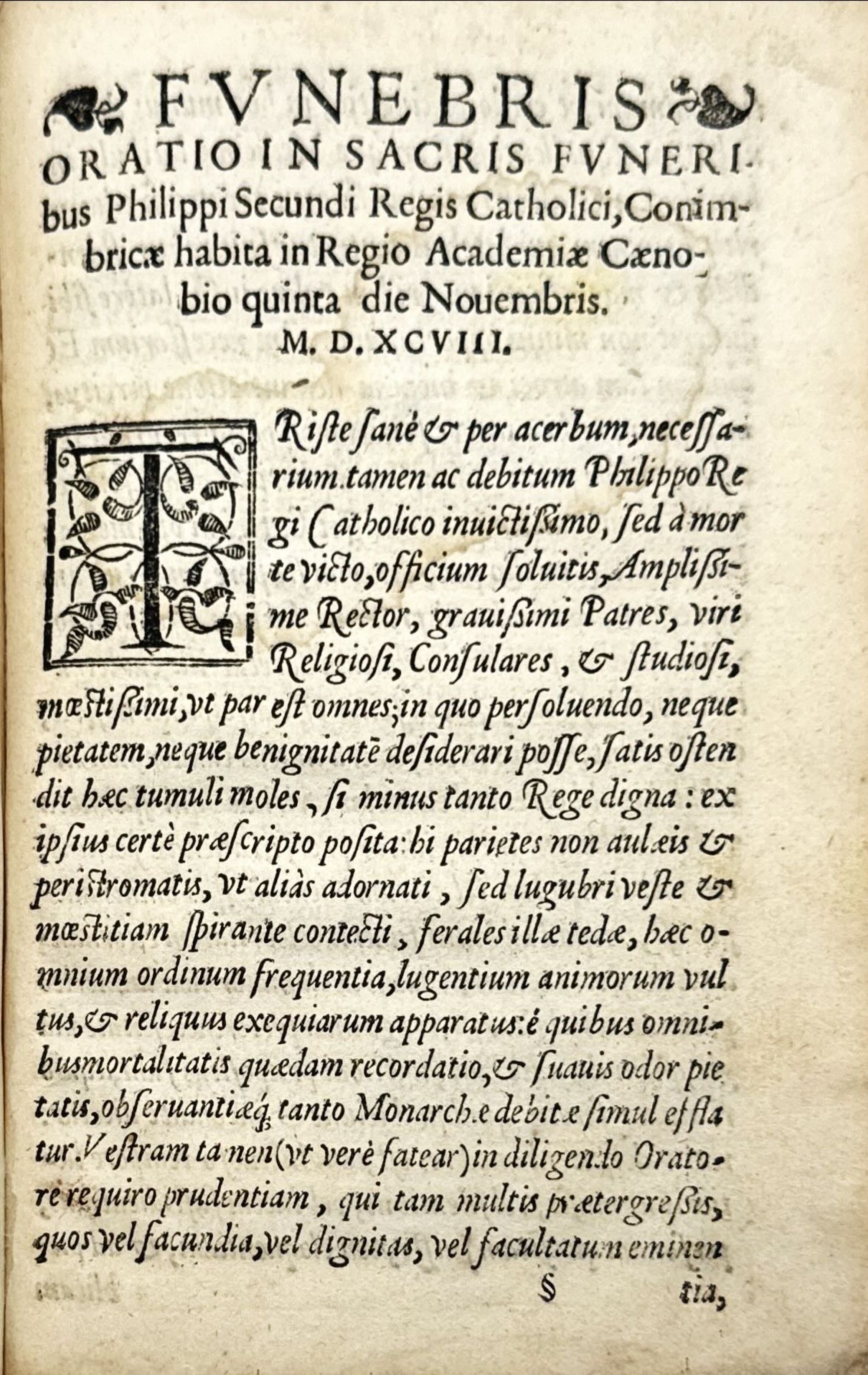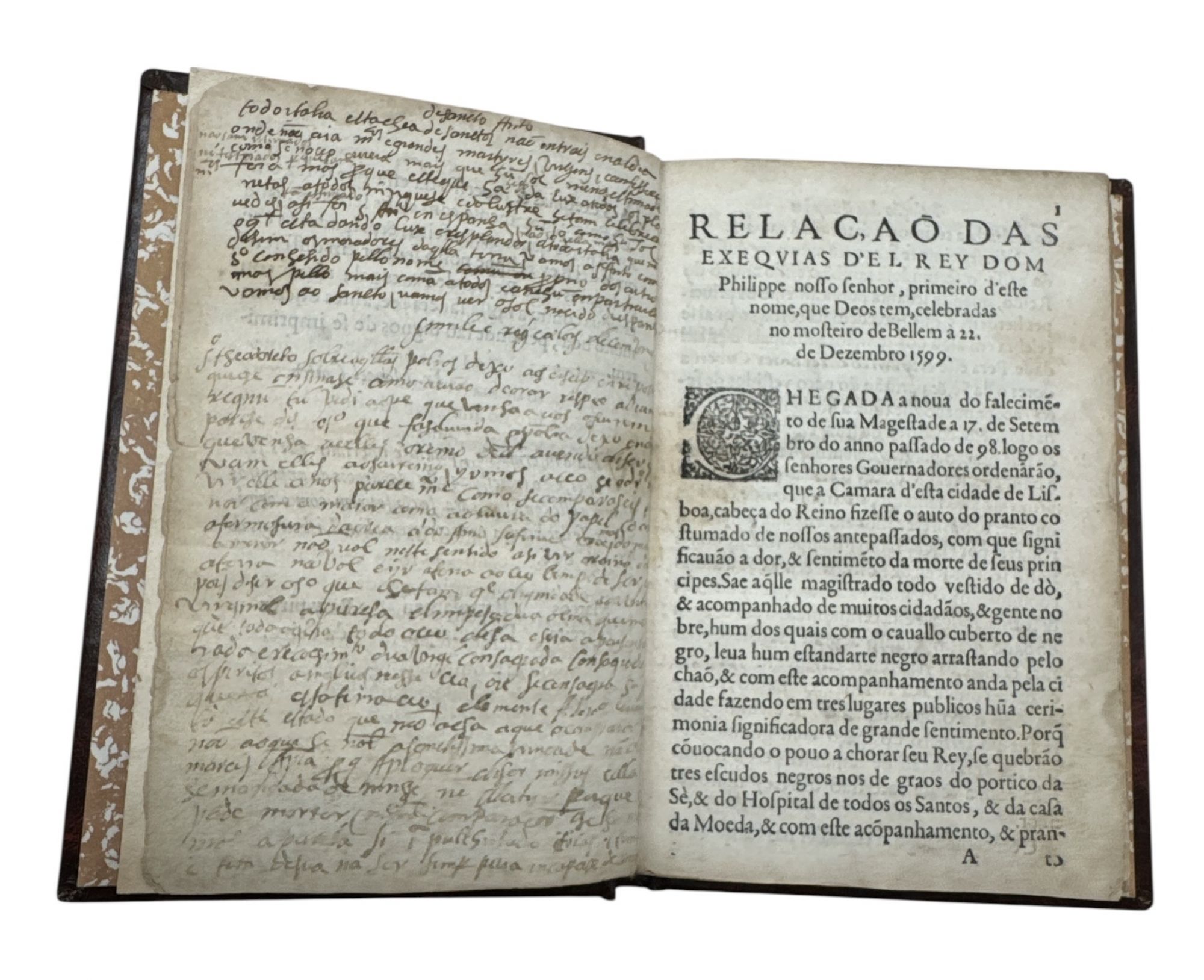 Rara. Obra que contém a descrição das cerimónias públicas de dor e luto pelo Rei Filipe I de Portugal (II de Espanha) pelos governadores em Lisboa; e as cerimónias de aclamação pelos Reis d'Armas do novo monarca Filipe II de Portugal (III de Espanha); seguem-se as pregações nas exéquias pelo Padre Fr. Manoel Coelho da Ordem de São Domingos; a oração do Padre Frei João Aranha em Santarém; o sermão do Doutor Gabriel da Costa, Chantre doutoral da Sé de Coimbra; e a oração fúnebre dita na Academia Real pelo Doutor Baltazar de Azeredo. Esta oração fúnebre com falta de uma folha (S4). Anotações da época nas margens de algumas folhas e nas folhas de guarda. Exemplar com ex-libris a óleo e assinatura de posse no frontispício. Encadernação mais recente em inteira de pele.