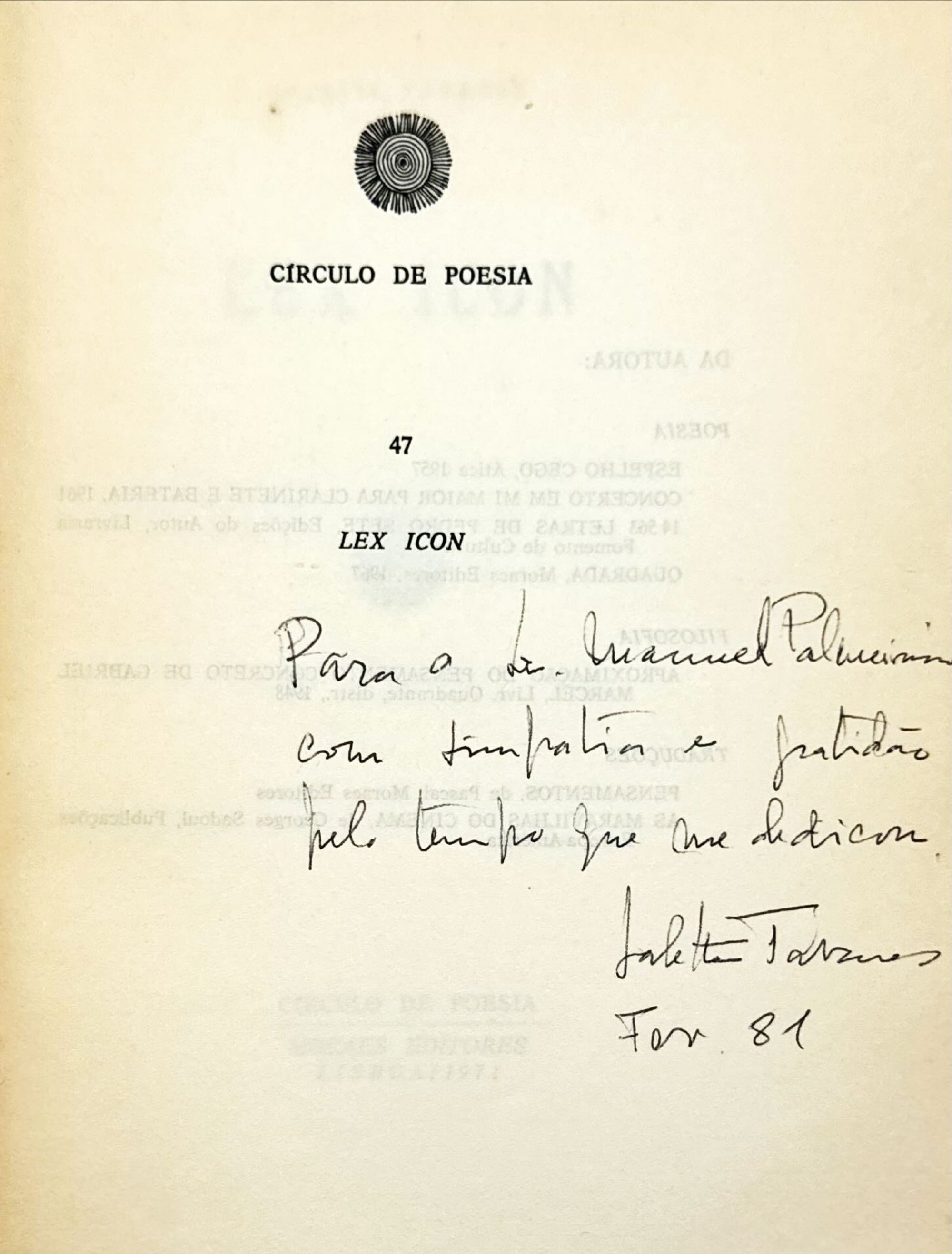 Edição original. Incluída no “Círculo de Poesia”. Valorizado com dedicatória autografa da autora.