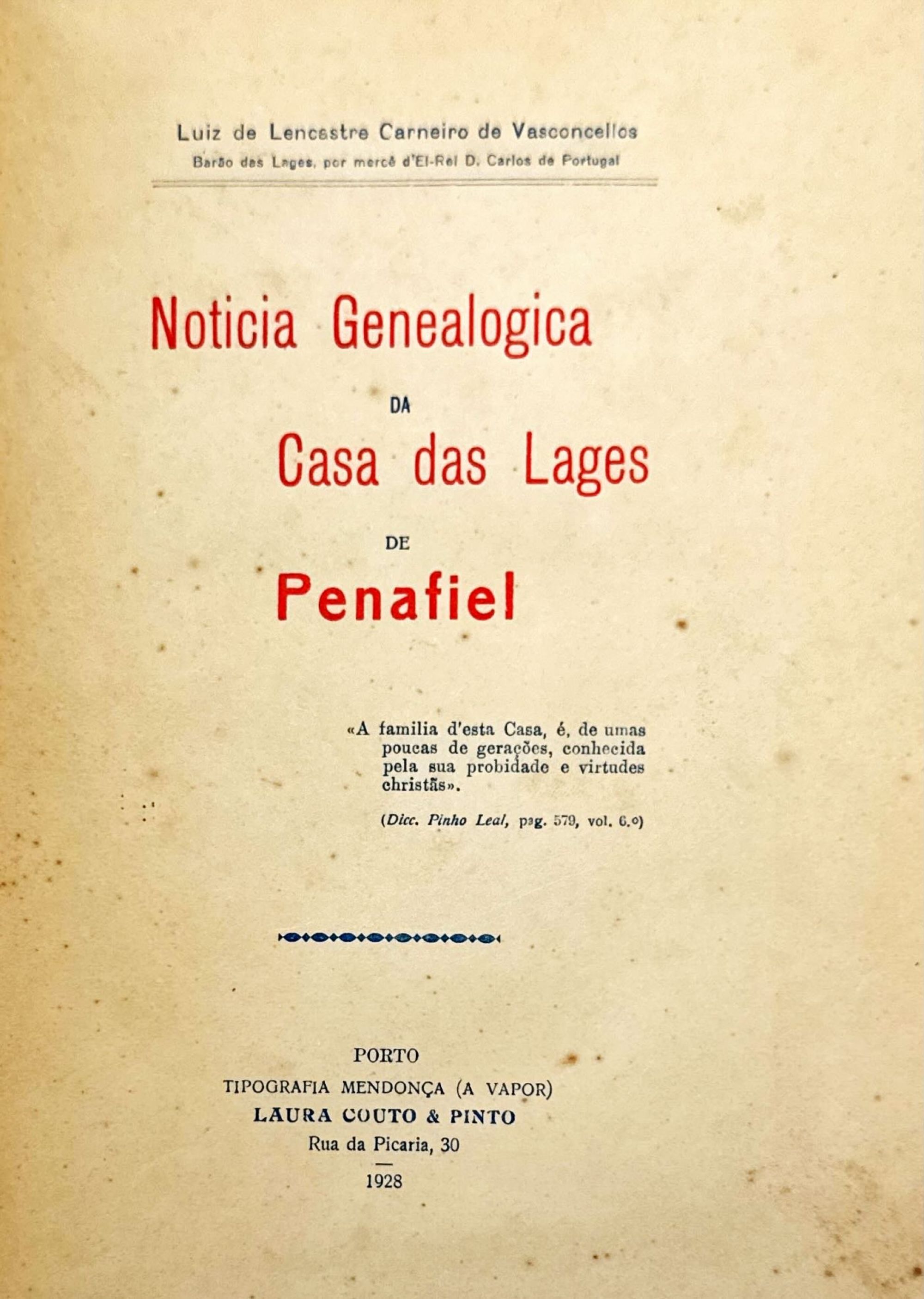 VASCONCELLOS, Luiz de Lencastre Carneiro de (Barão das Lages). - NOTICIA GENEALOGICA DA CASA DAS LAGES DE PENAFIEL. Porto. Tipografia Mendonça. 1928. In-8º de 76 págs. Enc.