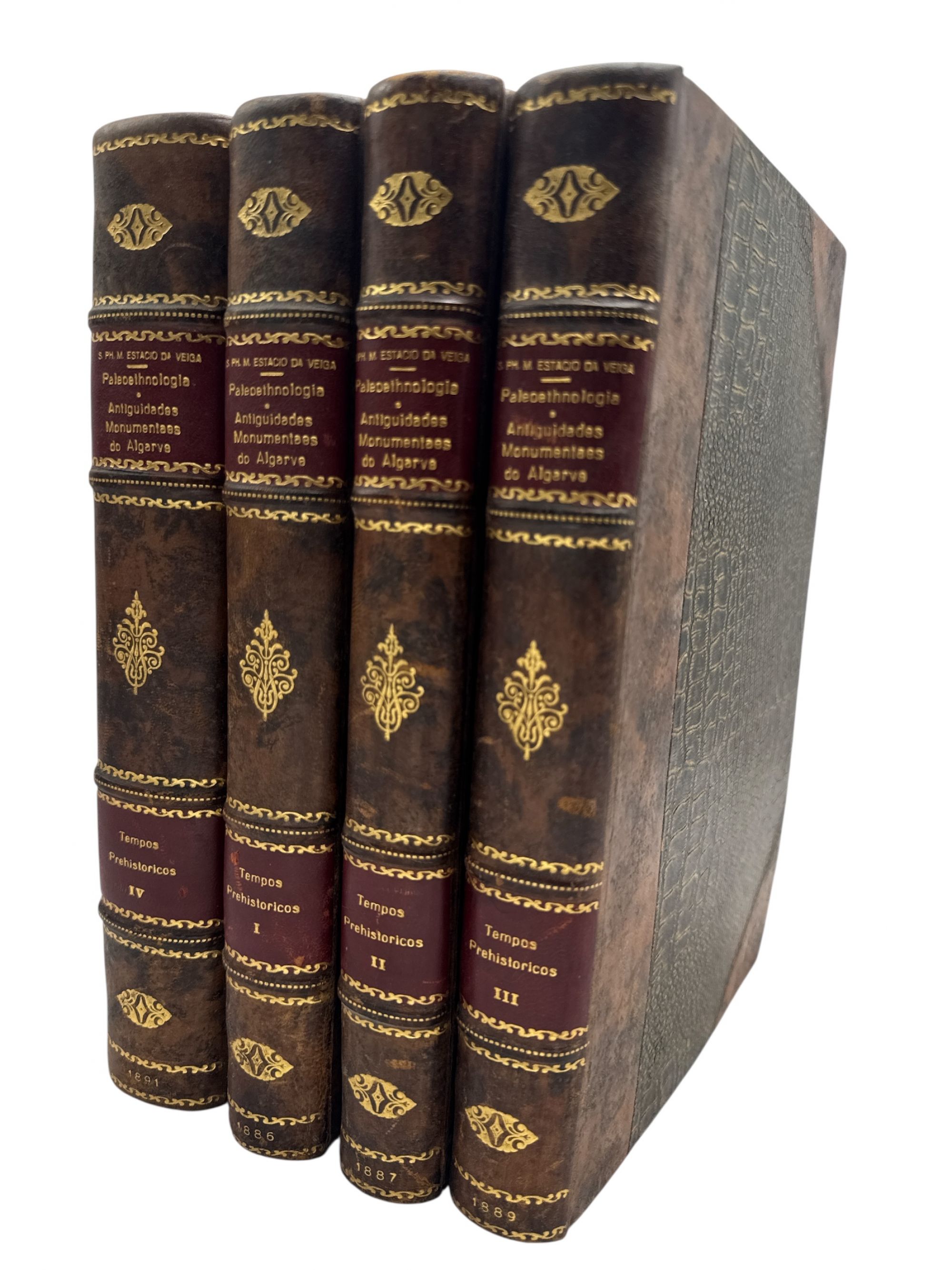 VEIGA, Sebastião Philippes Martins Estacio da. - PALEOETHNOLOGIA. ANTIGUIDADES MONUMENTAIS DO ALGARVE. Tempos prehistoricos. Volume I (ao IV). Lisboa. Imprensa Nacional. 1886 (a 1891). 4 Vols. In-8º Encs.