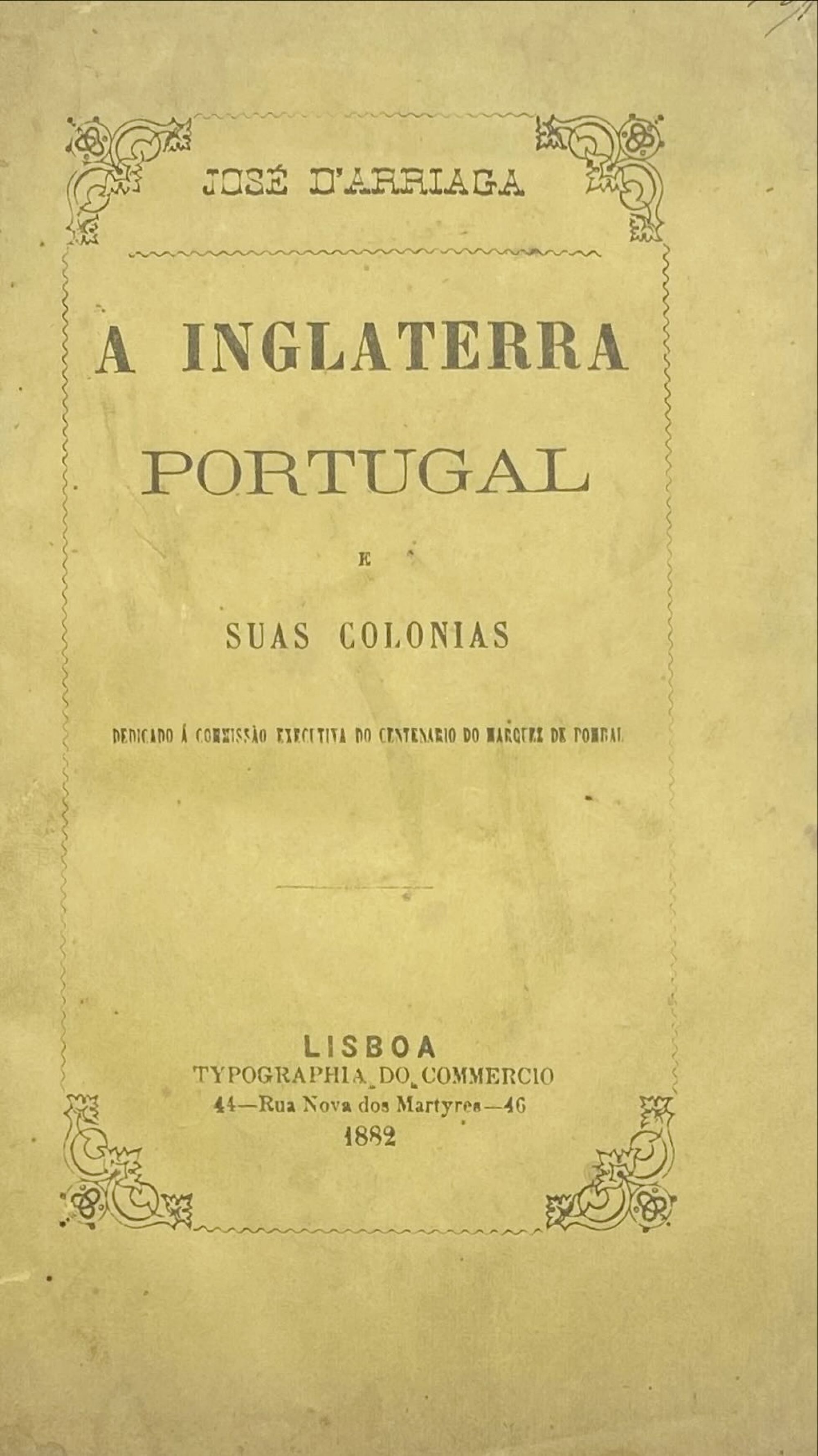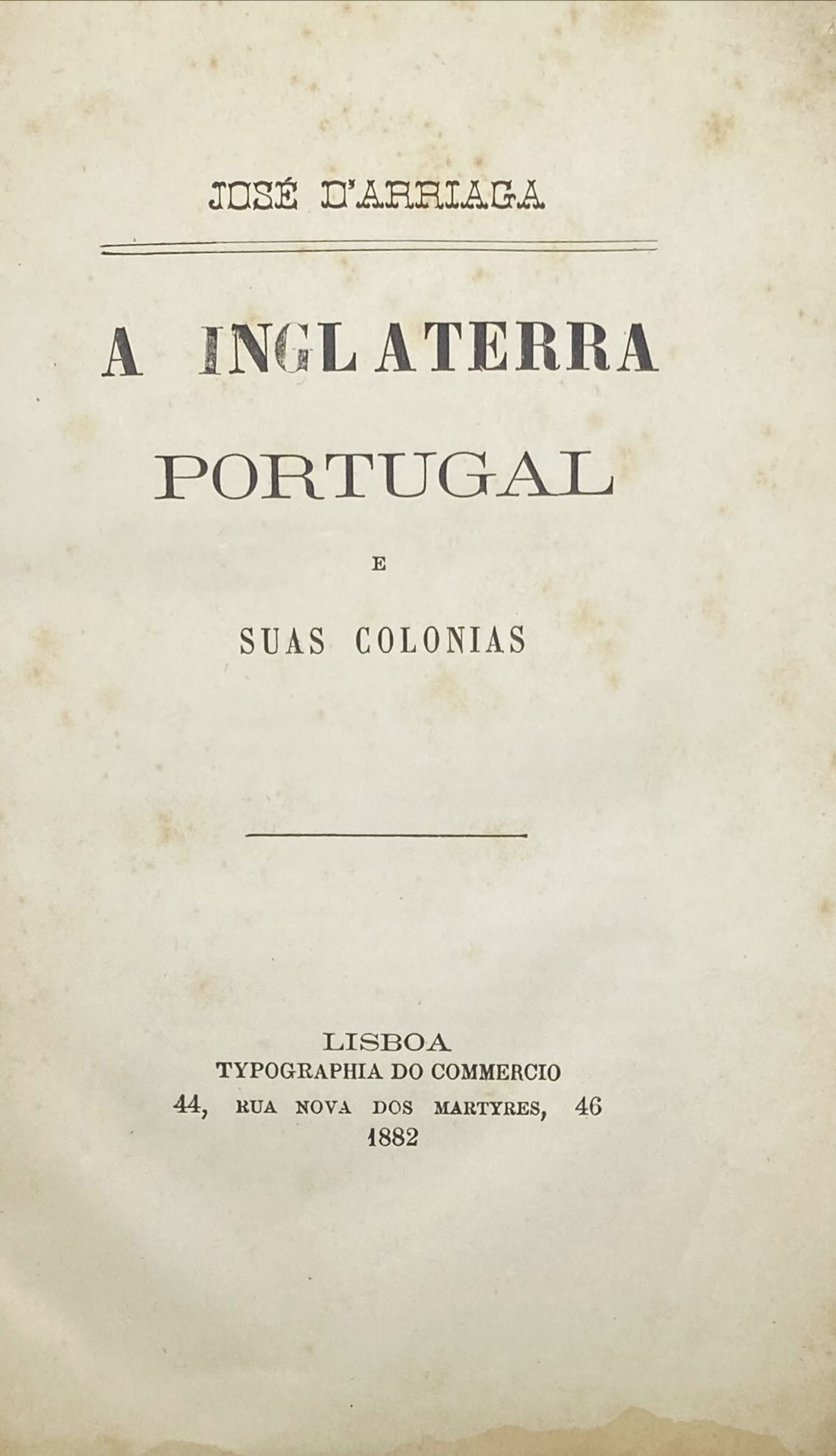ARRIAGA, José d'. - A INGLATERRA PORTUGAL E AS SUAS COLONIAS. Lisboa. Typographia do Commercio. 1882. In-8º de [4], IV, 331, [2] págs. Enc.