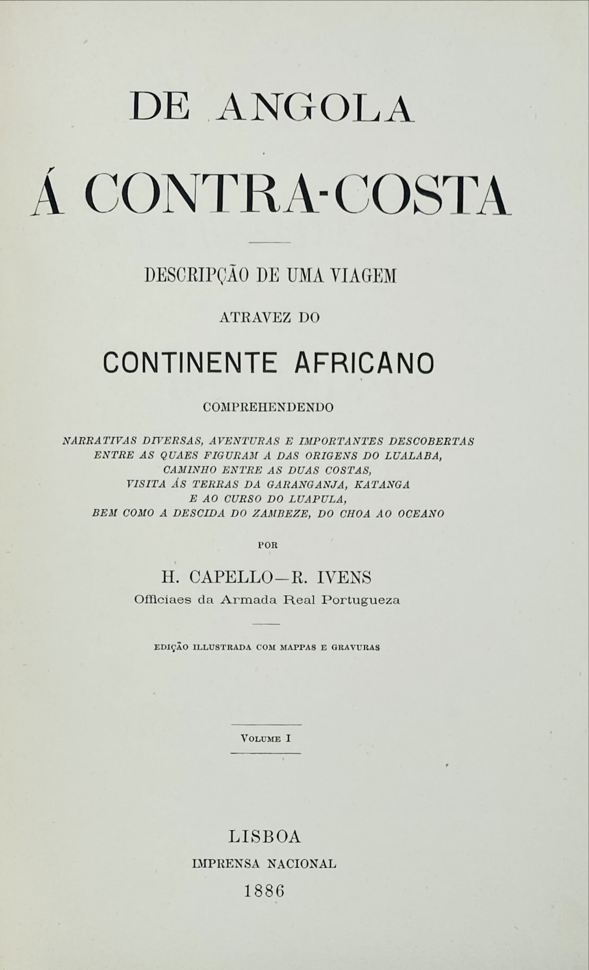CAPELLO E R. IVENS, H. - DE ANGOLA Á CONTRA-COSTA. Descrição de uma viagem através do Continente Africano. Volume I (e Volume II). Lisboa. Imprensa Nacional. 1886. 2 Vols. In-8º Encs.