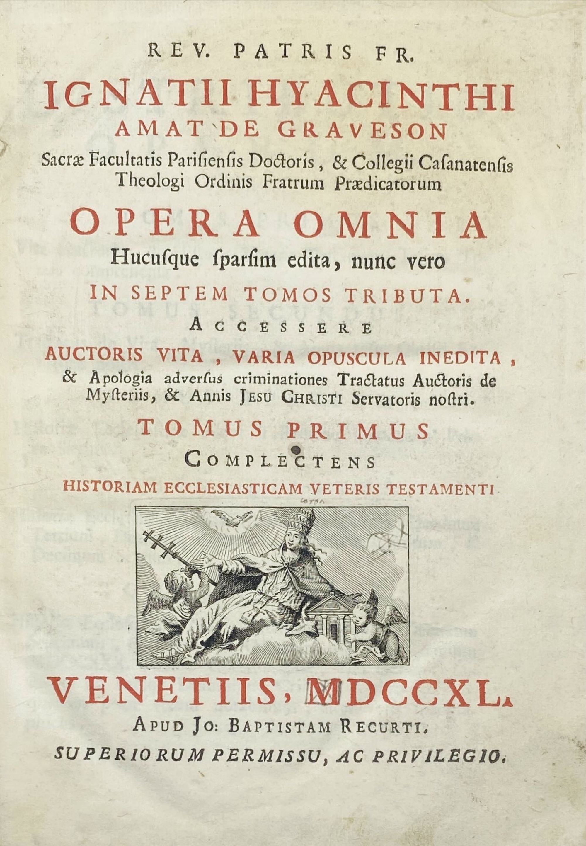 GRAVESON, Ignatii Hyacinthi Amat de. - OPERA OMNIA, hucusque sparsim edita, nunc vero in septem tomos tributa. Accessere auctoris vita, varia opuscula inedita, & Apologia adversus criminationes Tractatus Auctoris de mysteriis, & Annis Jesu Christi Servatoris nostri. Venetiis. Apud Baptistam Recurti. 1740. 7 Vols. In-4º Encs.