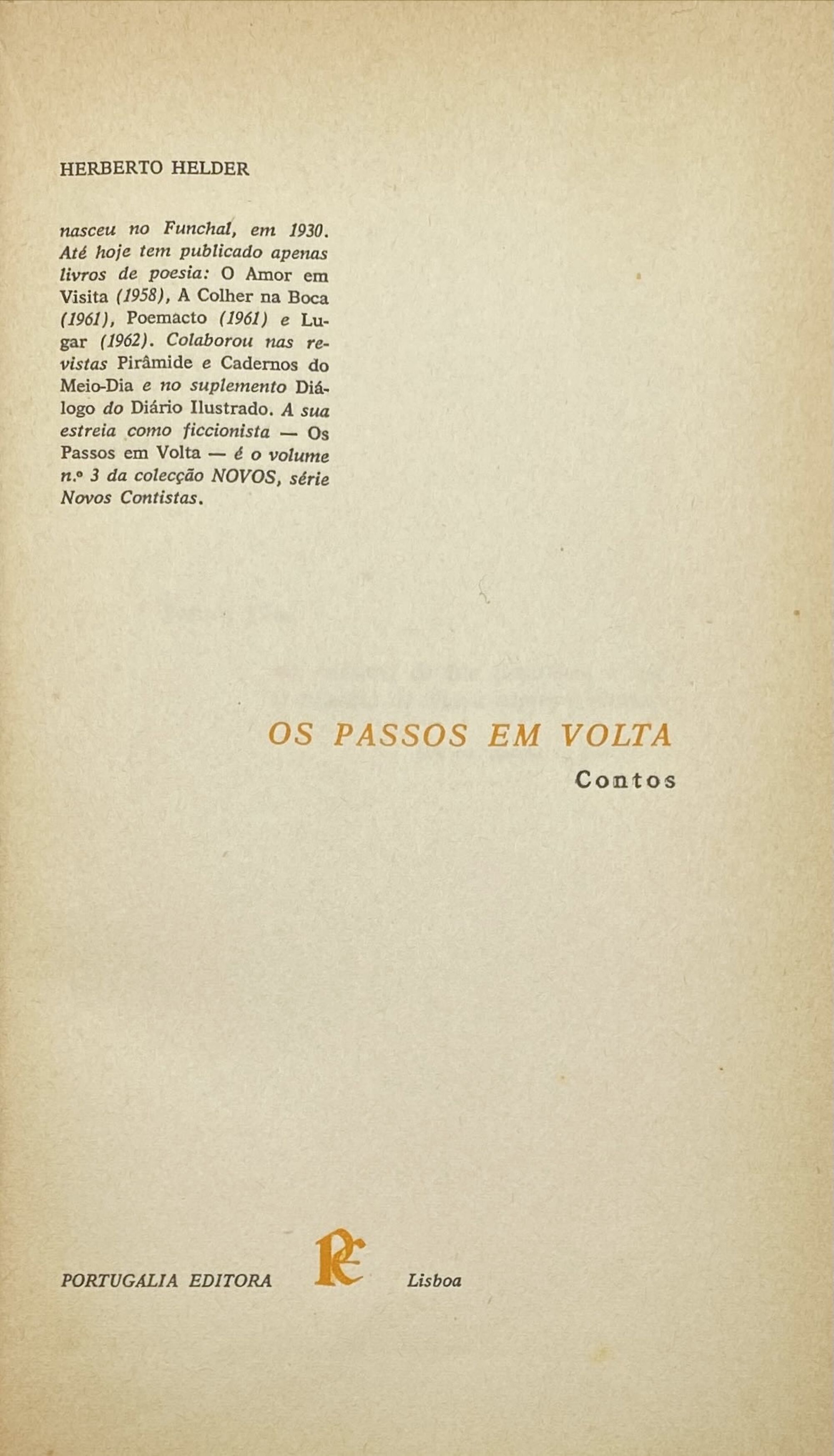 HELDER, Herberto. - OS PASSOS EM VOLTA. Contos. Lisboa. Portugália Editora. 1963. In-8º de 160, [2] págs. Br.
