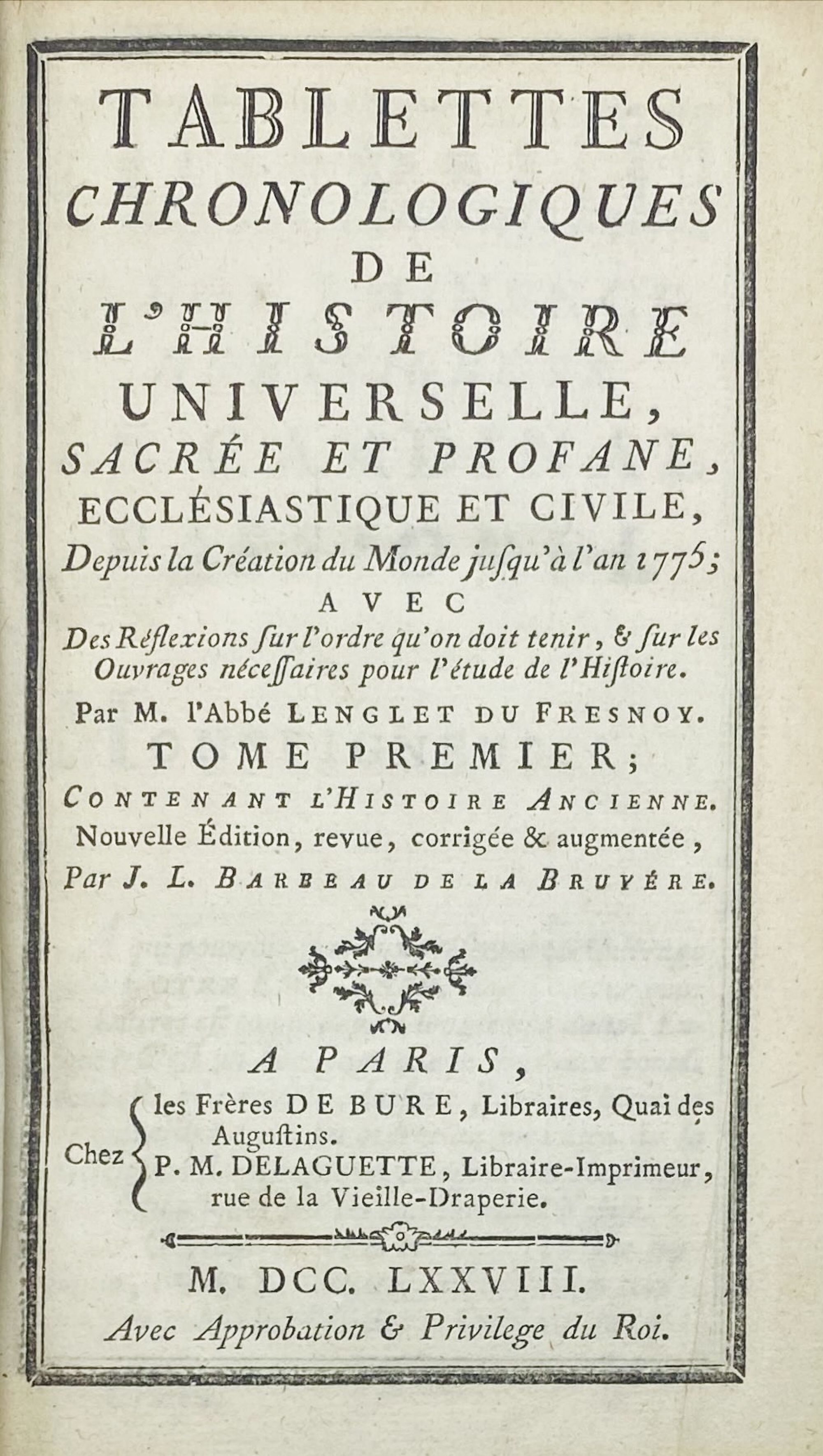 LENGLET DU FRESNOY, Abbé. - TABLETTES CHRONOLOGIQUES de l'histoire universelle, sacrée et profane, ecclésiastique et civile, depuis la création du Monde jusqu'à l'an 1775 avec des réflexions sur l'ordre qu'on doit tenir, & sur les Ouvrages nécessaires pour l'étude de l'Histoire. Tome I (e II).