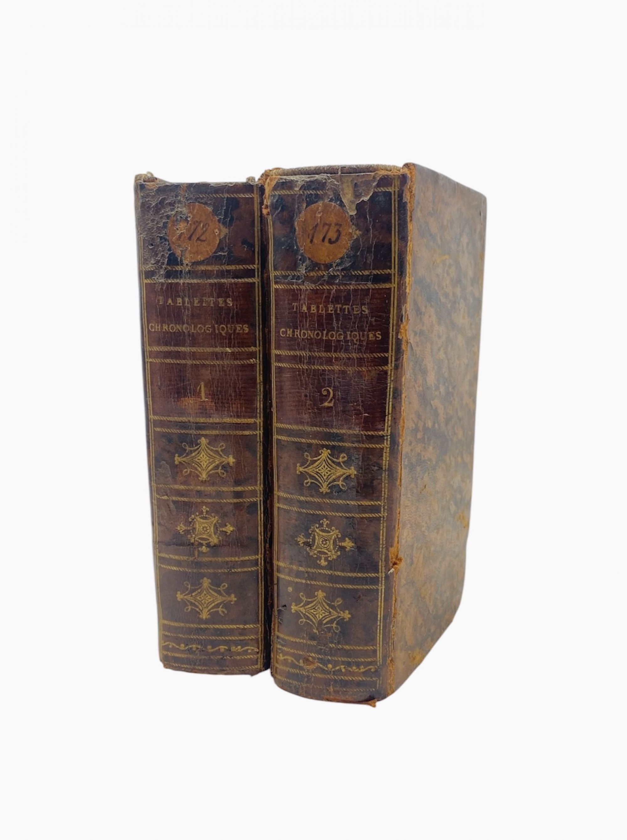 Trabalho cronológicos da história universal sagrada e profana, eclesiástica e civil, desde a criação do mundo até 1775, com reflexões sobre a ordem a ser realizada, e sobre as obras necessárias para o estudo da história. Bem conservados. Encadernações da época inteiras de pele.