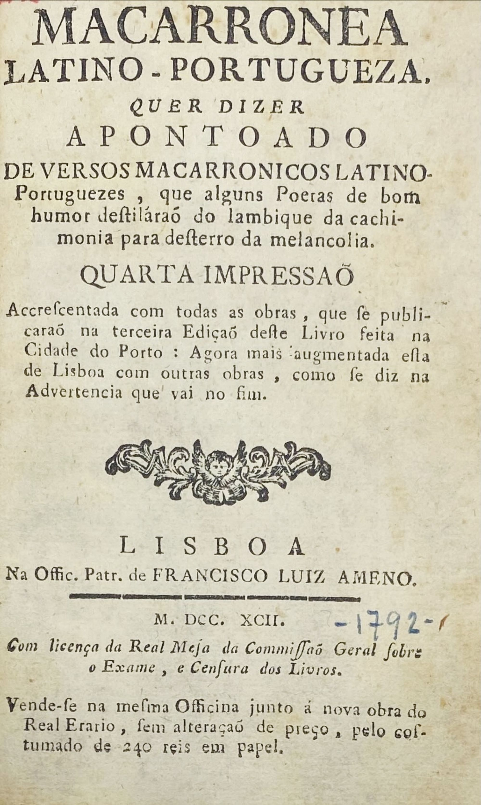 MACARRONEA LATINO-PORTUGUEZA. QUER DIZER APONTOADO de versos macarronicos latino-Portuguezes, que alguns Poetas de bom humor destilárão do lambique da cachimonia para desterro da melancolia. Lisboa. Offic. Patr. de Francisco Luís Ameno. 1792. In-8º de 235, [4], 112, 7 págs. Enc.