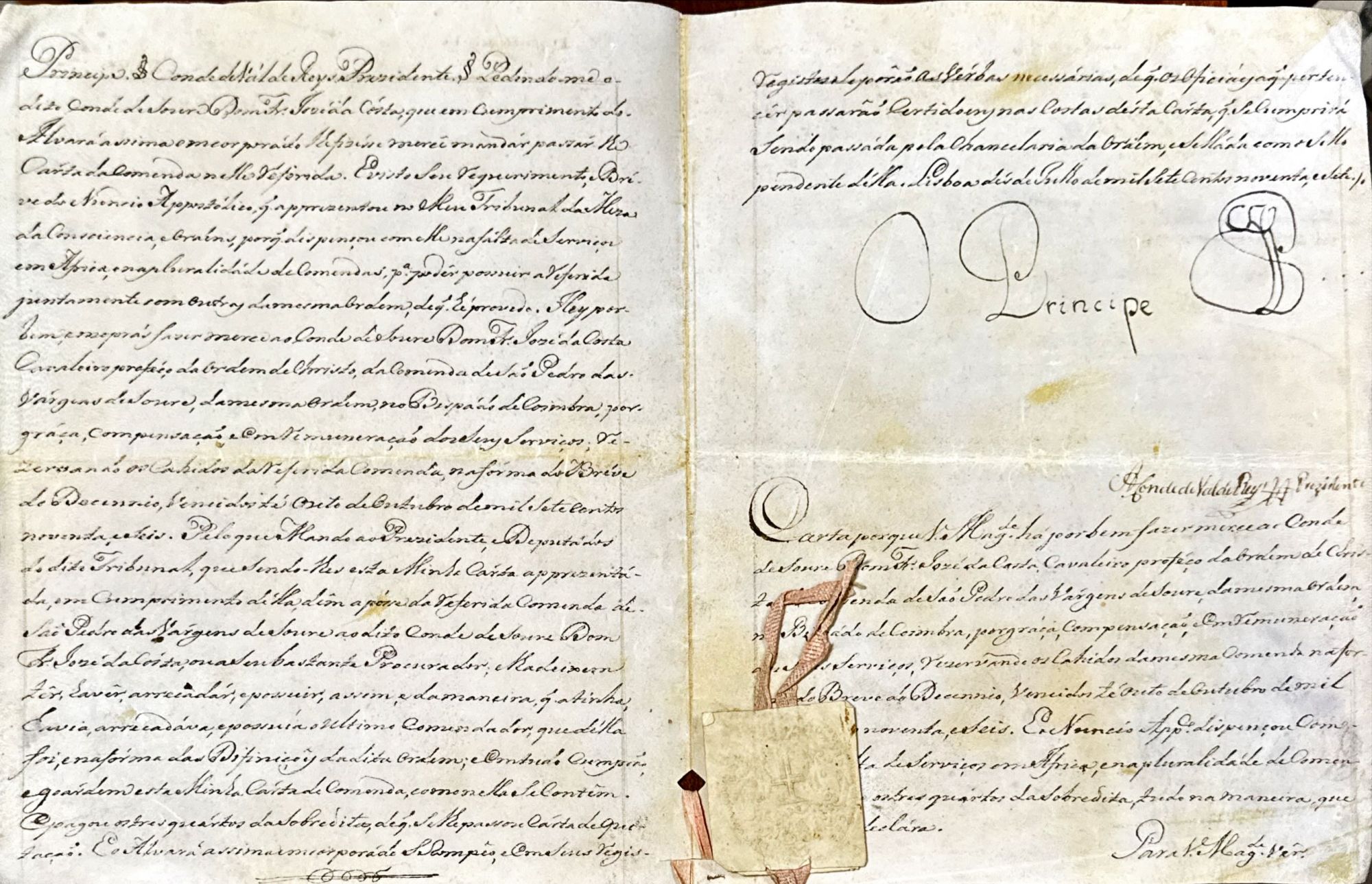 Manuscrito em pergaminho, assinado pelo Príncipe Regente D. João e pelo Conde de Vale de Reis. Com selo pendente branco.