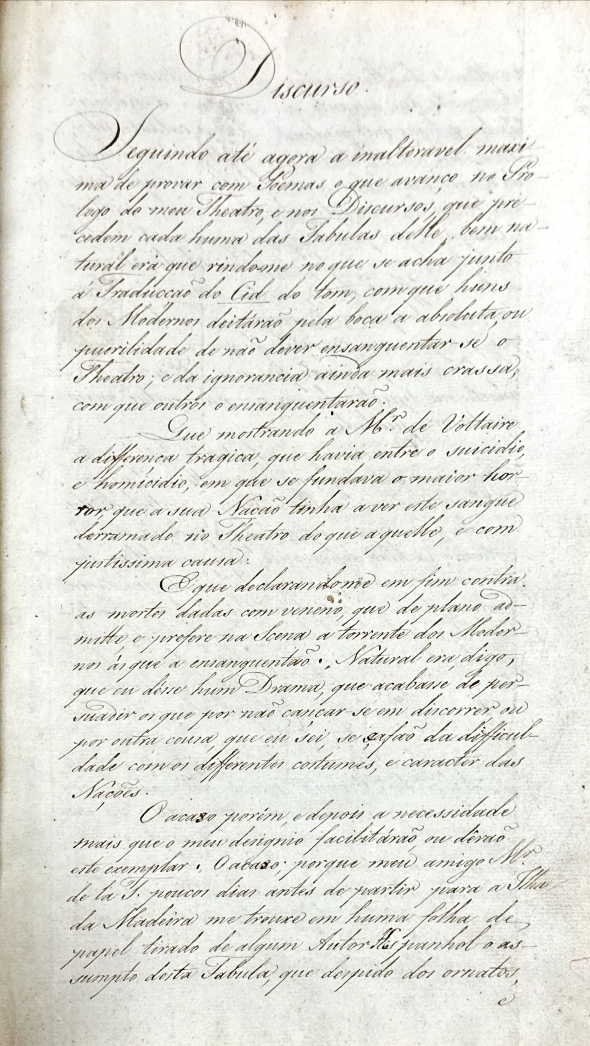 Manuscrito do célebre dramaturgo Manuel de Figueiredo, apresentado á comissão de censura em 24 de julho de 1805, e autorizado pelos censores Amaral, Francisco Xavier de Oliveira e Fr. Mariano da Conceição Veloso. Inclui igualmente uma "advertência" do editor, a Impressão Régia, a propósito de uma peça sem título, cuja ação se passa em Elvas. Esta obra foi impressa em 1805, sendo o tomo 10 de Teatro de Manuel de Figueiredo. Manuscrito bem conservado e de caligrafia legível.